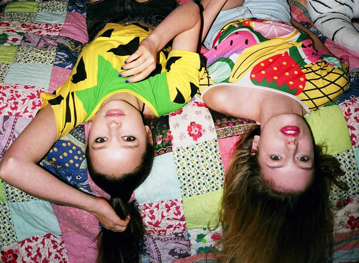 Hannah wears the Pineapple Crop T-shirt and Louise wears the Mixed Fruit Crop T-shirt.