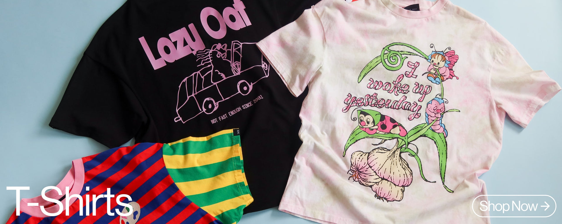 Our collections feature bold colours and graphic prints and include season-ready t-shirts, jumpers with unique graphics and illustrations, jackets in several styles and a selection of hats. The Lazy Oaf selection of men's and women's fashion and streetwear also includes an iconic range of trousers, skirts, dresses, shoes, shirts, shorts and accessories. Many of our pieces turn hand-drawn ilustrations into bold prints, with a collection of products that are unique, fun, and imbued with the Lazy Oaf sense of style.