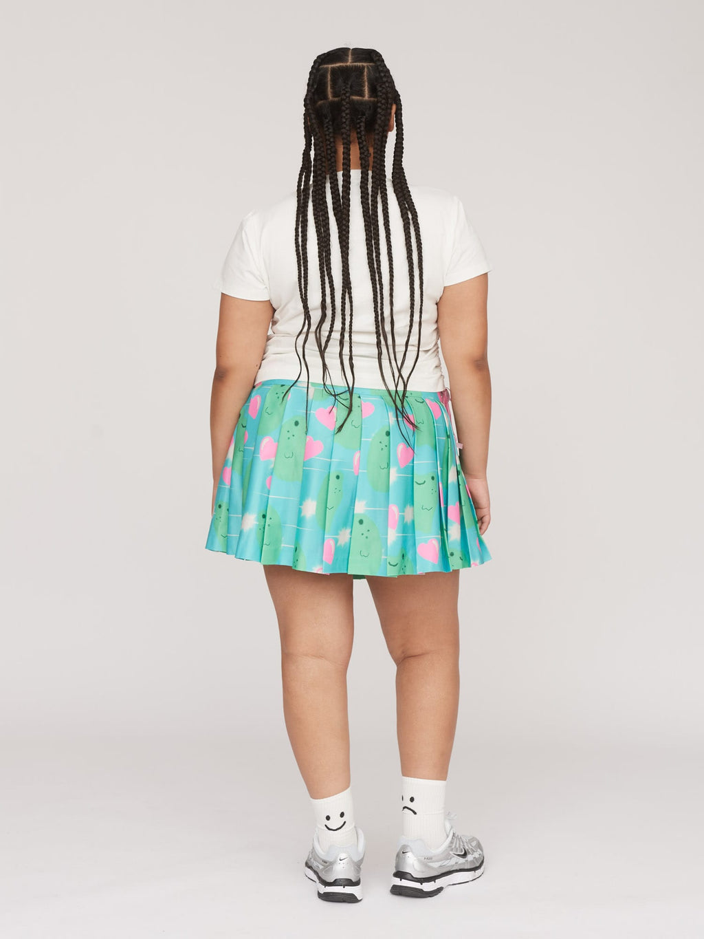 Our mini skirt has a deep waistband with an invisible zipper and double button fastening that goes into a pleated skirt. It has an all over print, created in house at Oaf HQ, with varying placement from garment to garment. Pond life is better with a buddy, so wear it with our Across the Pond Chore Jacket.
