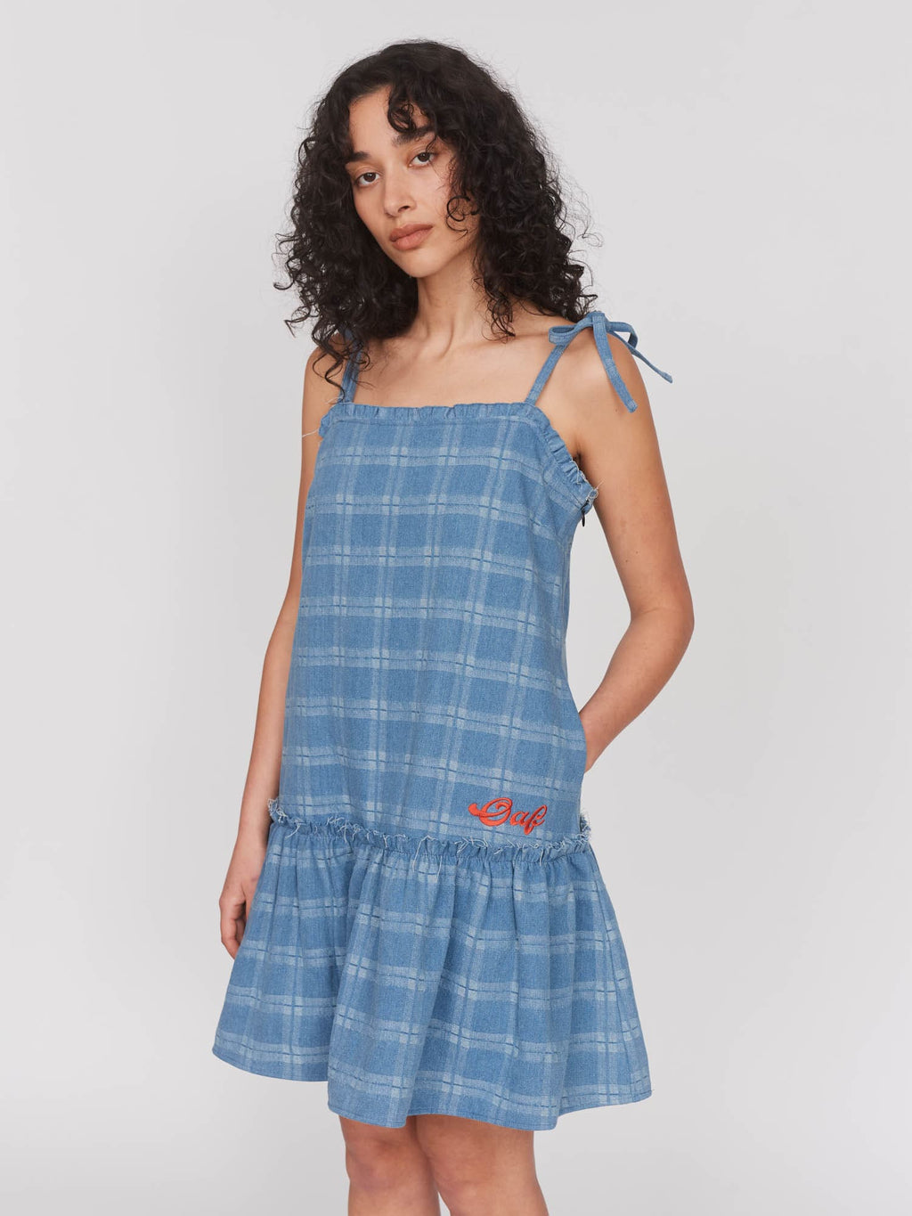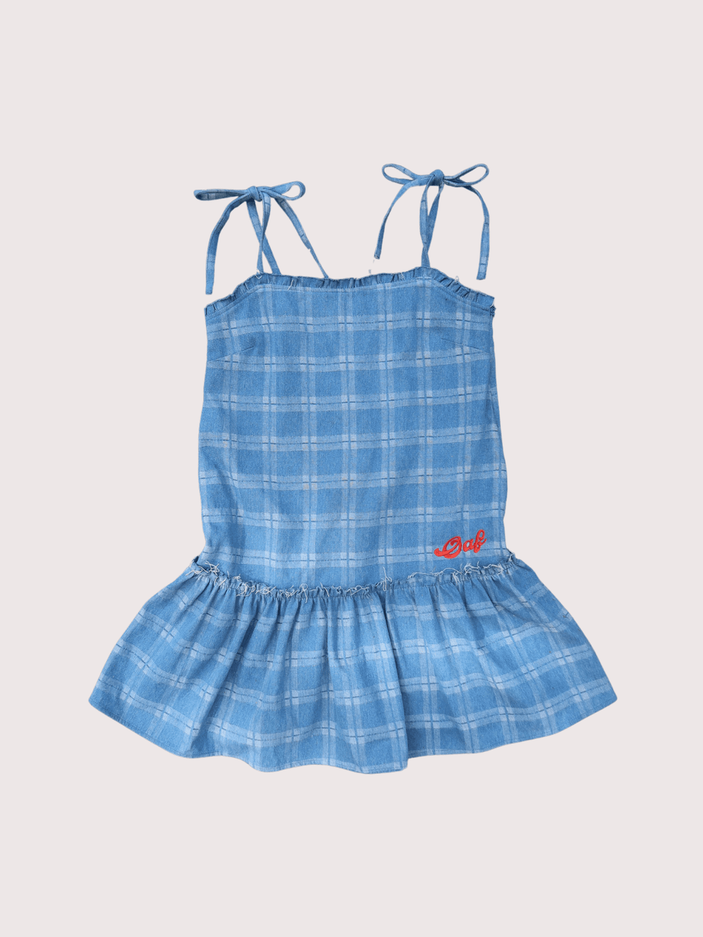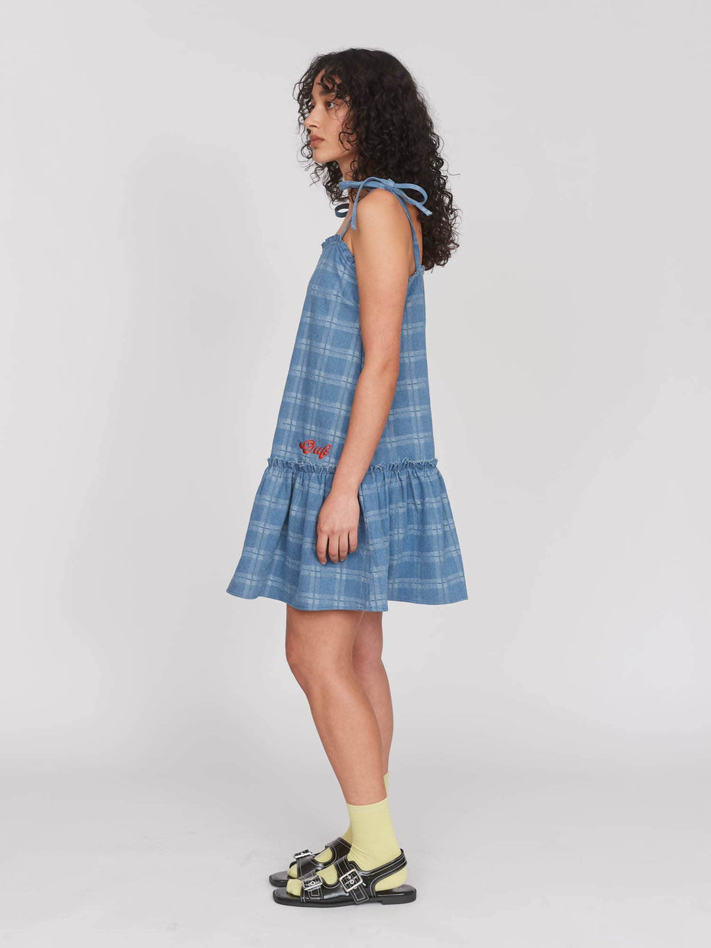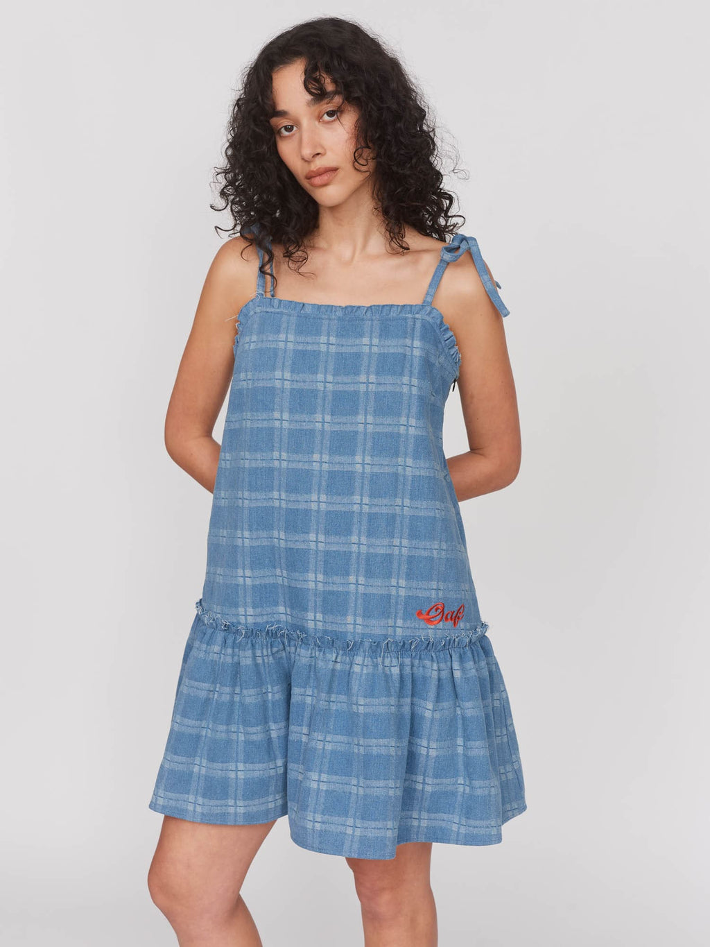 A new style for us, this drop-waist dress has an A-line shape and falls at mini length. Made from woven, check denim, it has adjustable tie shoulder straps so you can get the fit just right for you. It has ruffle detailing around the neckline and at the top of the skirt as well as an Oaf embroidery at the hip. Fastenable by a side seam zip and of course, with pockets, we guarantee you’ll be wearing this all summer long.