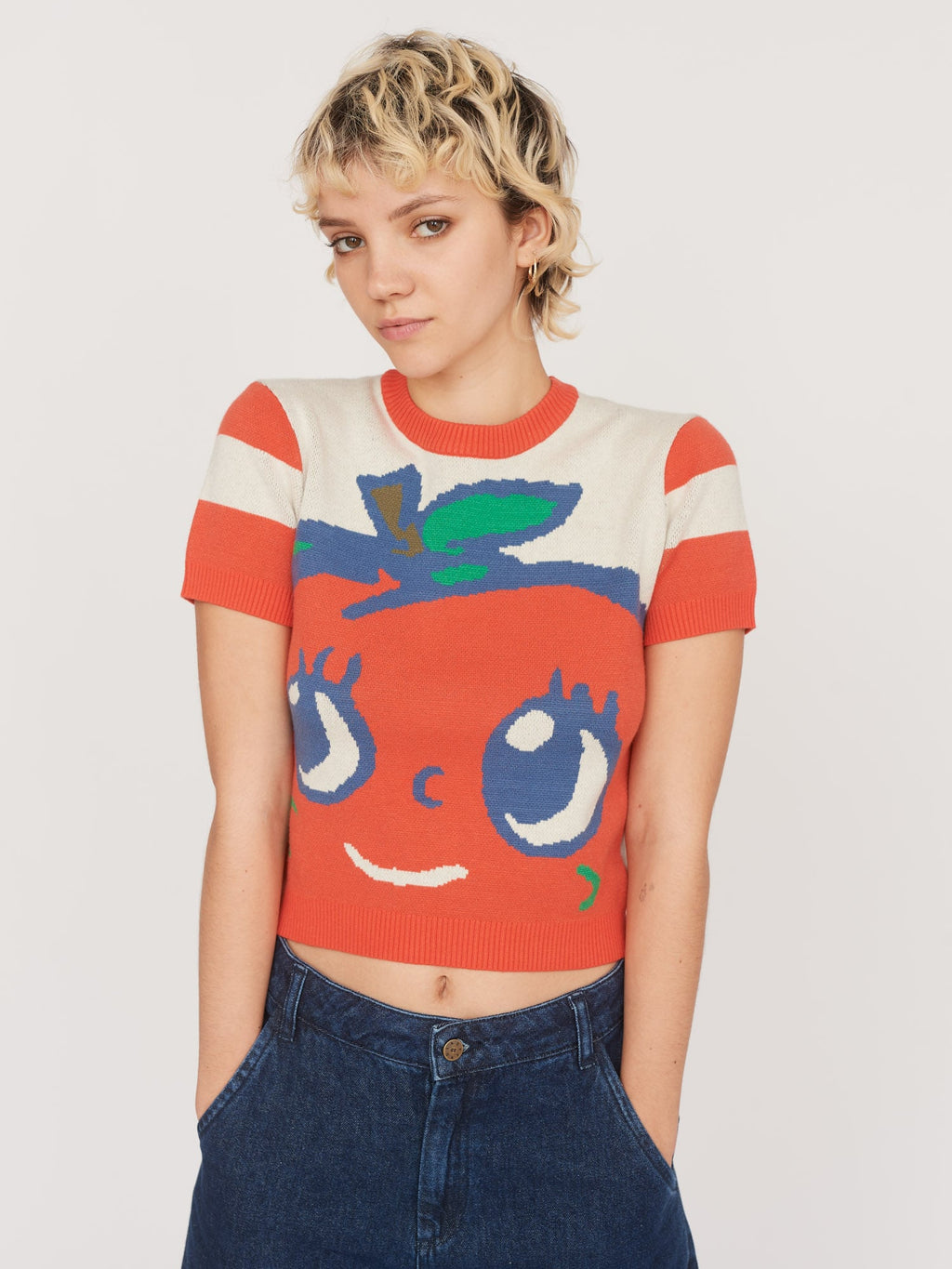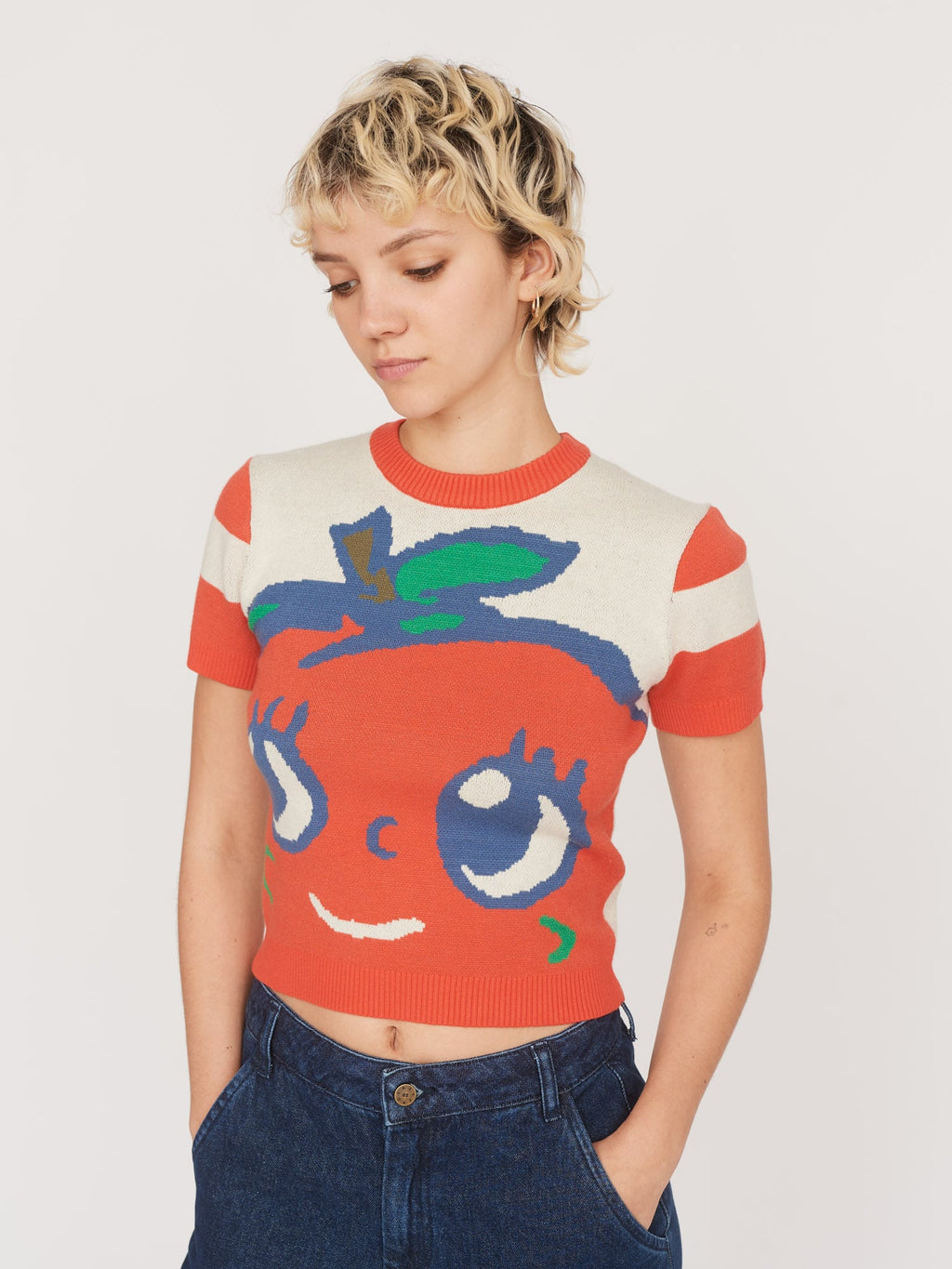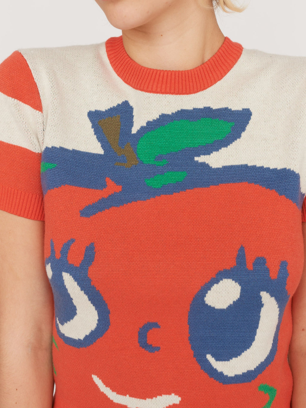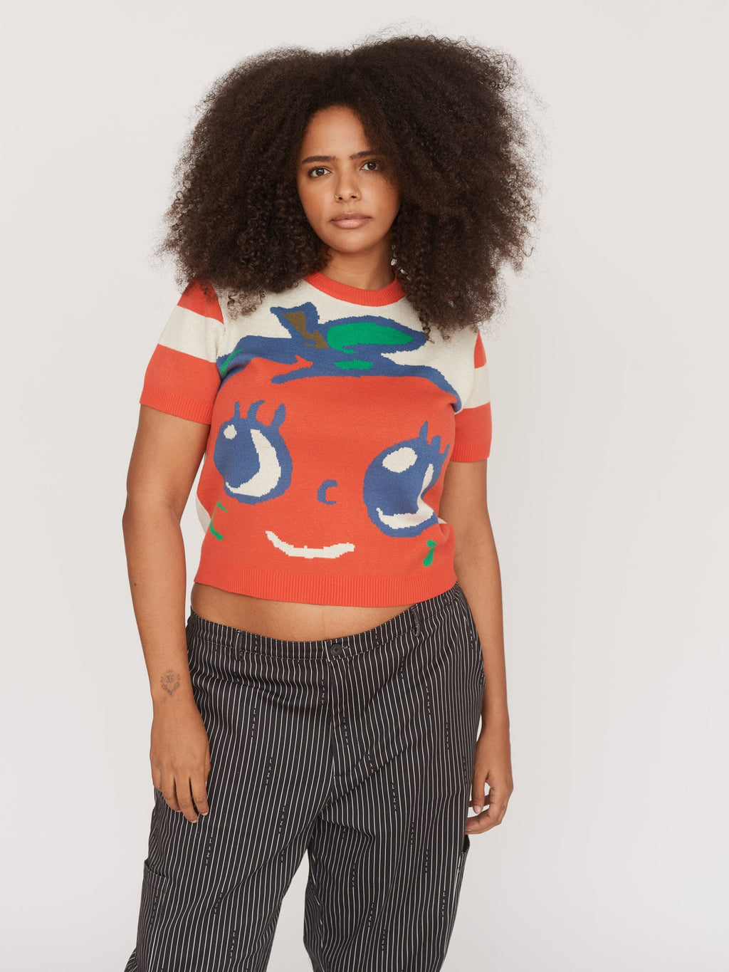 This cream fitted knit tee comes in a slightly cropped length, with a contrasting red cuffs, neck, hem and sleeve detailing. The custom intrasia happy apple graphic on the front, is designed by our in-house team. This super soft knit will be your perfect statement winter tee.