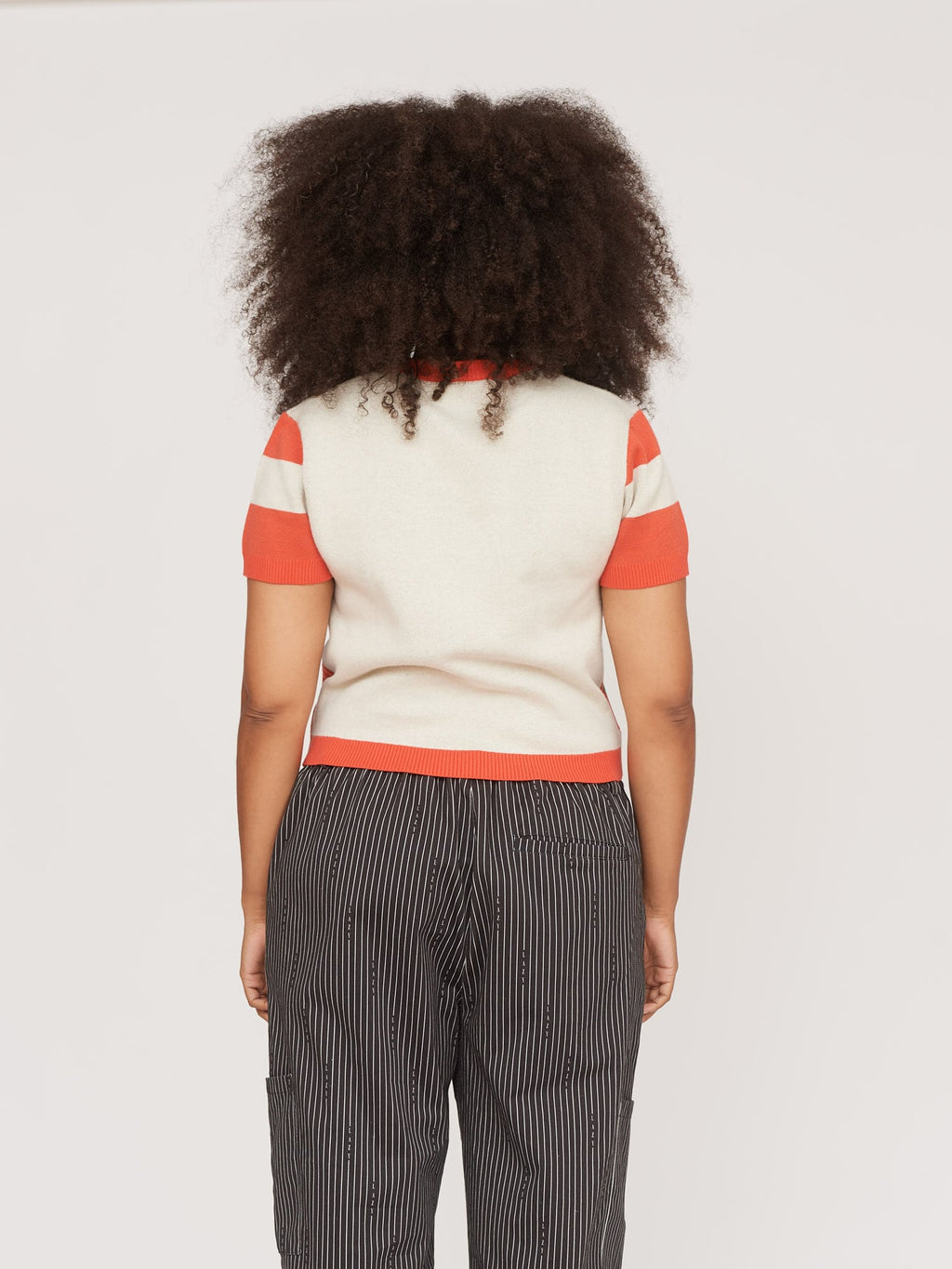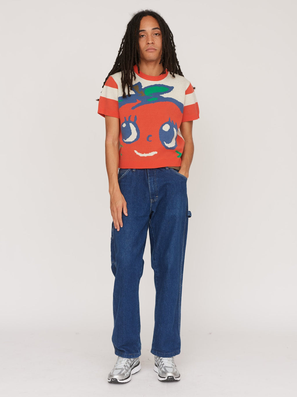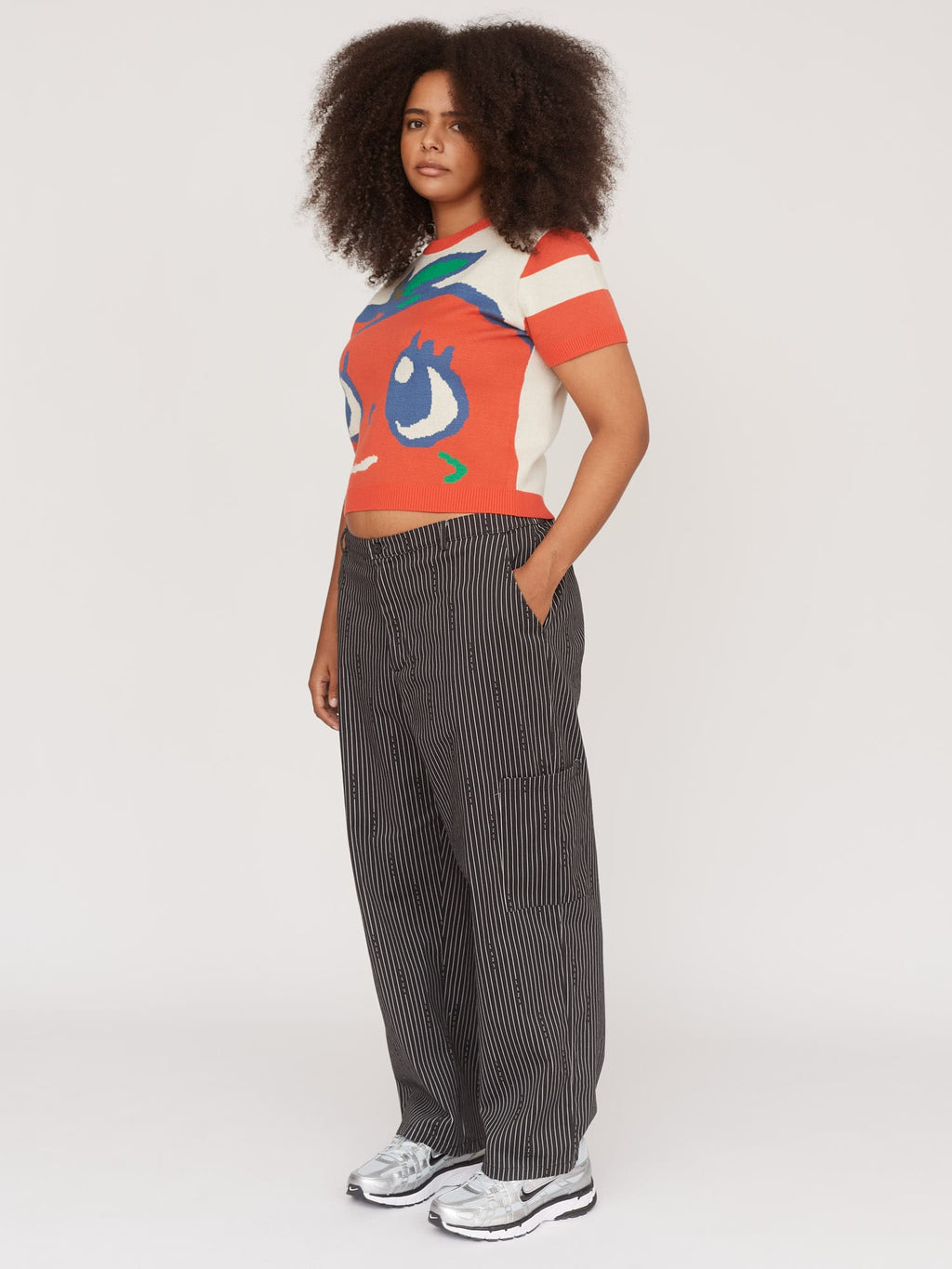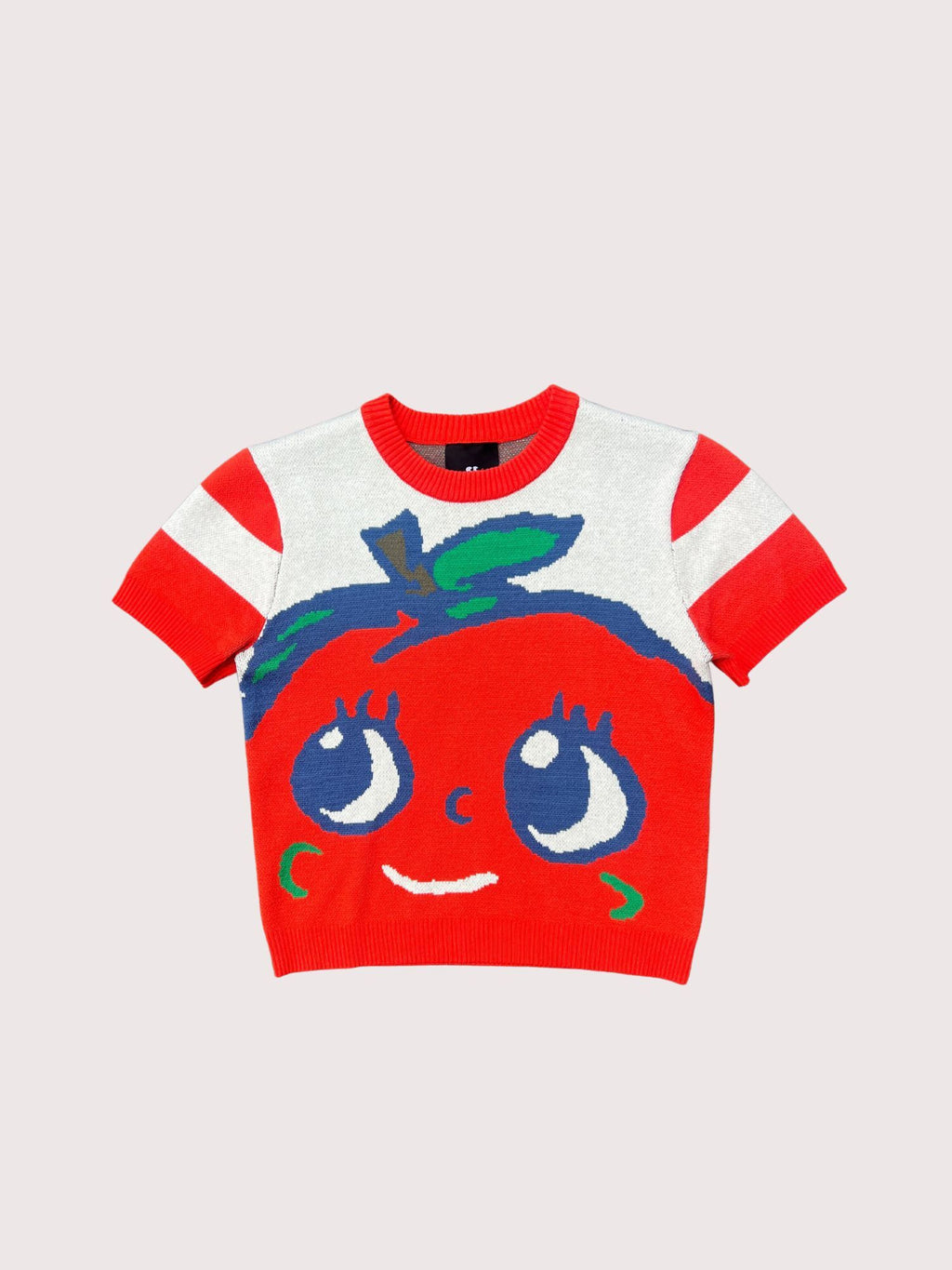 This cream fitted knit tee comes in a slightly cropped length, with a contrasting red cuffs, neck, hem and sleeve detailing. The custom intrasia happy apple graphic on the front, is designed by our in-house team. This super soft knit will be your perfect statement winter tee.