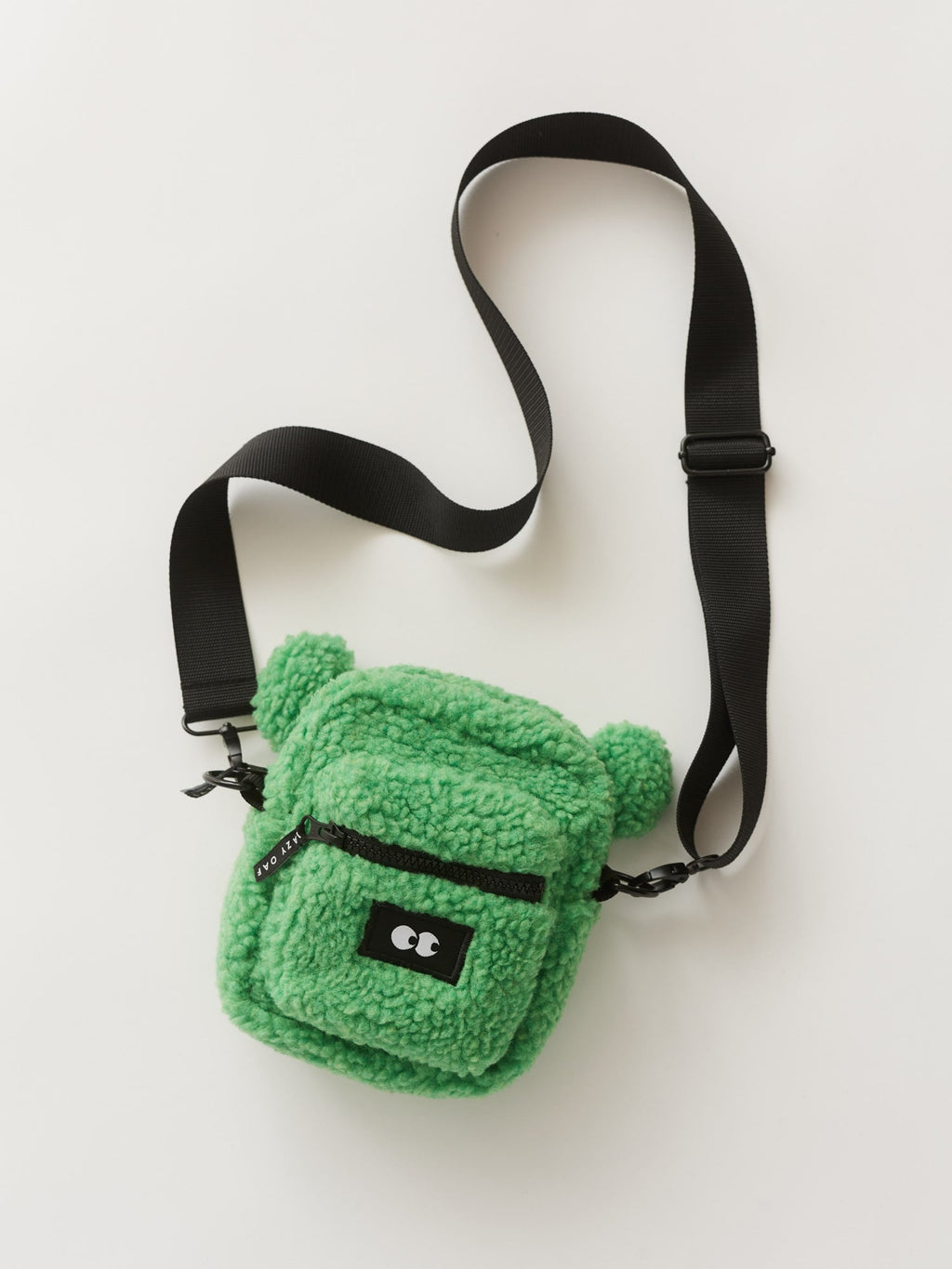 In pea green, this bag is a slightly different take on our mini bag shape, with it being greater in height than width. It has a fluffy sherpa outer, with a main compartment and a smaller front pocket. The zip closures are contrast black with woven branded pullers and the webbing strap is fully adjustable and removable.