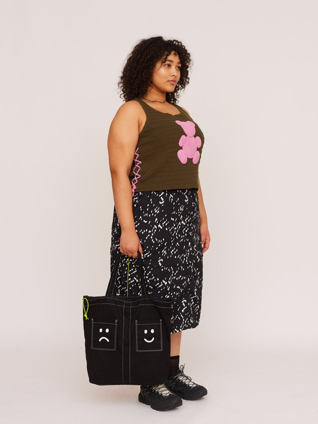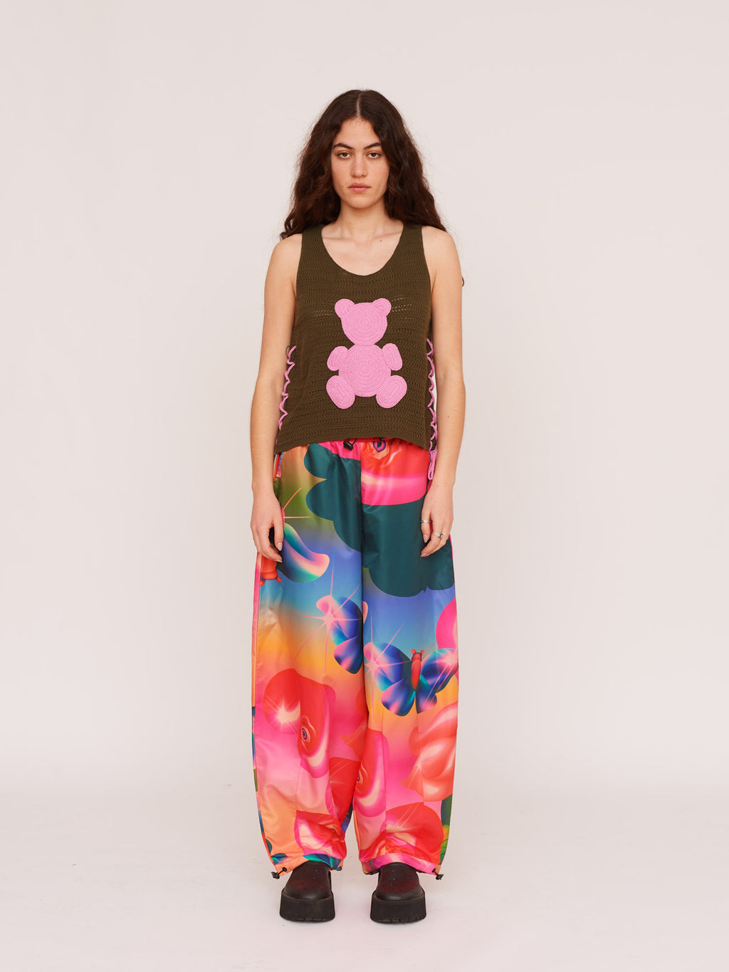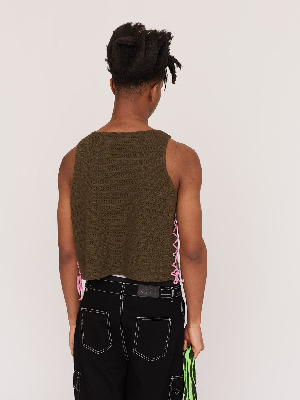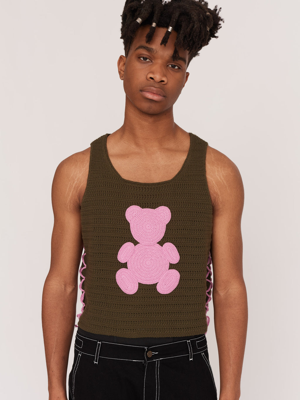 This machine crocheted top is in a close weave, with the opaque khaki body contrasted by a pink bear on the front and centre, as well as faux lace up details on either side. The top is more on the fitted style, and is slightly cropped, sitting just above the hips.