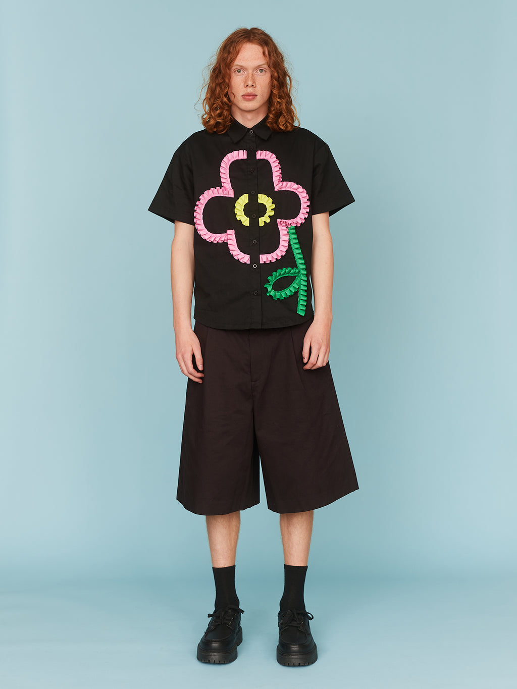 One of our bestselling motifs is ready to become a staple in your summer wardrobe. This short sleeve shirt has a button up front with back yoke and box pleat detail for an effortlessly good, yet relaxed, fit. With side slits at the hem, it features a colourful pleated grosgrain trim applique flower detail on the chest. This black shirt will pair well with all your favourite basics or why not add some more colour by pairing with our Clowning Around Bloomers?