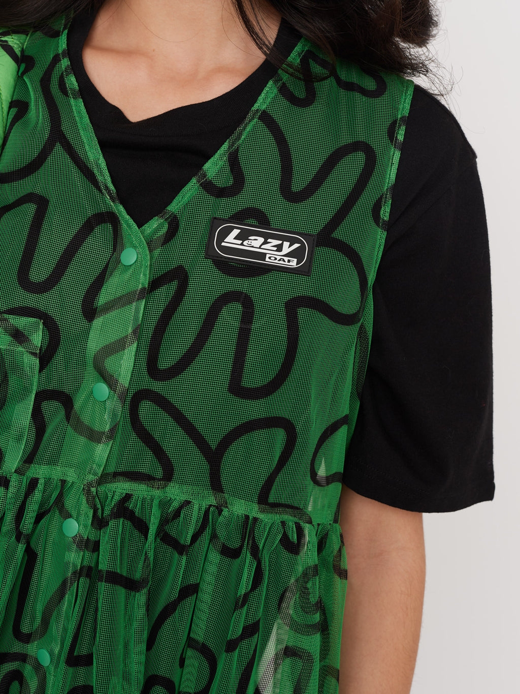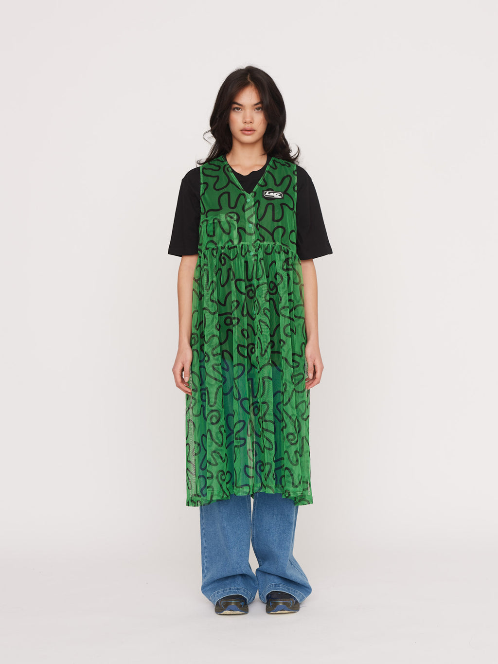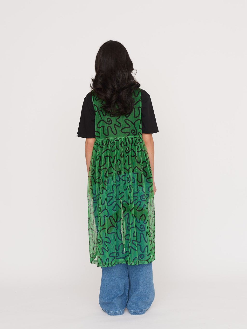 A mesh dress is a great piece to have in your wardrobe, ready to be pulled out for a layering look over jeans and a tee or a simple slip dress. This one is a structured shape in a sleeveless V neck style and an empire waist with a nice amount of volume added into the skirt. It moves really nicely, and it features an all over print designed in-house.