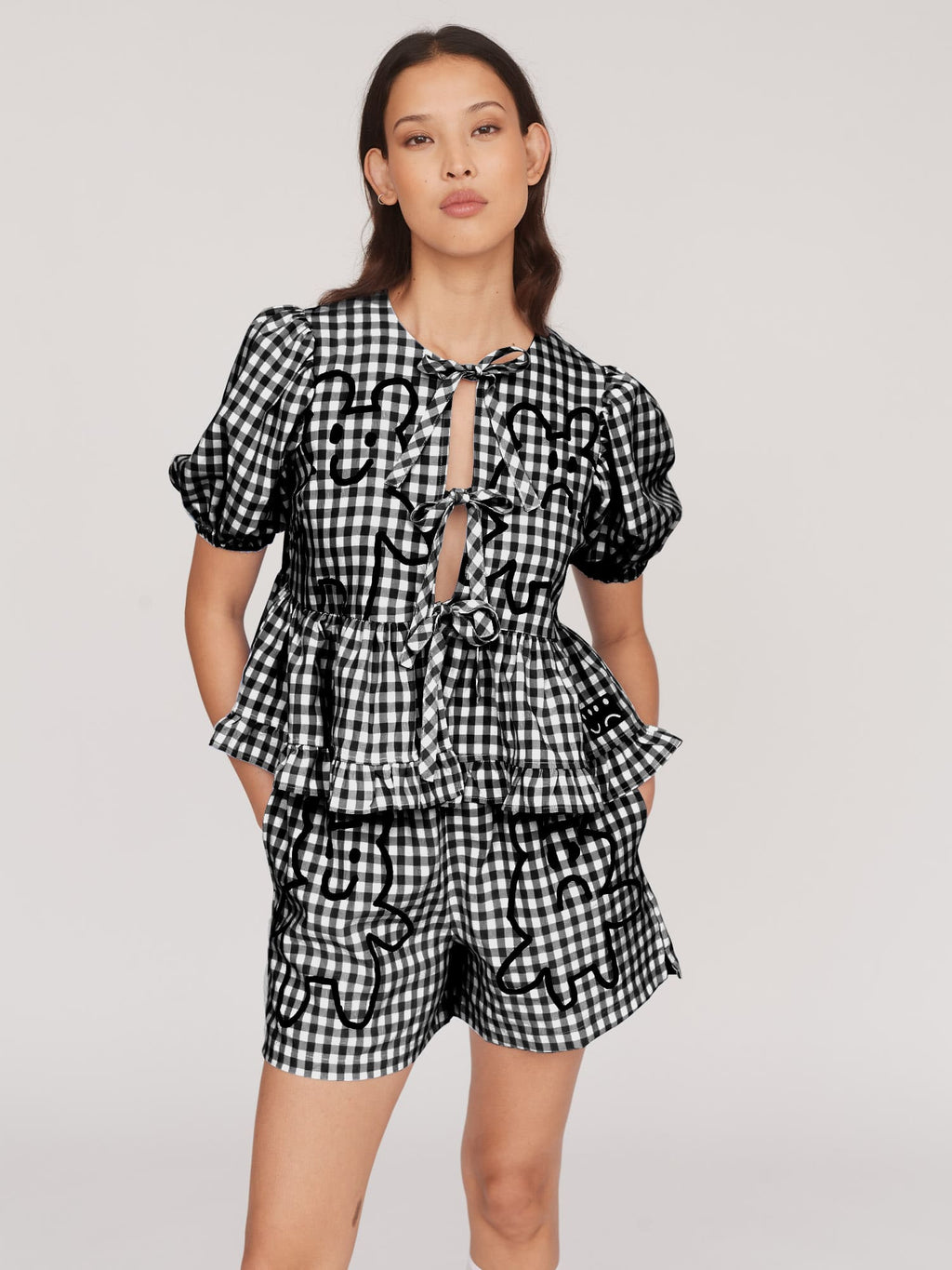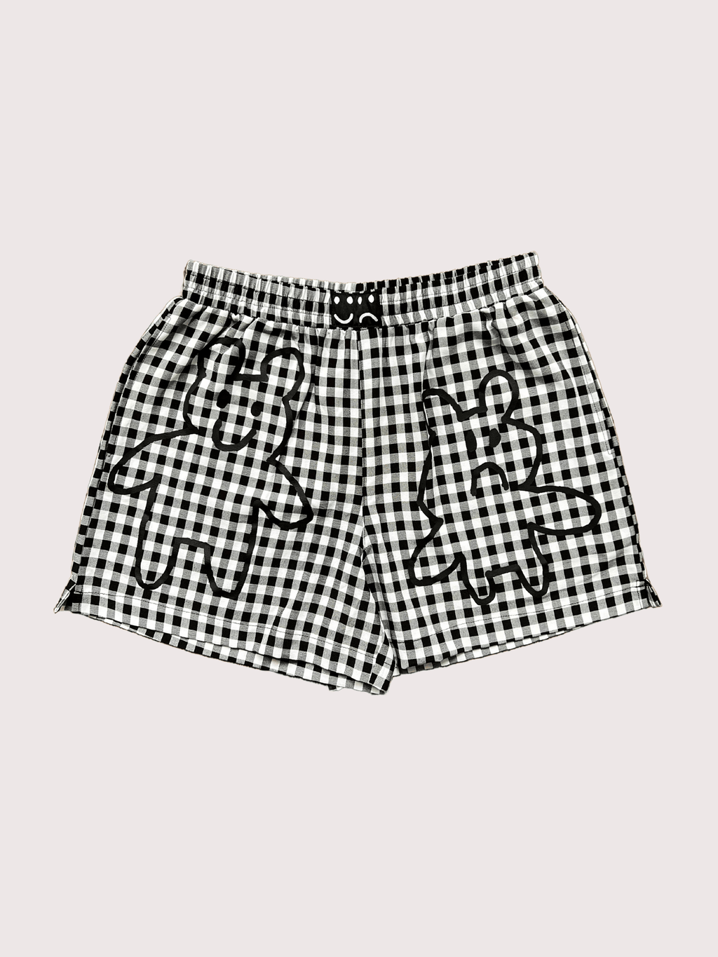 These pull on black and white gingham shorts have an elasticated waistband and are made from a breathable, lightweight material. They’re not just a looker, they’re practical too with side seam pockets as well as one at the back to put all your nic-nacs. Across the front is a black Happy Sad bear print; a new iteration of our bestselling mixed emotions print. Pair with our Black Grin and Bear It Smock Top and you’re set for a summer’s day.