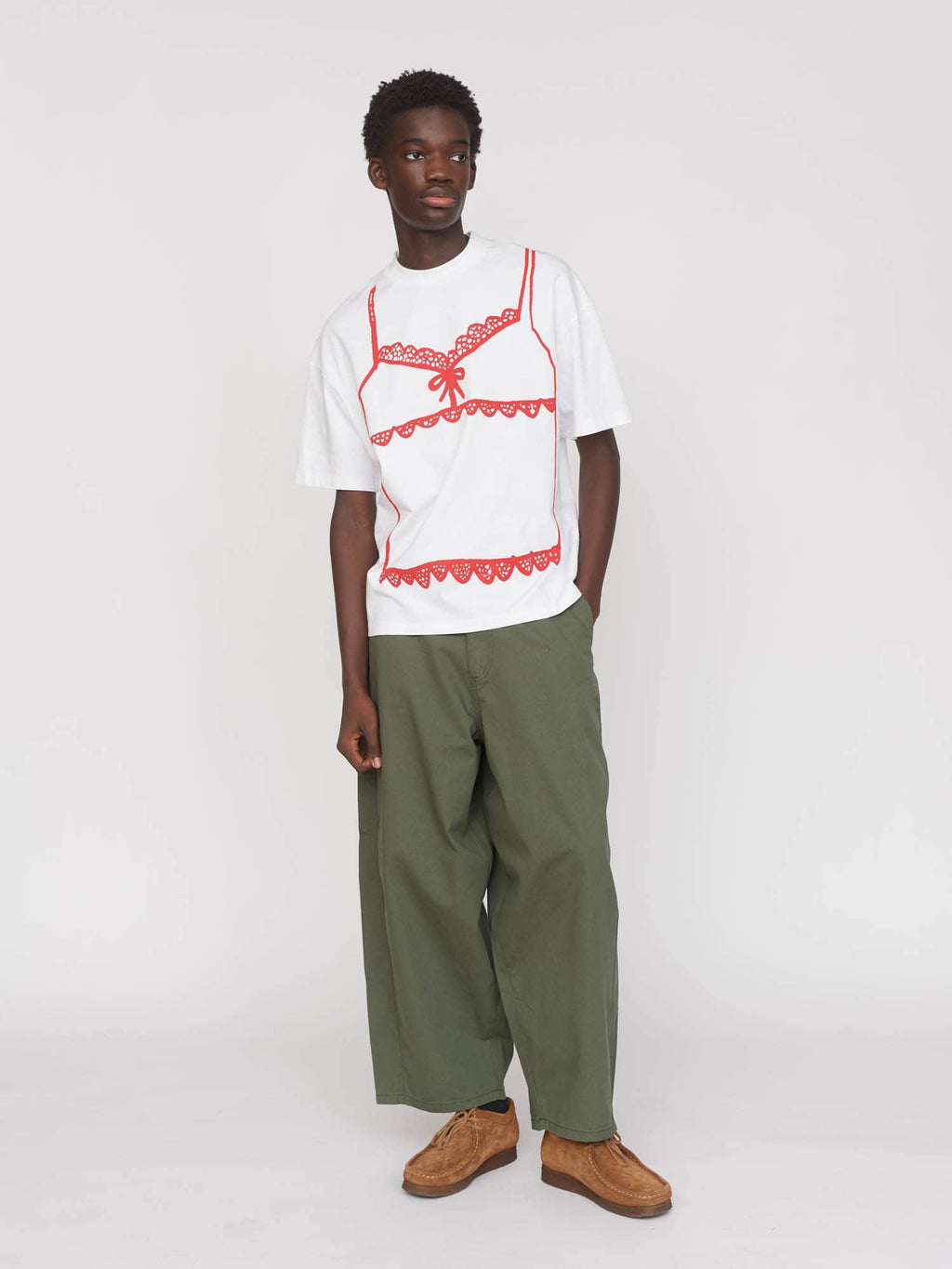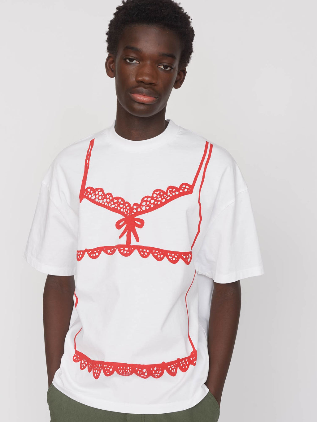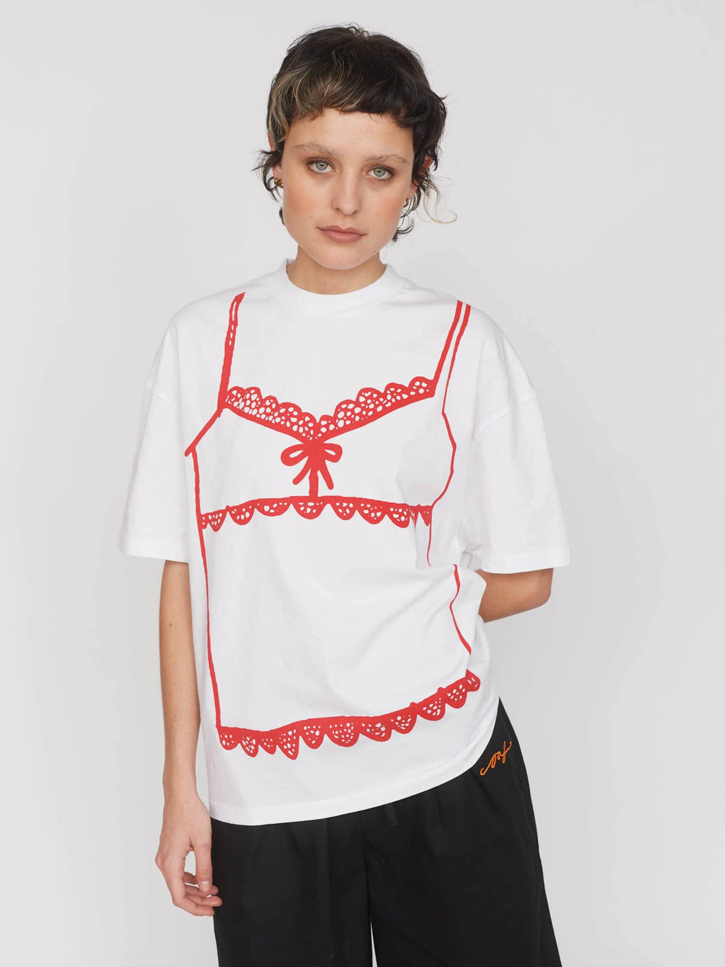 Our first love was graphic tees, so our V-day collection wouldn’t be complete without one. In our signature silhouette, relaxed fit with a slightly dropped shoulder, this white, short-sleeve t-shirt has a printed chest graphic in contrasting red of a camisole top. With an Oaf pip label at the cuff, it’s giving sex appeal in true Lazy Oaf style.