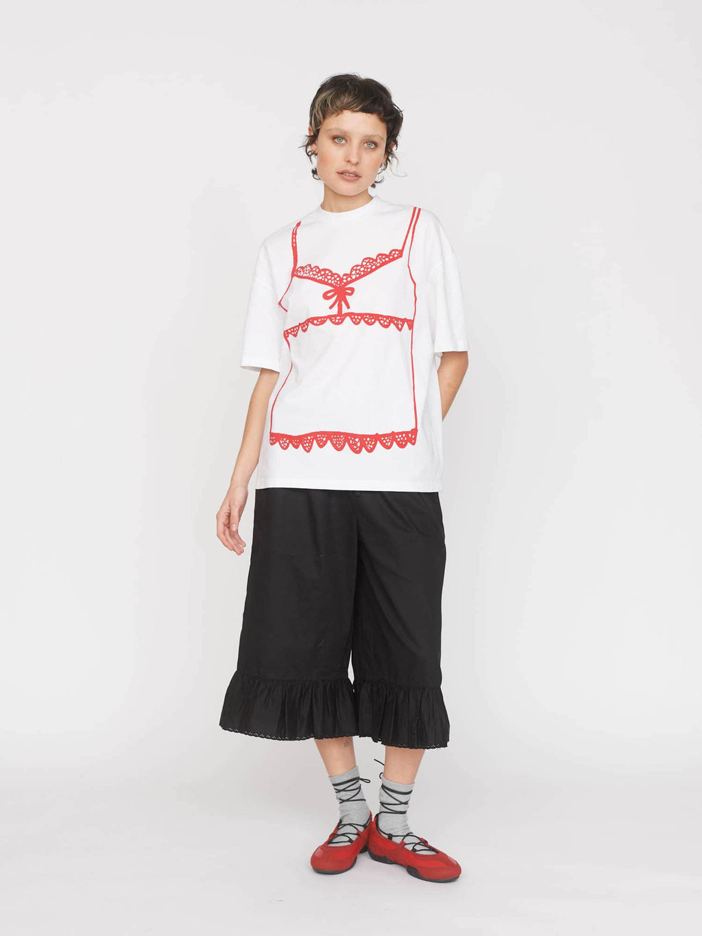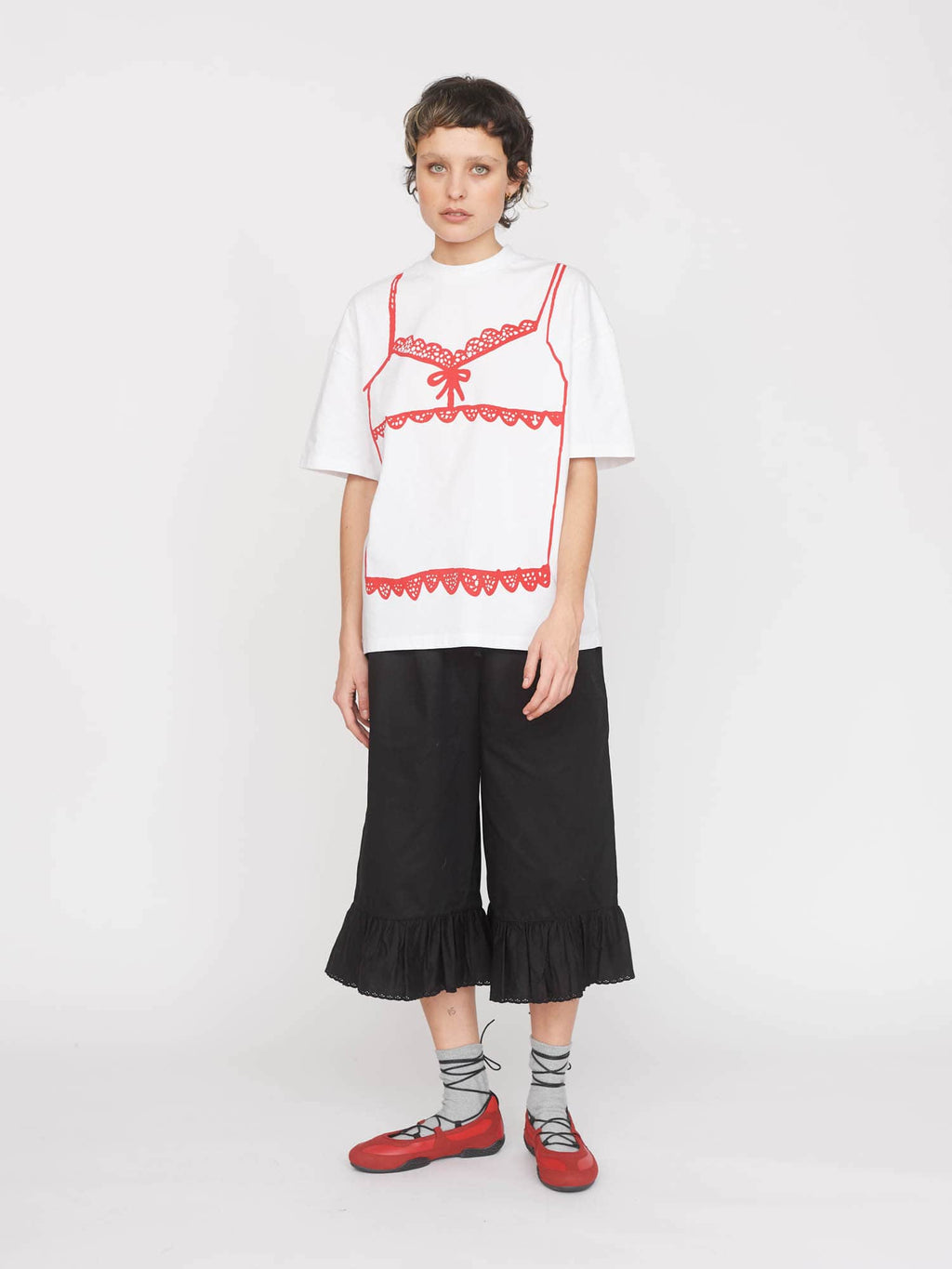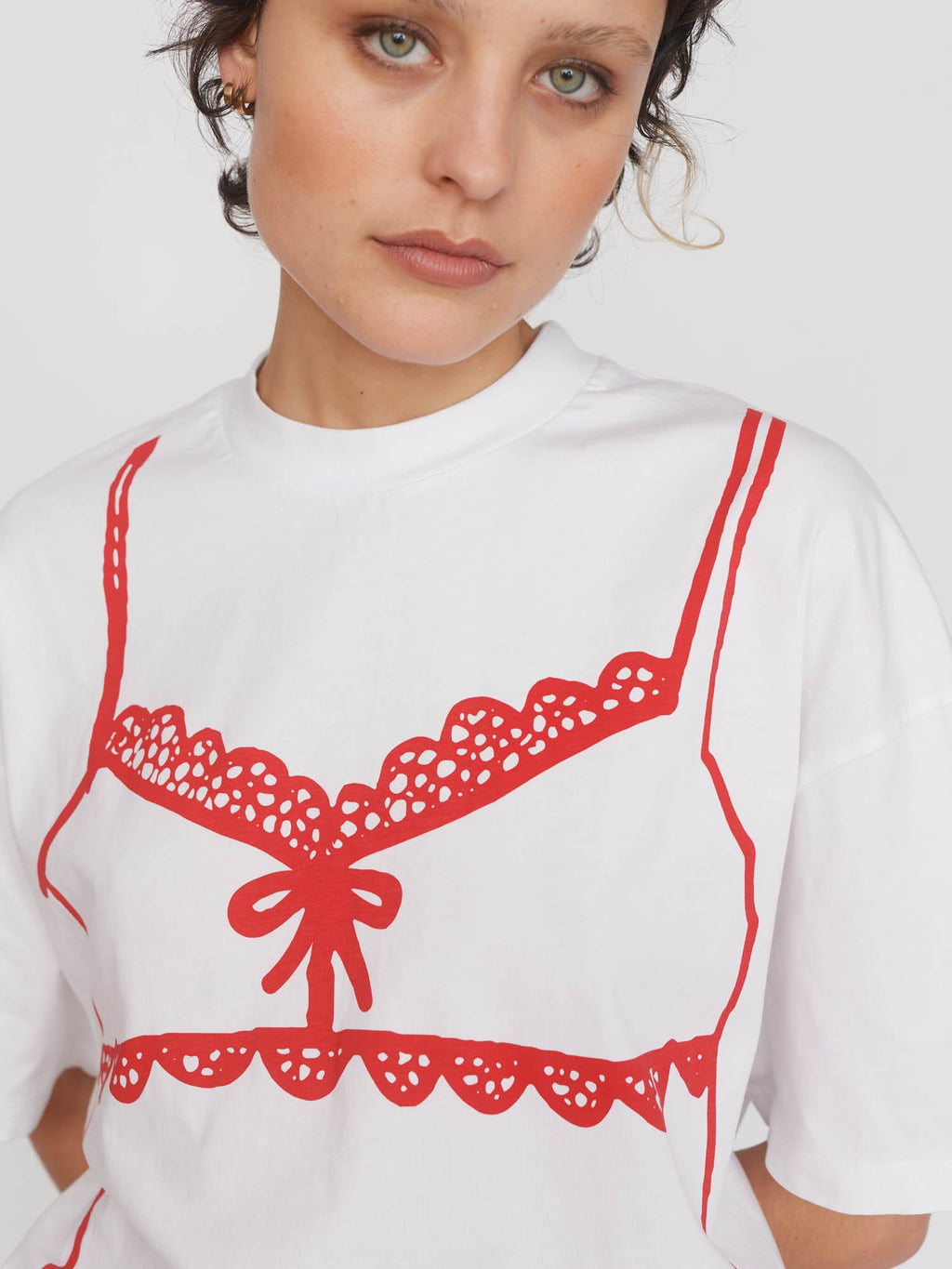 Our first love was graphic tees, so our V-day collection wouldn’t be complete without one. In our signature silhouette, relaxed fit with a slightly dropped shoulder, this white, short-sleeve t-shirt has a printed chest graphic in contrasting red of a camisole top. With an Oaf pip label at the cuff, it’s giving sex appeal in true Lazy Oaf style.