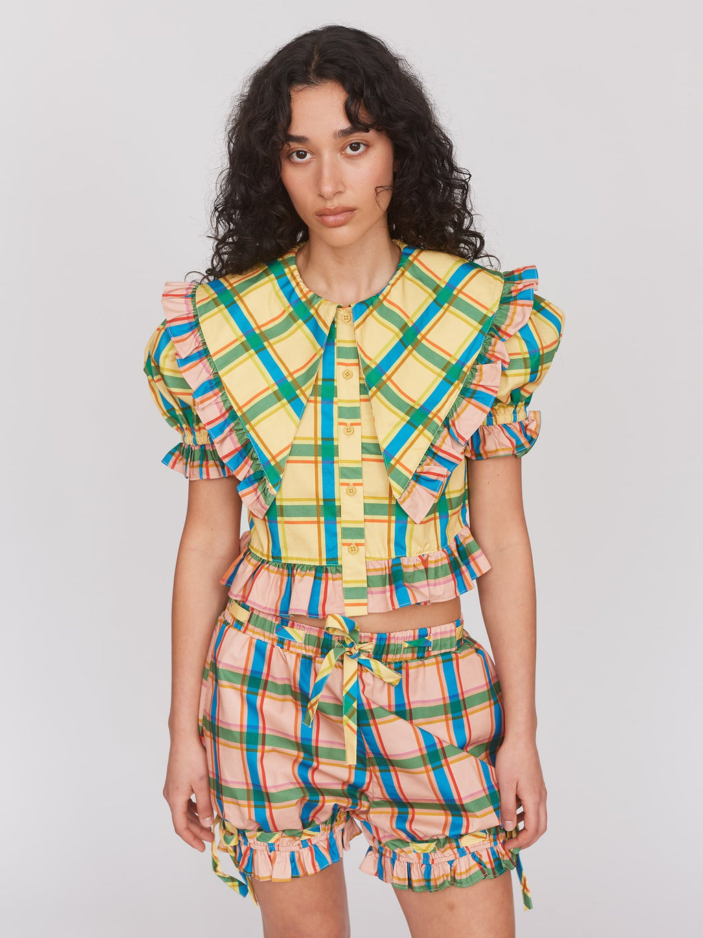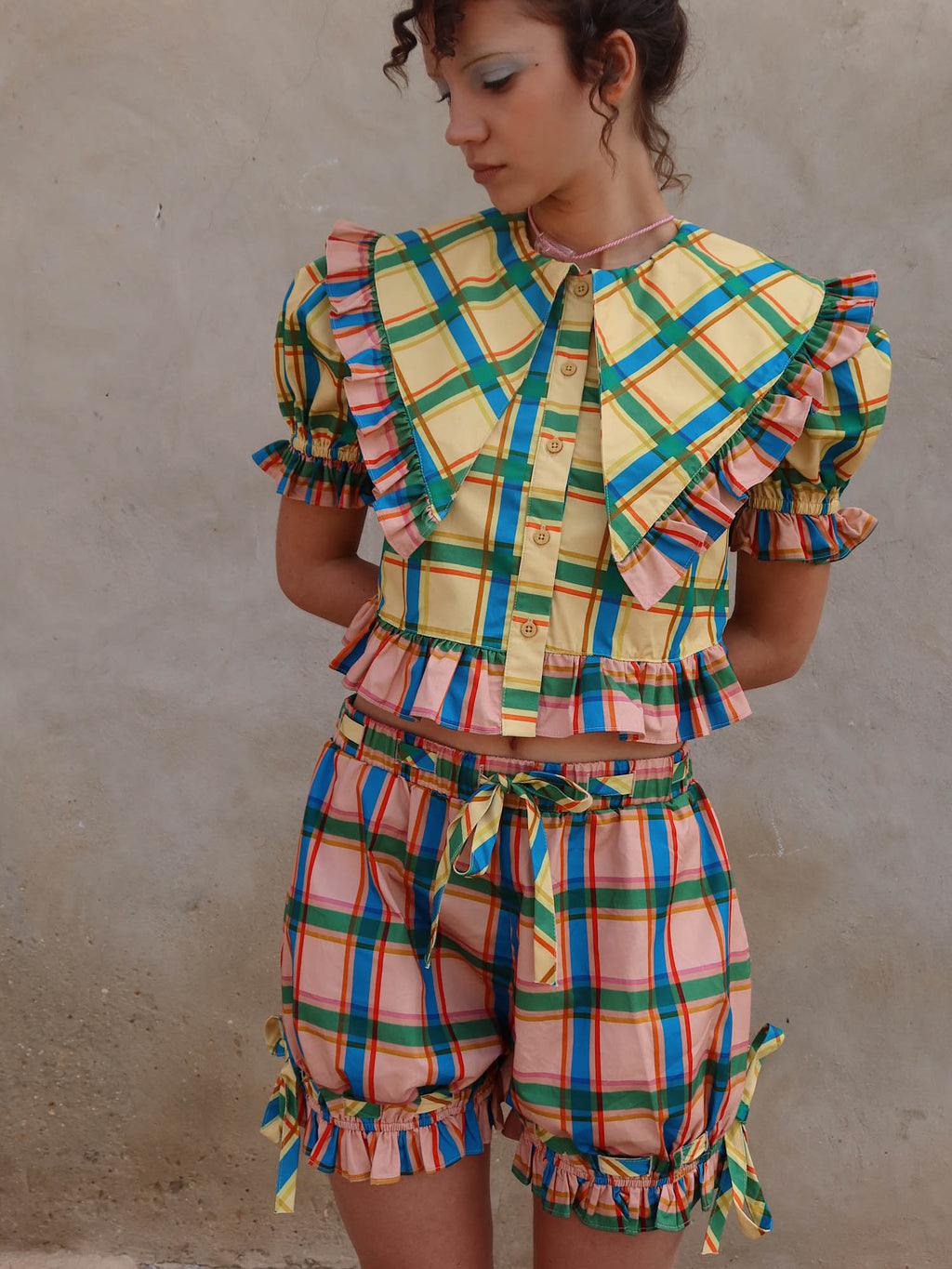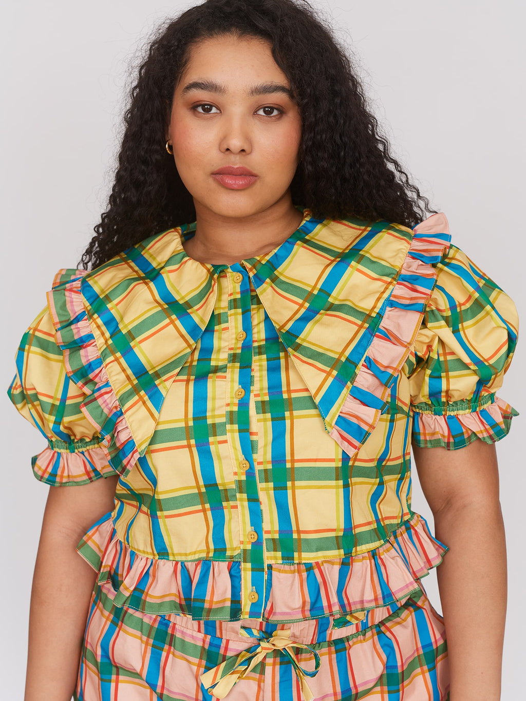 Love our ruffle collar dress, but not really a dress person? This is the top you’ve been waiting for. This button-up, short sleeve shirt has an oversized collar with a ruffle trim as well as a ruffled hem peplum. Made from 100% cotton, it has puff sleeves with elasticated, ruffle cuffs to keep all the volume. In a mismatched check print, if you love this style, you won’t want to miss our Clowning Around Bloomers or Mixed Check Tights.