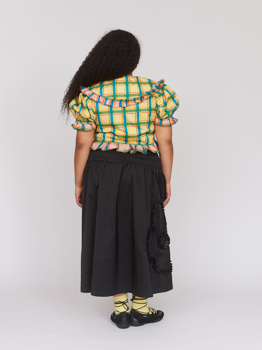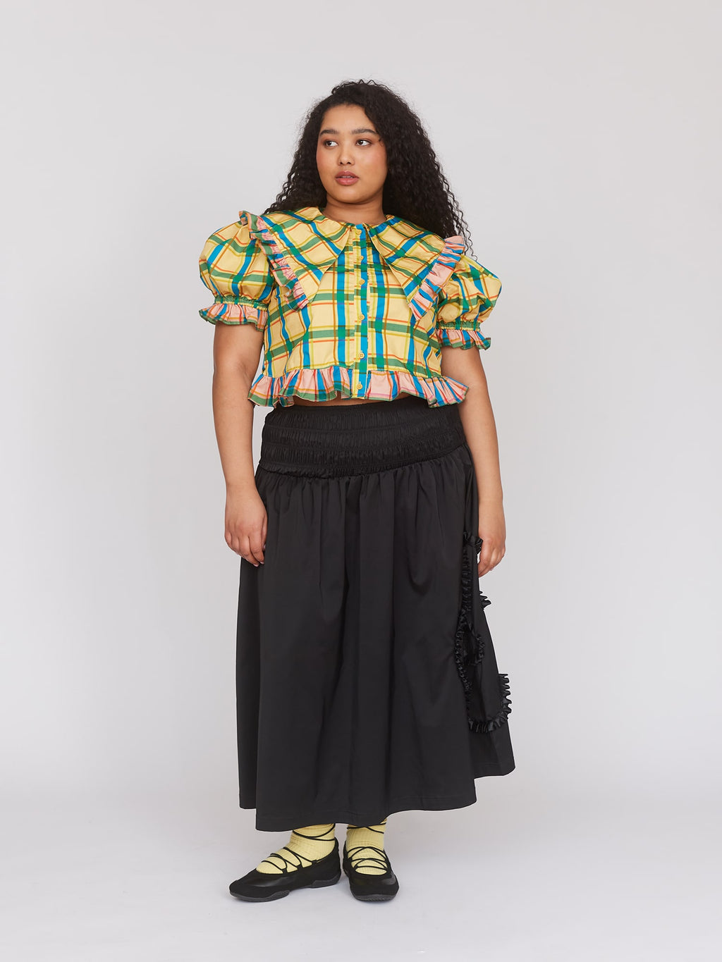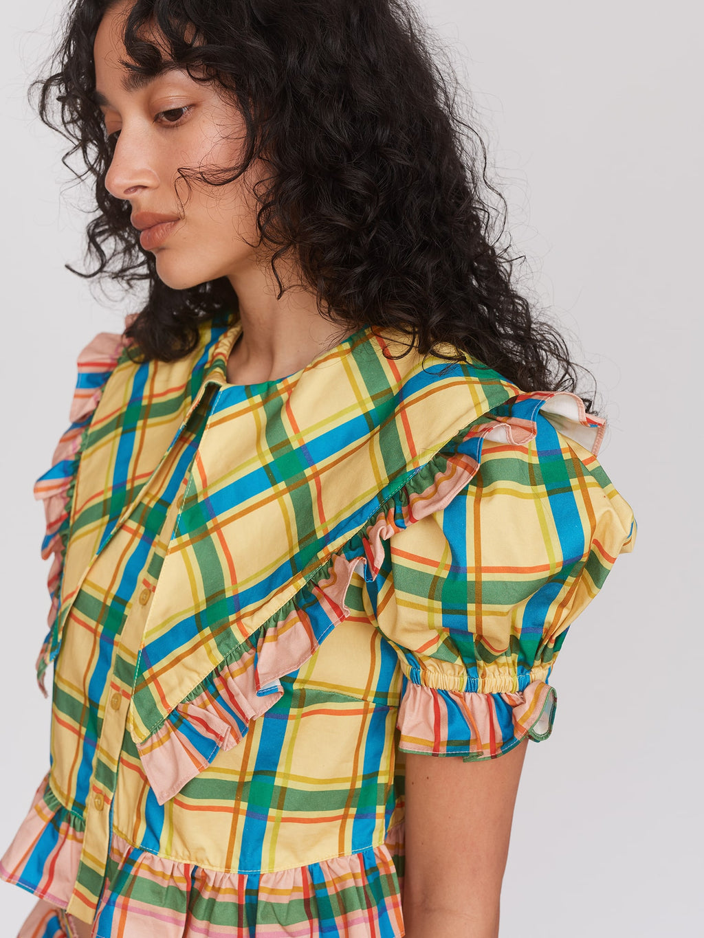 Love our ruffle collar dress, but not really a dress person? This is the top you’ve been waiting for. This button-up, short sleeve shirt has an oversized collar with a ruffle trim as well as a ruffled hem peplum. Made from 100% cotton, it has puff sleeves with elasticated, ruffle cuffs to keep all the volume. In a mismatched check print, if you love this style, you won’t want to miss our Clowning Around Bloomers or Mixed Check Tights.