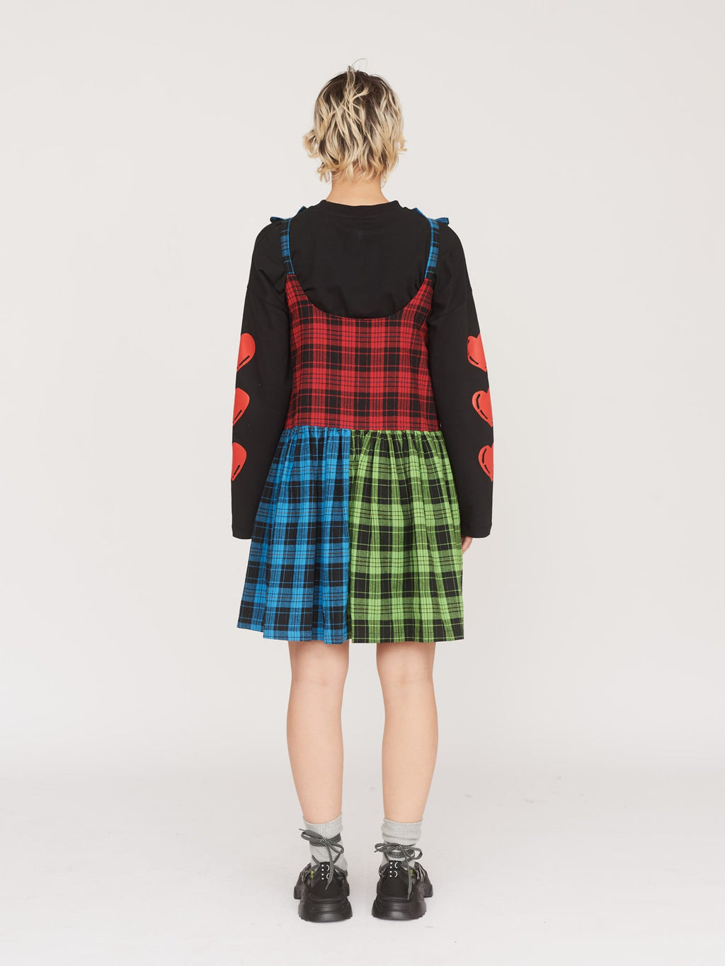 This cotton blend mini dress comes in a green, blue and red flannel patchwork design. In a drop waist silhouette, it has a gathered skirt creating natural volume, and straps with bow detailing. We’re not one for carrying all our things, so there are two side seam pockets. With a relaxed fit, this dress is perfect for looking cute to devour a pub Sunday roast.