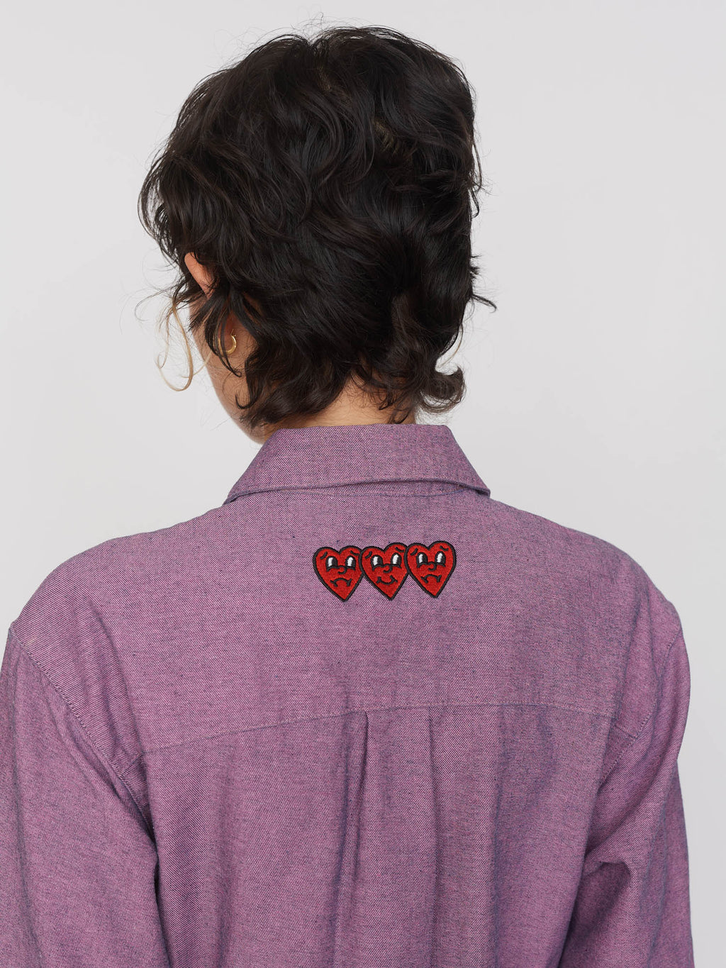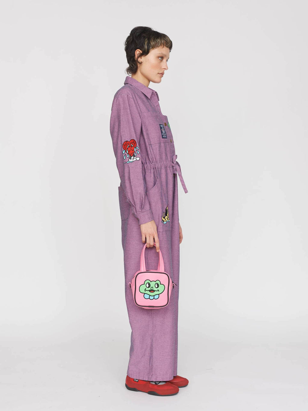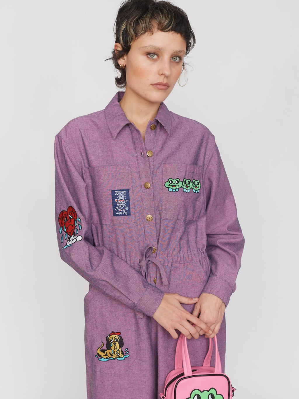 In a washed purple denim, this long-sleeve boilersuit has a shirt collar with a button down front and cuffs. In a relaxed fit, it has a functional drawcord at the waist as well as a back yoke with box pleat detail. The jumpsuit has a dropped shoulder with a straight leg and of course, there are front and back patch pockets. With woven patches and embroidered details all over by artist Ales Div, this’ll be the effortless all-in-one outfit you’ve been waiting for.