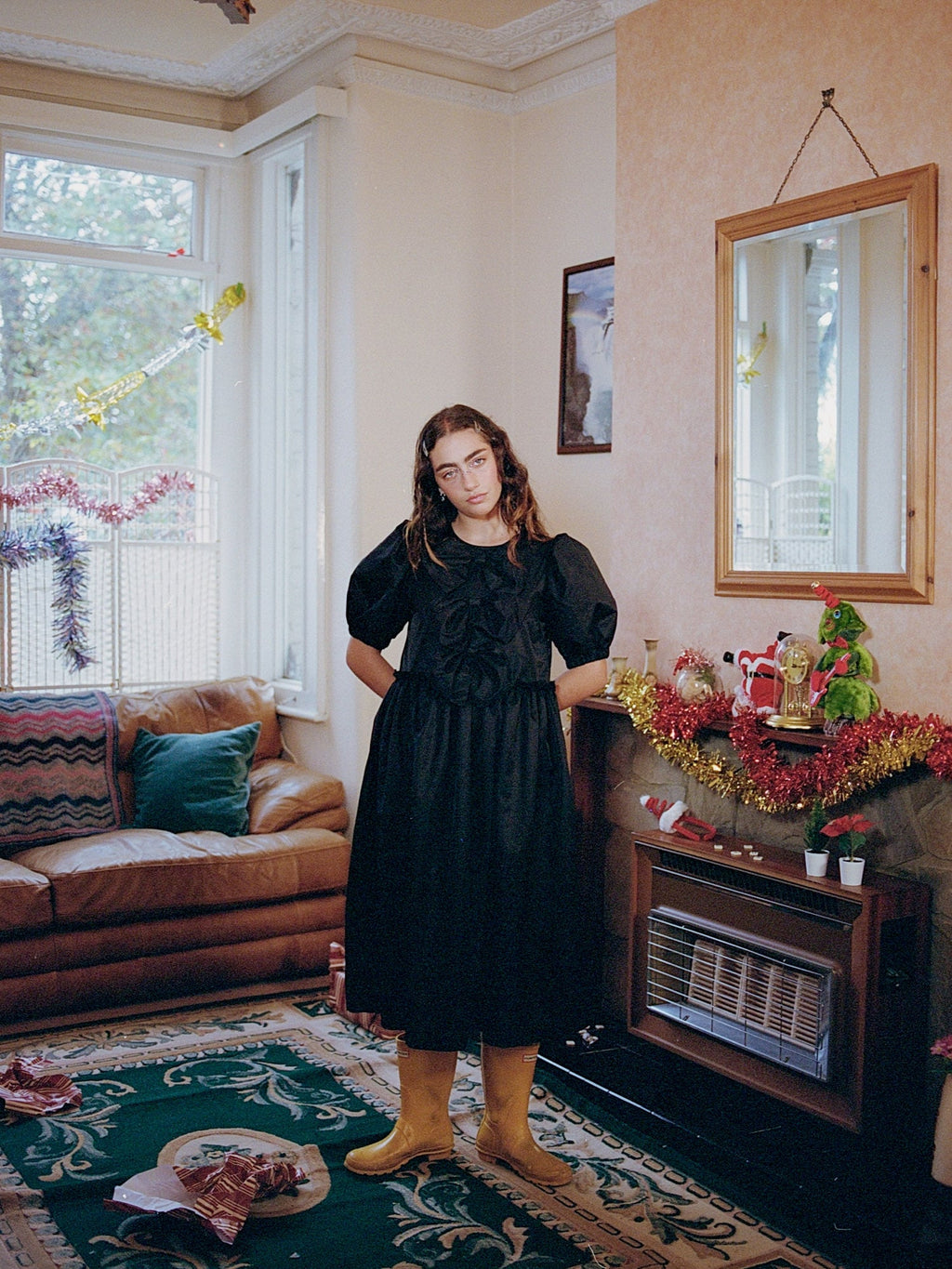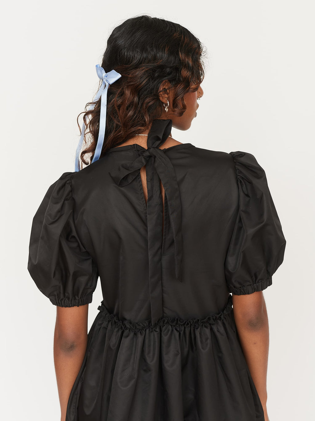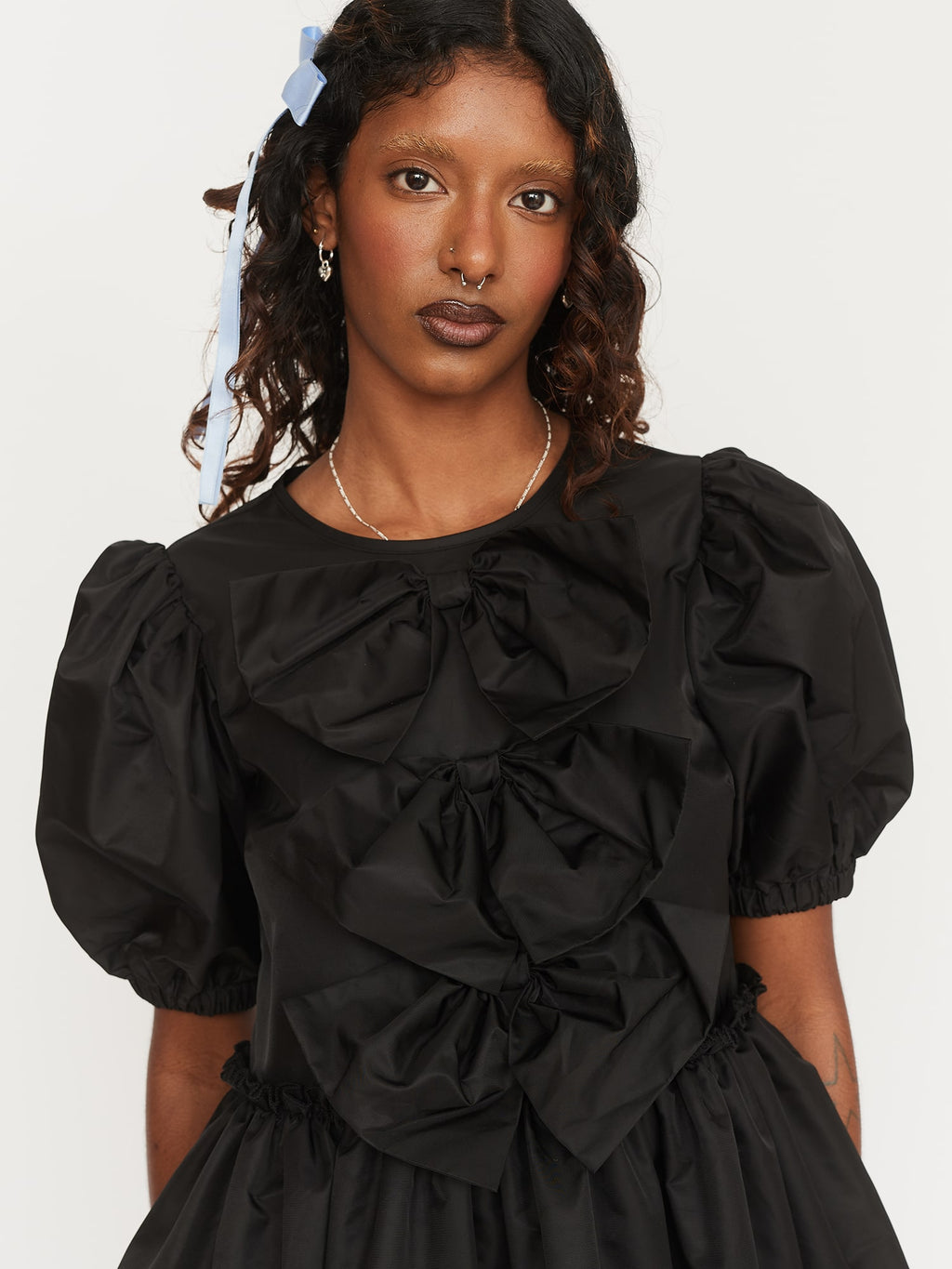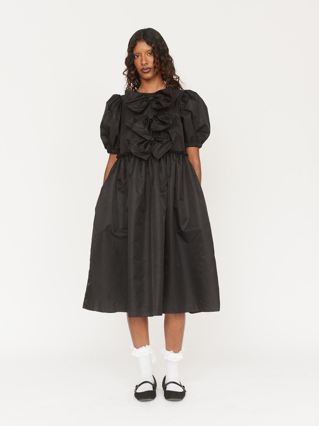 Can we hear a little commotion for the dress?! Now let’s hear it for the front of the dress! This black midi dress is in a heavy weight satin feel fabric and is all about volume, with three bows down the centre of the dress, along with short puff sleeves. The drama continues with a full gathered skirt with a waist ruffle and a back neck bow tie closure. You can’t be a drama queen without somewhere to put your things, so there’s two side seam pockets.