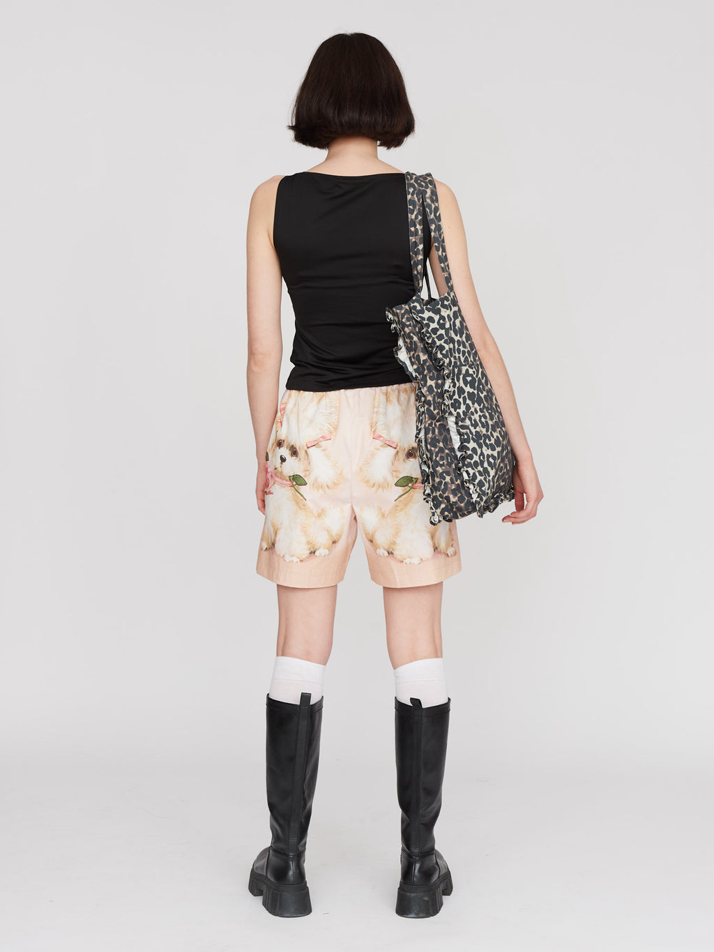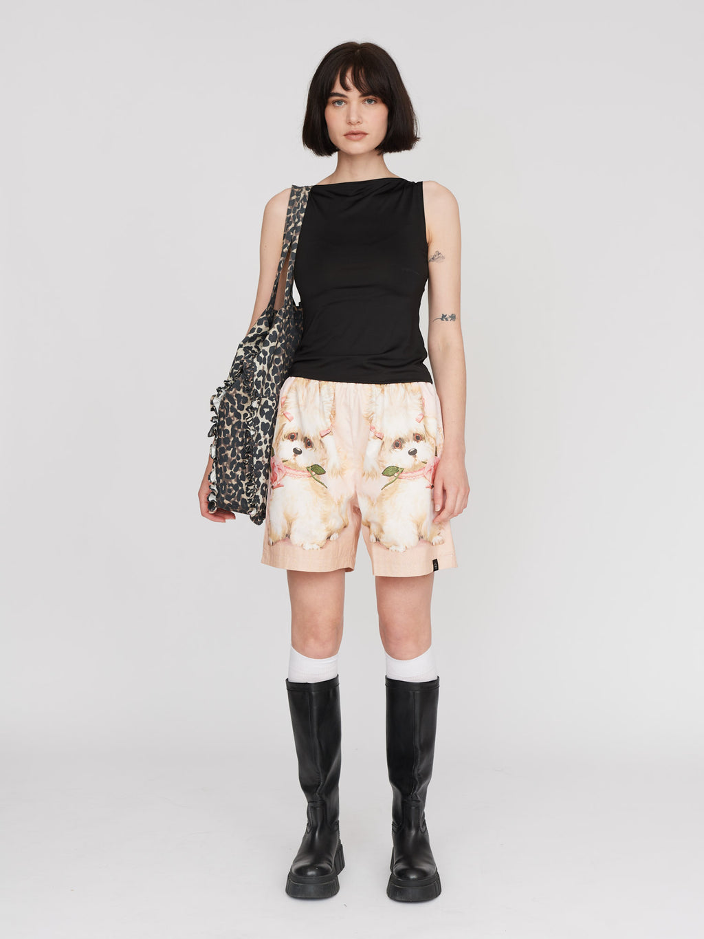 These pull-on shorts are a summer staple, with an elasticated waist and side seam pockets they’re perfect for popping to the offie or bouncing through your next festival. In a relaxed fit, these baby pink shorts have front and back placement of a Poodle puppy print. At the hem is both side seam splits and an Oaf pip label. Pair with our Fancy Pants Poodle Bowling Shirt and White Ballet Sneakers and you’ll be giving more show pony than underdog.