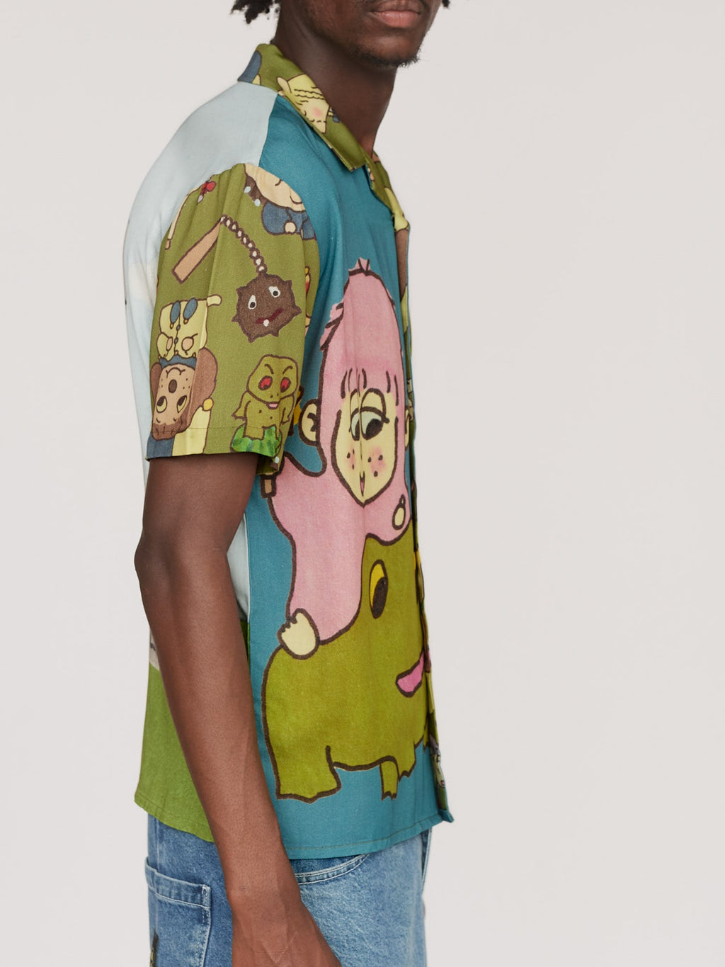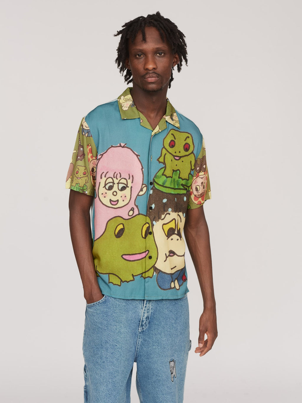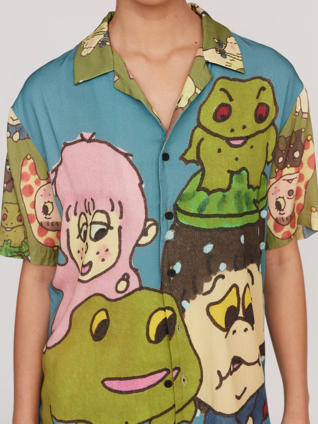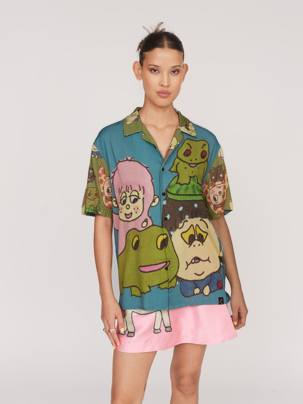 “You’re watching Adventure Call, my name is Falconhoof and I will be your guide on your quest”Our genderless bowling shirt silhouette has a relaxed fit with a revere collar and side splits at the hem. With short sleeves, it’s made from a super soft viscose fabric making it the perfect light layer for the summer months. Across the front and back are placement prints, with contrasting ones on the sleeves and collar, all drawn by UK based artist Tom Jones. At the hem is a bespoke patch label for the Once Upon a Time collection. Pair your bowling shirt with your favourite denim and trainers, and you’ll be ready to take on the sun.