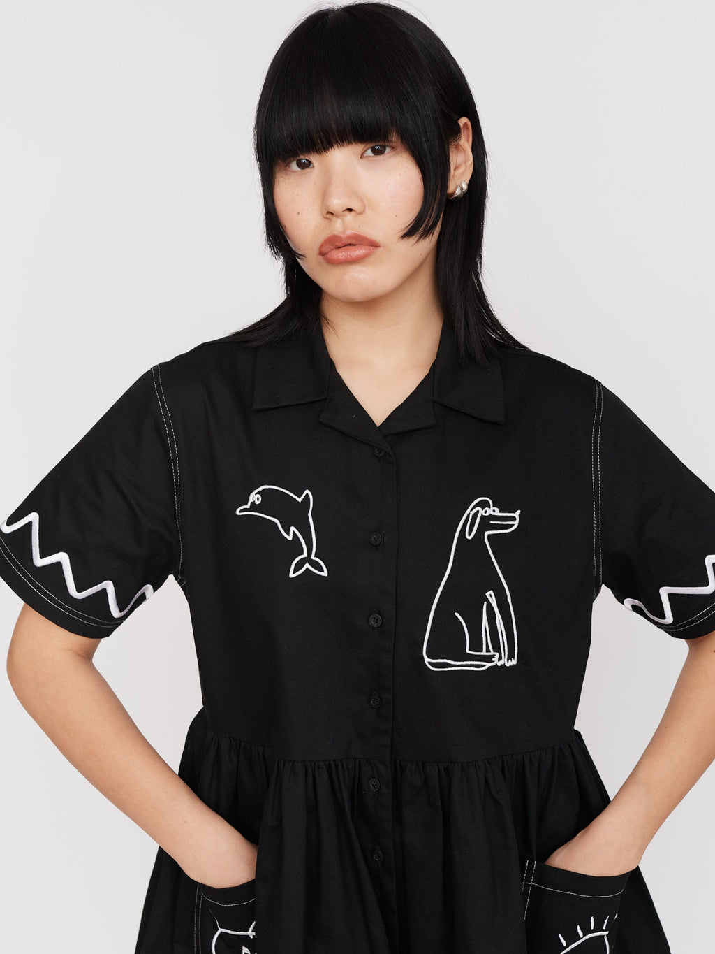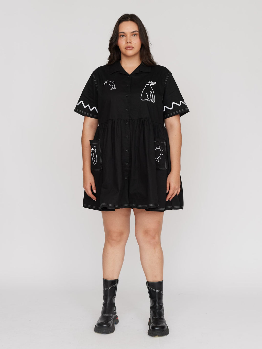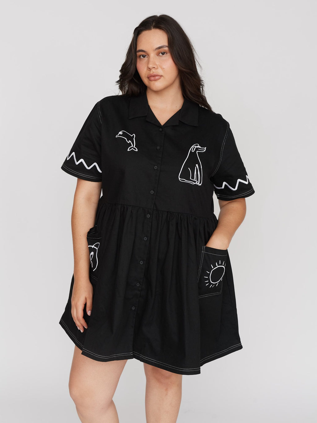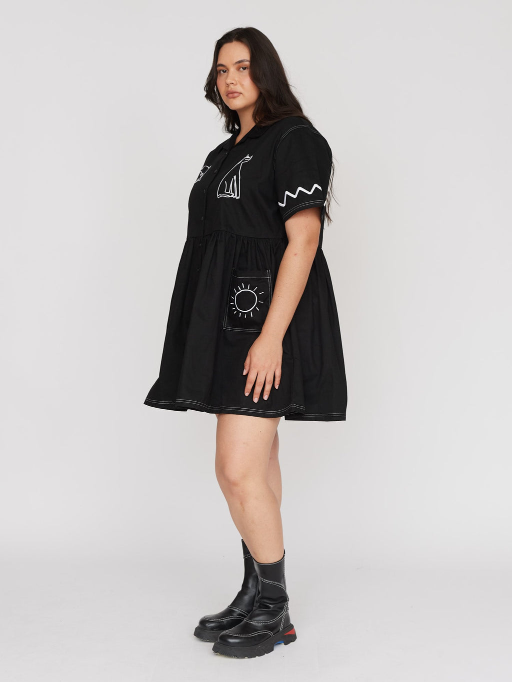 Our best-selling shirt dress shape has had a summer makeover. This black midi length shirt dress has a convertible collar with a full gathered skirt. Across the dress and front patch pockets is a contrast white embroidery illustrated by Gemma, King of Oaf, as well as twin needle stitching at the hems and shoulders. With a relaxed fit and made from 100% cotton, this’ll be the all-year round dress your wardrobe has been craving.