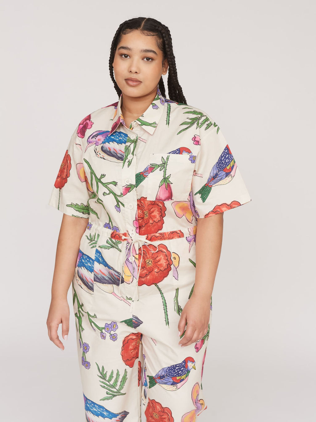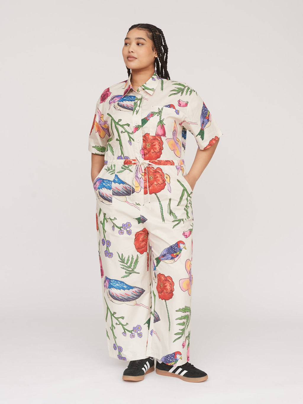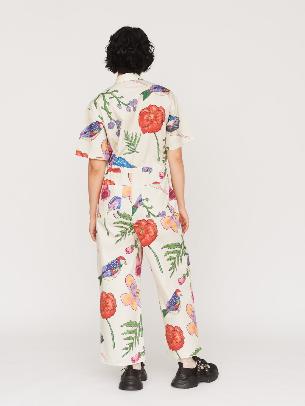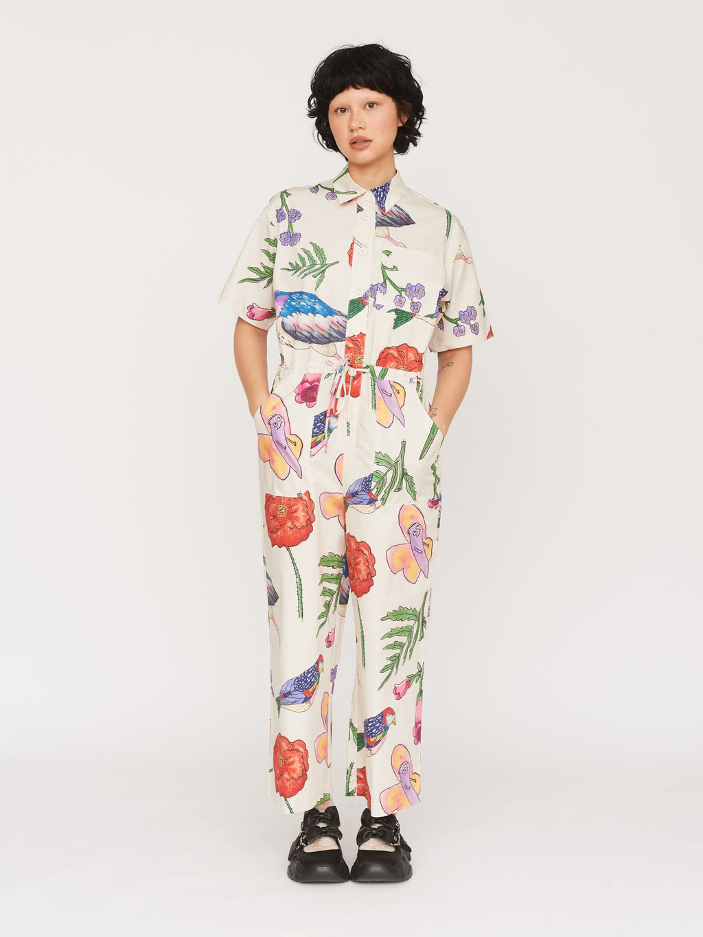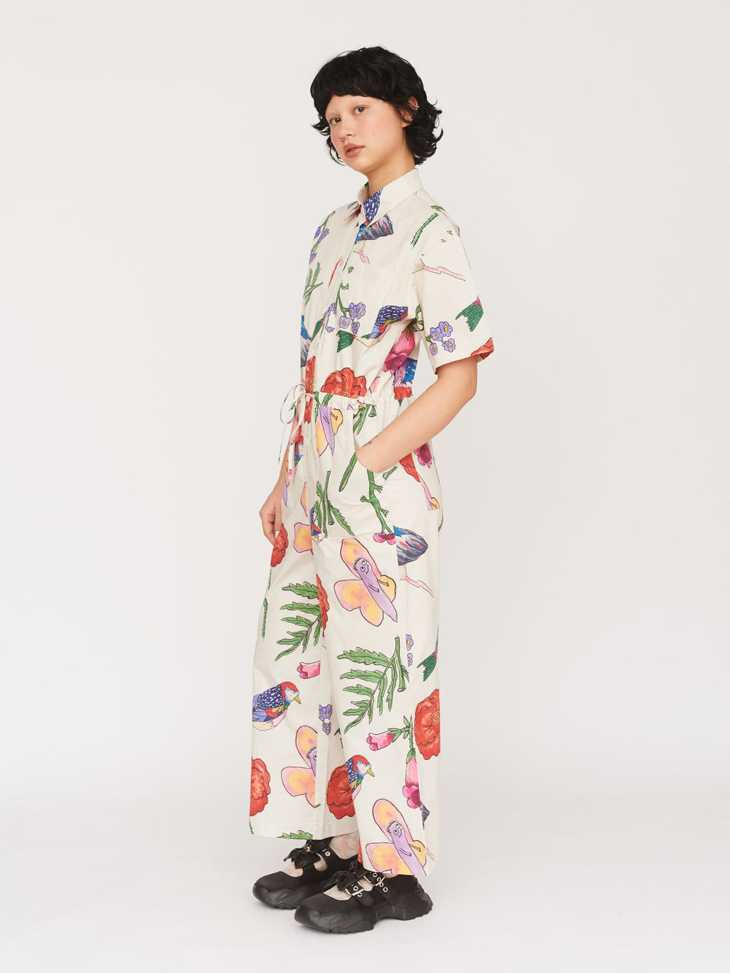A jumpsuit that’ll make you feel just like you're roaming through the depths of Epping Forest when the weather is half-decent. In an all over flora and fauna print illustrated by none other than the King of Oaf, Gemma Shiel, this short sleeve jumpsuit has a centre front button closure with a shirt collar. The lightweight cotton fabric of the jumpsuit adds to the relaxed fit it has, along with the adjustable drawstring waist allowing you to change up the silhouette. It wouldn’t be very Oaf of us to not have pockets, would it? So of course there’s a chest pocket along with hip and back patch pockets. Its relaxed fit makes it ideal to layer under on the cold days, or wear alone on the warmer ones.