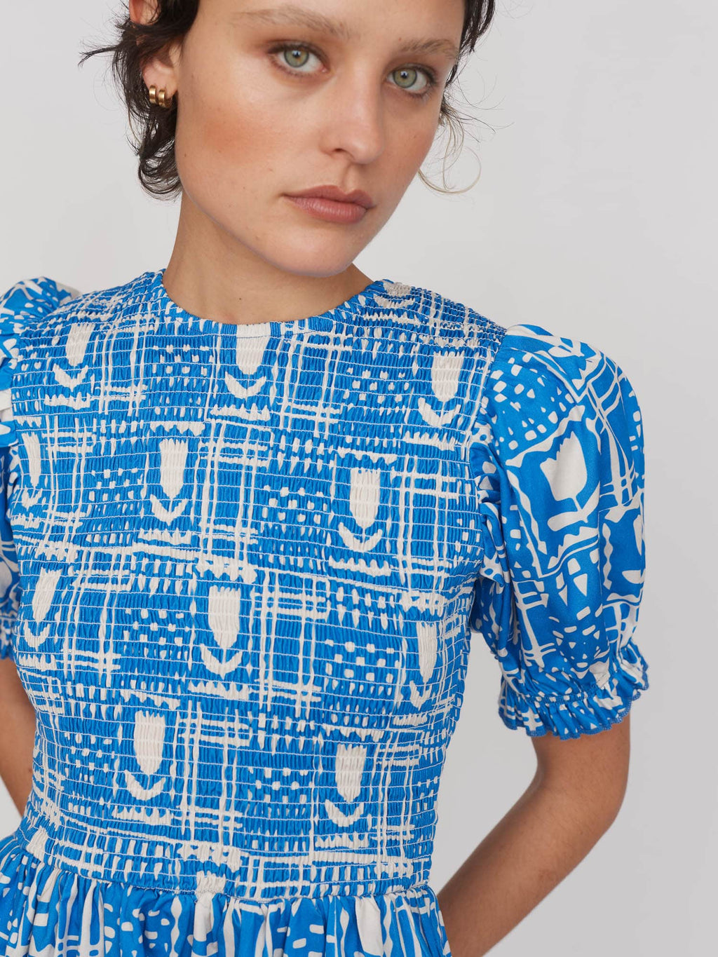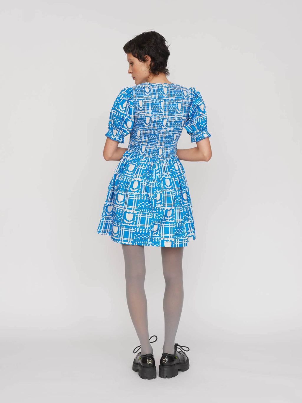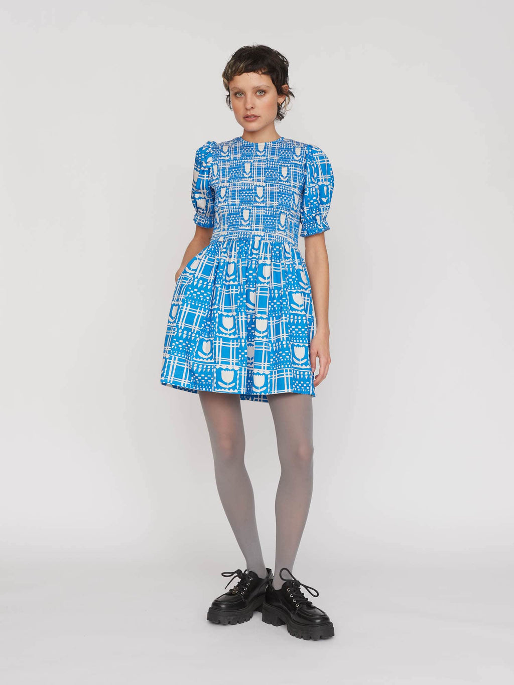 In 100% cotton, this baby blue dress has an elasticated shirred bodice with puff sleeves that have elasticated ruffle cuffs. At mini length, it has an all over floral, checkerboard pattern in contrasting white. With a concealed zip closure and side seam pockets; this dress will be complete with some white tights and our Problem Child Cardigan.Need help with your order? CONTACT US