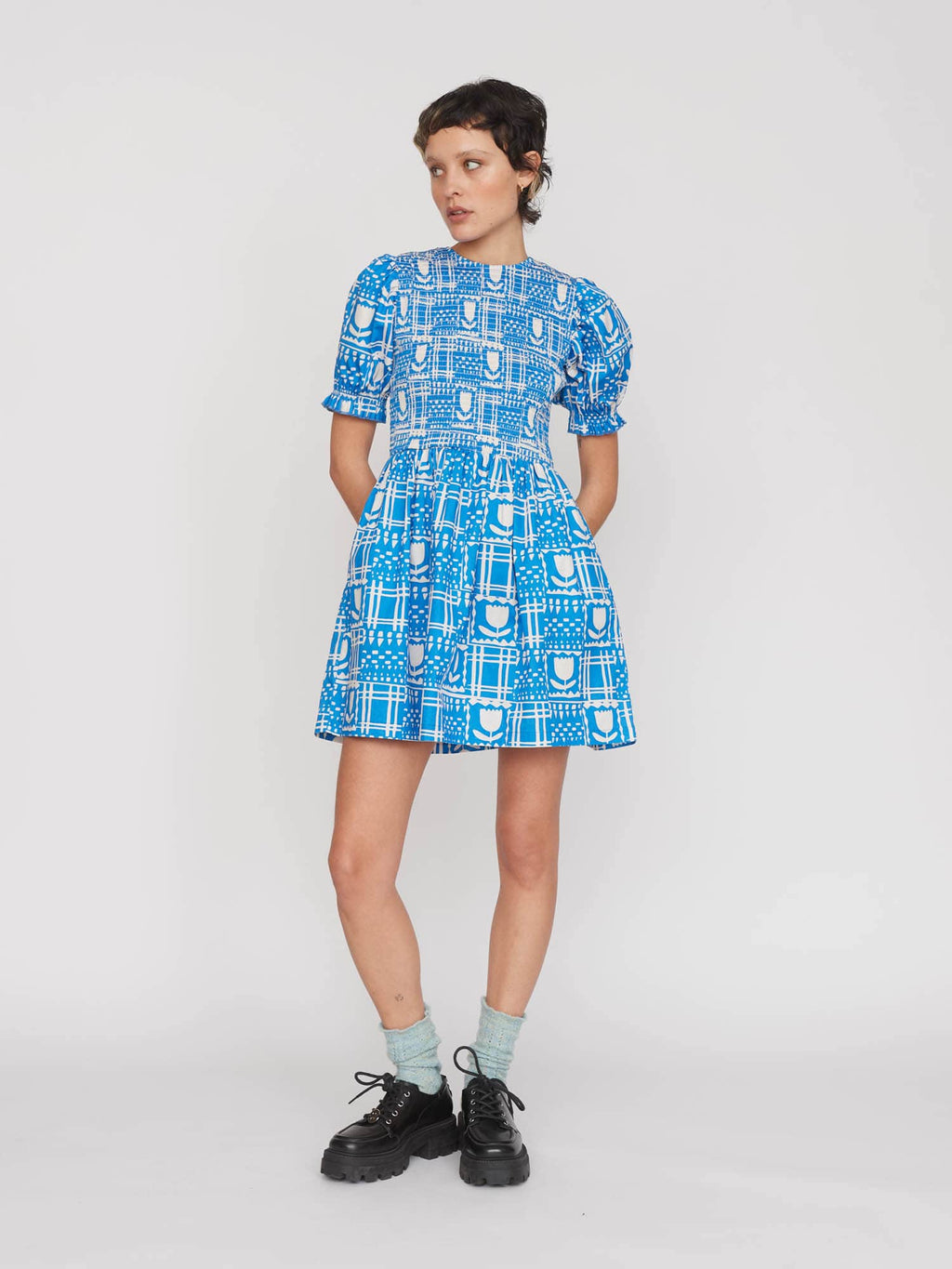 In 100% cotton, this baby blue dress has an elasticated shirred bodice with puff sleeves that have elasticated ruffle cuffs. At mini length, it has an all over floral, checkerboard pattern in contrasting white. With a concealed zip closure and side seam pockets; this dress will be complete with some white tights and our Problem Child Cardigan.