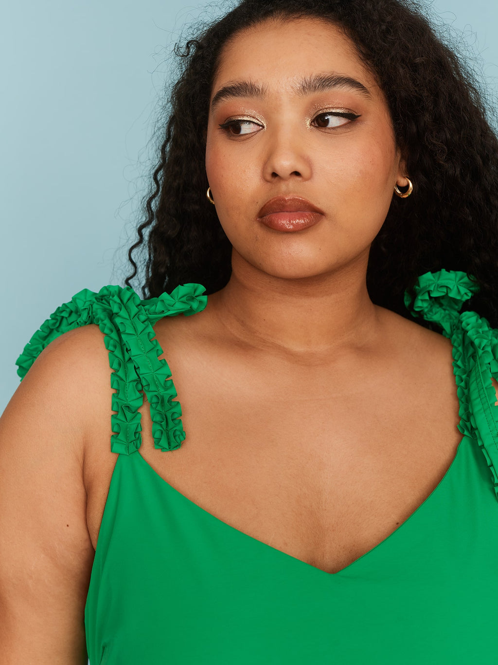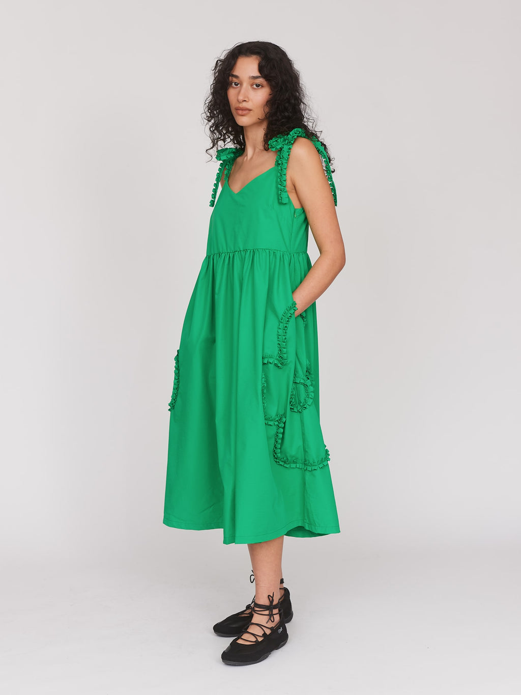 In vivid green, this midi length dress is made from a heavyweight satin-feel fabric and has adjustable, ruffle trim shoulder straps. The fitted bodice is fully lined and goes into a full skirt, which of course has pockets, and features applique flower detailing on either side. Fastenable by a concealed side seam zip, this'll be the dress that you can dial up or down for all your summer occasions.