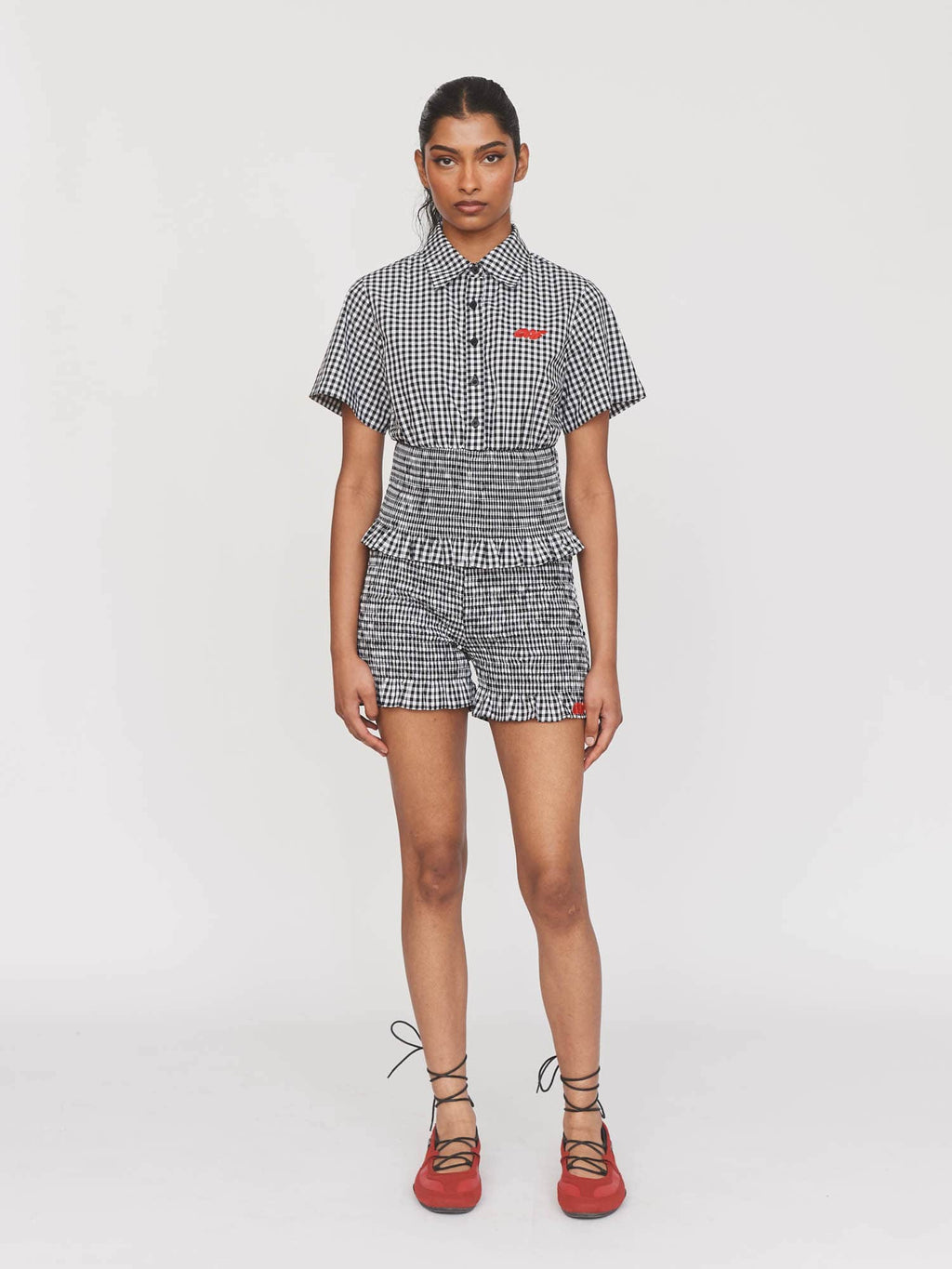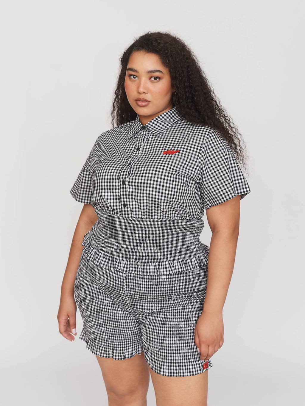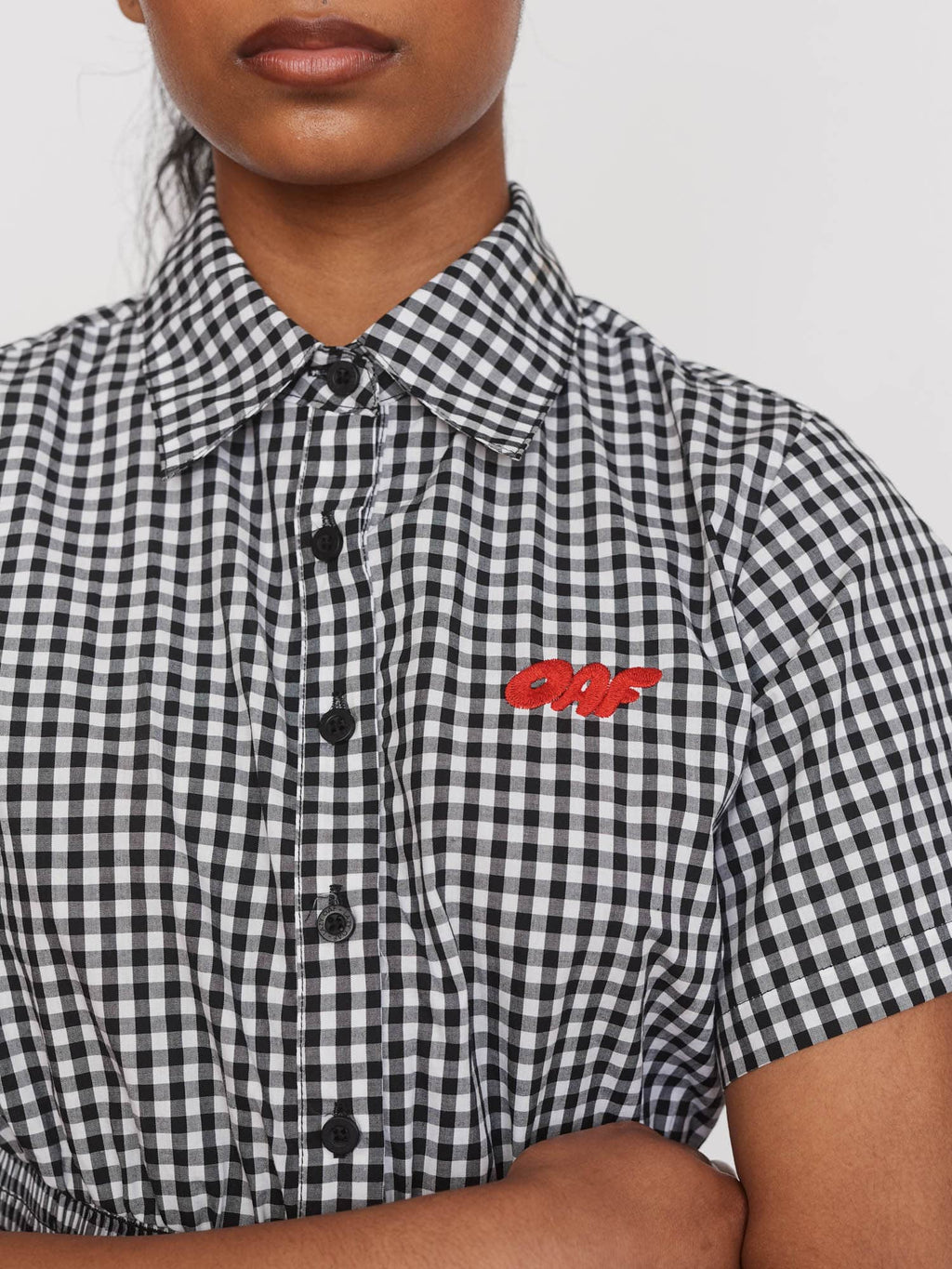 A new style for us, this short sleeve, gingham shirt had a fitted silhouette with an elasticated shirred, waist panel. Made from 100% cotton, this black and white shirt features an Oaf text embroidery at the chest in contrasting red. Coordinate with our Gingham Shirred Shorts and your holiday snaps are gonna be 12/10.