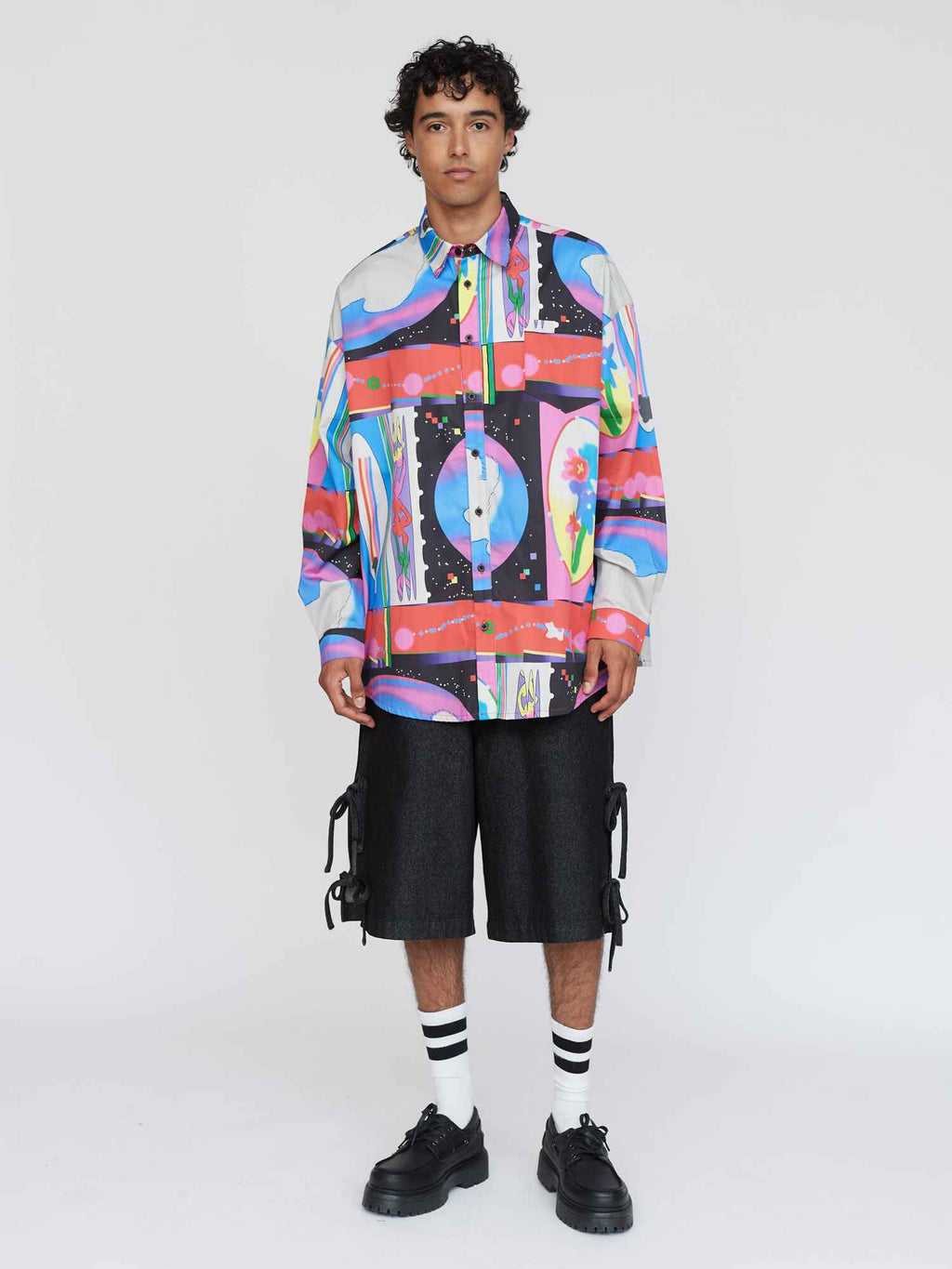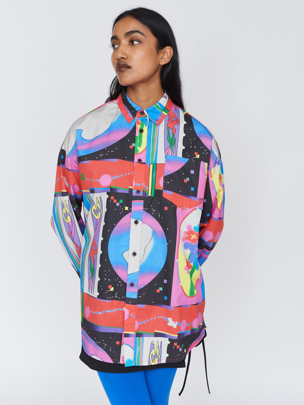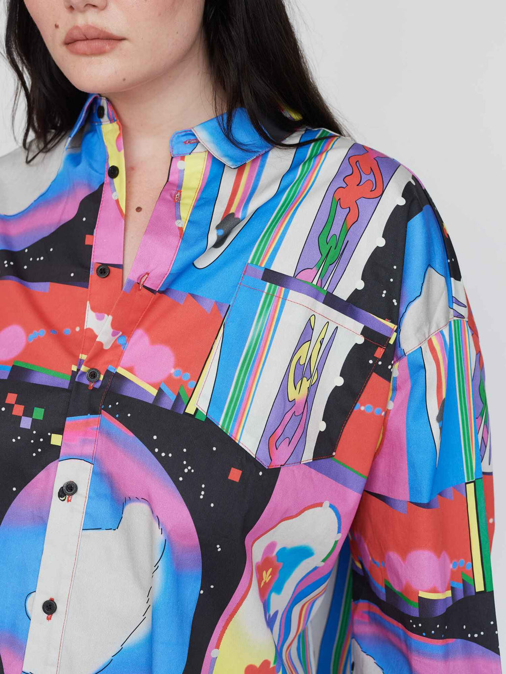 This long sleeve button up shirt is all good for making you feel dapper, without losing your individuality. With an oversized fit and a dropped shoulder, this shirt has a back yoke with box pleat detail giving it that *chefs kiss* fit along with side slits at the hem and branded buttons. Across the shirt is an all over print created by @feihuasanqian, which will be unique in placement from piece to piece. Head to coordination station and layer it over our Glitch Tie Shoulder Dress, heck, throw in the Glitched Quilted Bag for the motherlode!