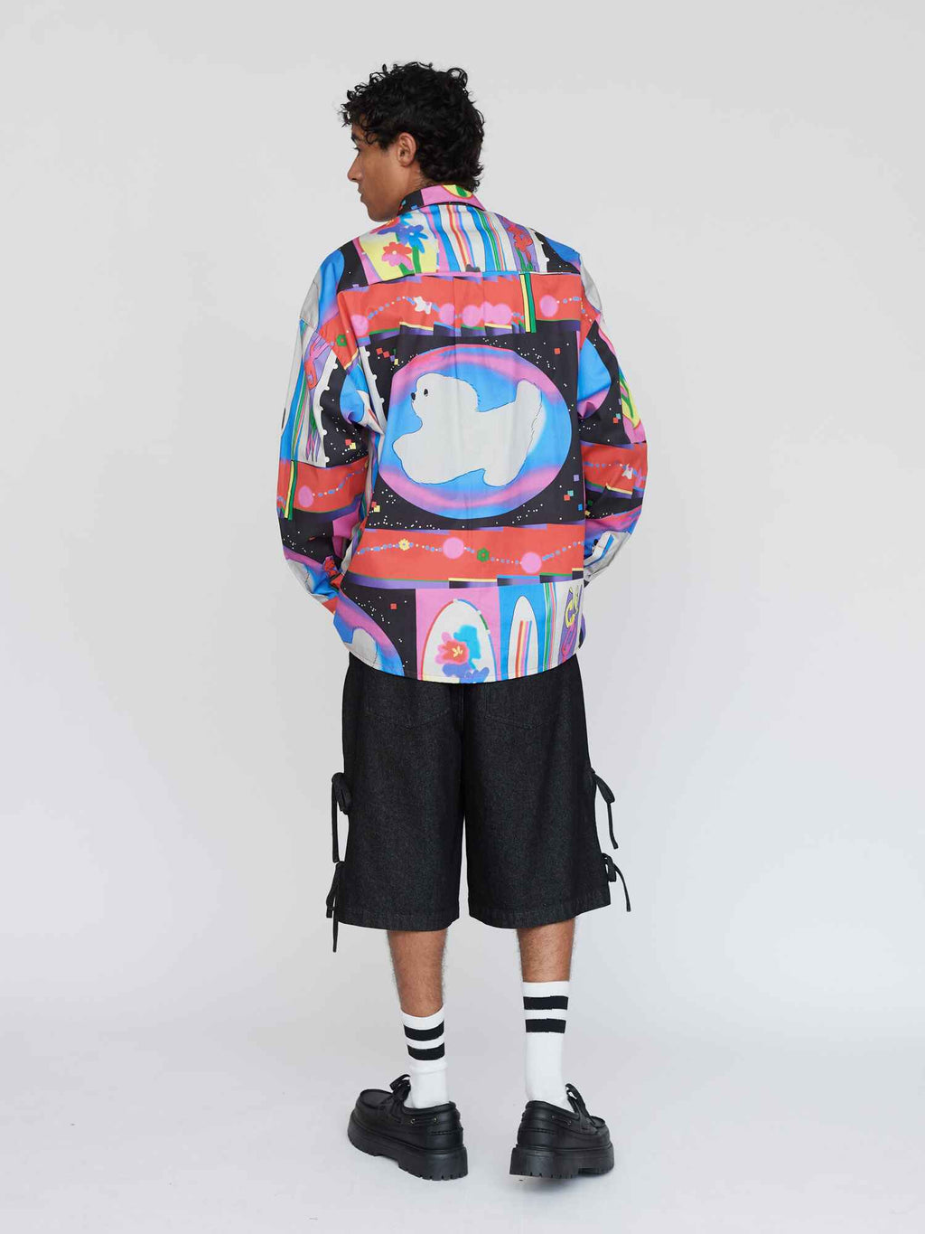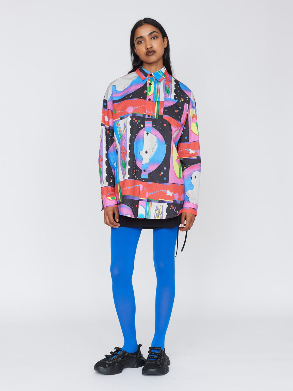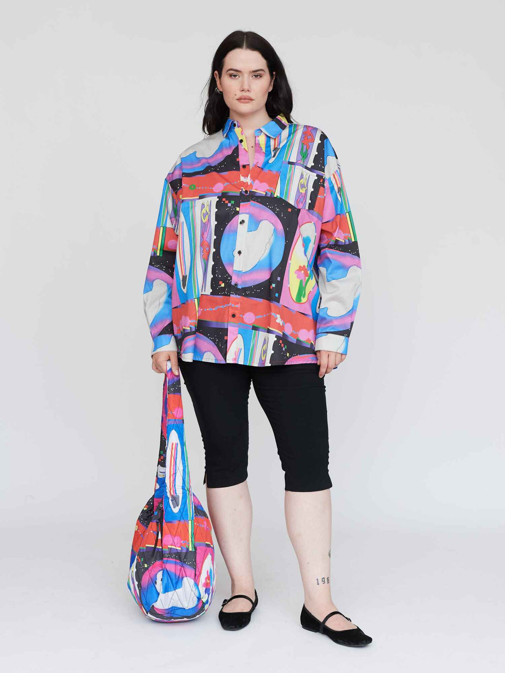 This long sleeve button up shirt is all good for making you feel dapper, without losing your individuality. With an oversized fit and a dropped shoulder, this shirt has a back yoke with box pleat detail giving it that *chefs kiss* fit along with side slits at the hem and branded buttons. Across the shirt is an all over print created by @feihuasanqian, which will be unique in placement from piece to piece. Head to coordination station and layer it over our Glitch Tie Shoulder Dress, heck, throw in the Glitched Quilted Bag for the motherlode!