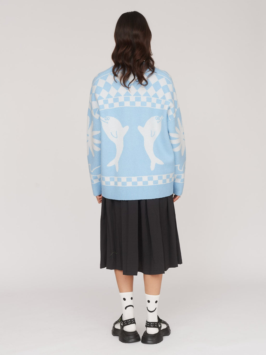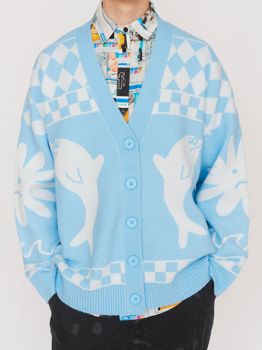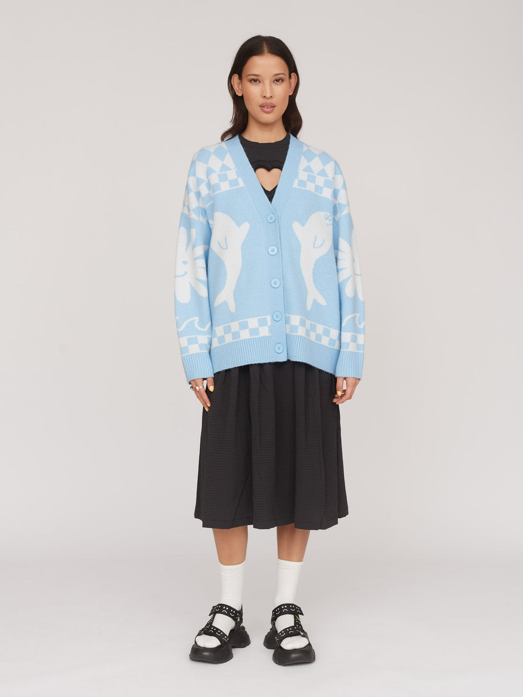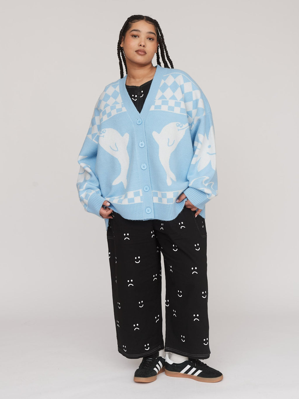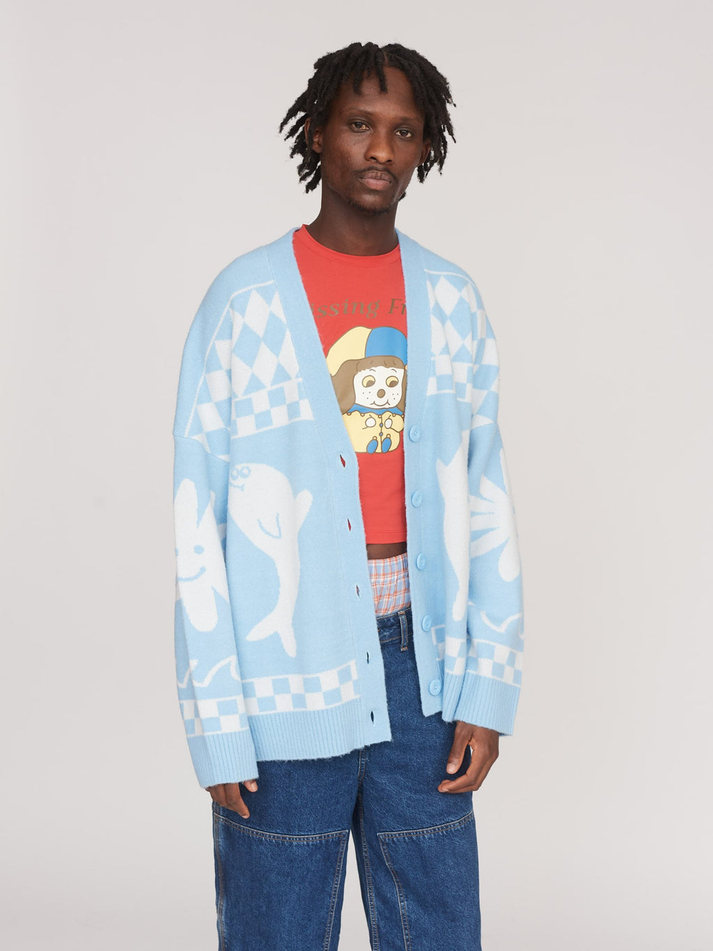Cardigans are the ideal throw on piece for the changing seasons, and we feel like we’ve got this garment down to a tee. In a super soft knit, this genderless cardigan has an oversized fit with a dropped shoulder and a classic button down front. There’s an intrasia design in contrasting white across the front, back, and sleeves. The ribbed cuffs and hem give the cardigan a great shape, as well as make sure your sleeves don’t get in the way. For the warmer days, this will be perfect worn alone but if there’s a chill in the air, why not layer a hoodie underneath for a lil extra cosiness?