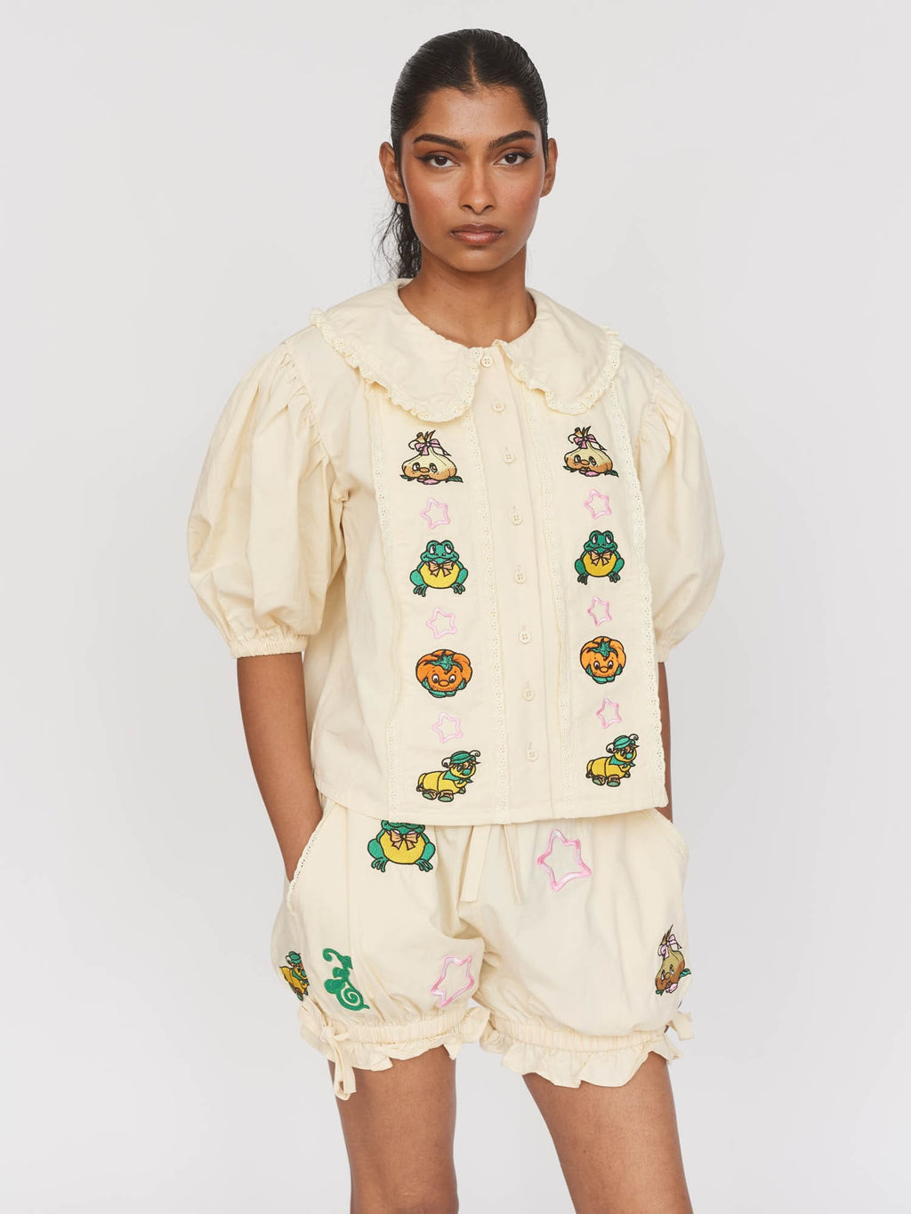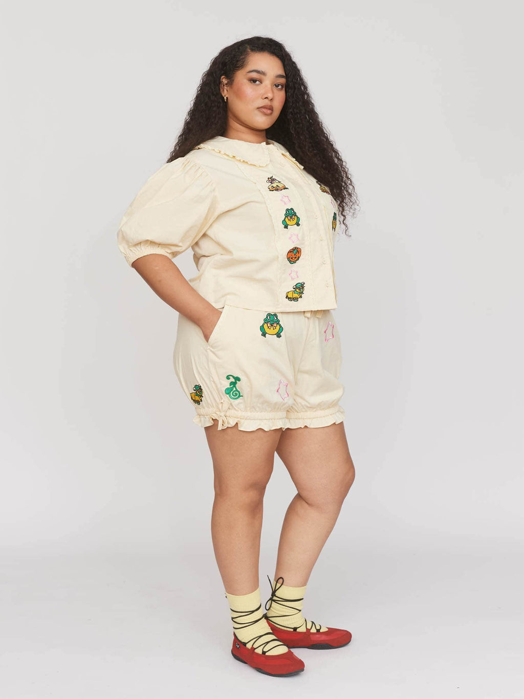 Made from 100% cotton, this shirt and bloomer set is part of our collaboration with illustrator, Hannah-Michelle. In cream, the pieces feature embroideries of her signature nostalgic characters as well as lace and ruffle trim details. This set was made for lazy days spent snacking and dozing in the sun.