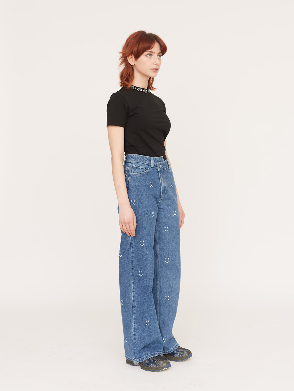 A new wardrobe essential, these jeans are one of our goes-with-everything pieces, in a classic blue denim with small embroidered Happy Sad faces all over. Setting them apart from your standard jeans is the slanted zip and button up detailing, which really stands out when you wear a tee tucked in.