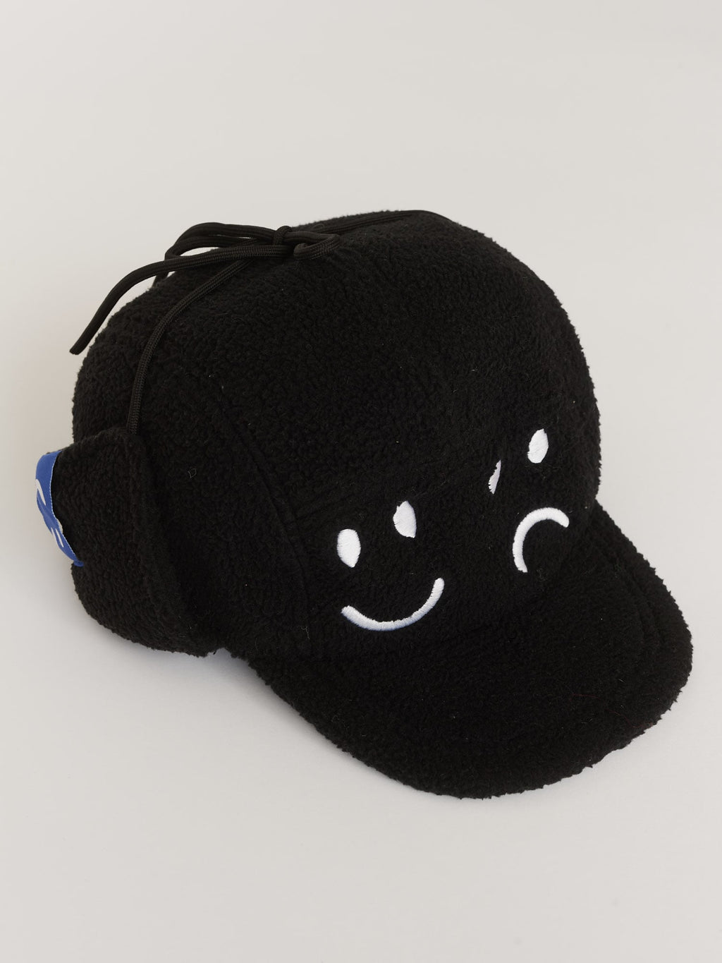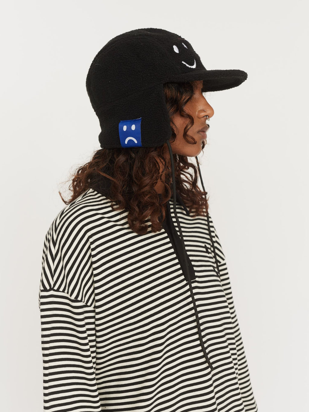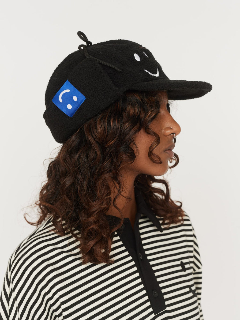Keeping your ears warm is just as important as keepin’ your head warm, which is why this cap is your winter essential. In fleece material, this fully-lined black hat is designed in a cap shape, with ear flaps that can be worn down, or tied above your head. There’s a contrasting white happy sad embroidered onto the front.