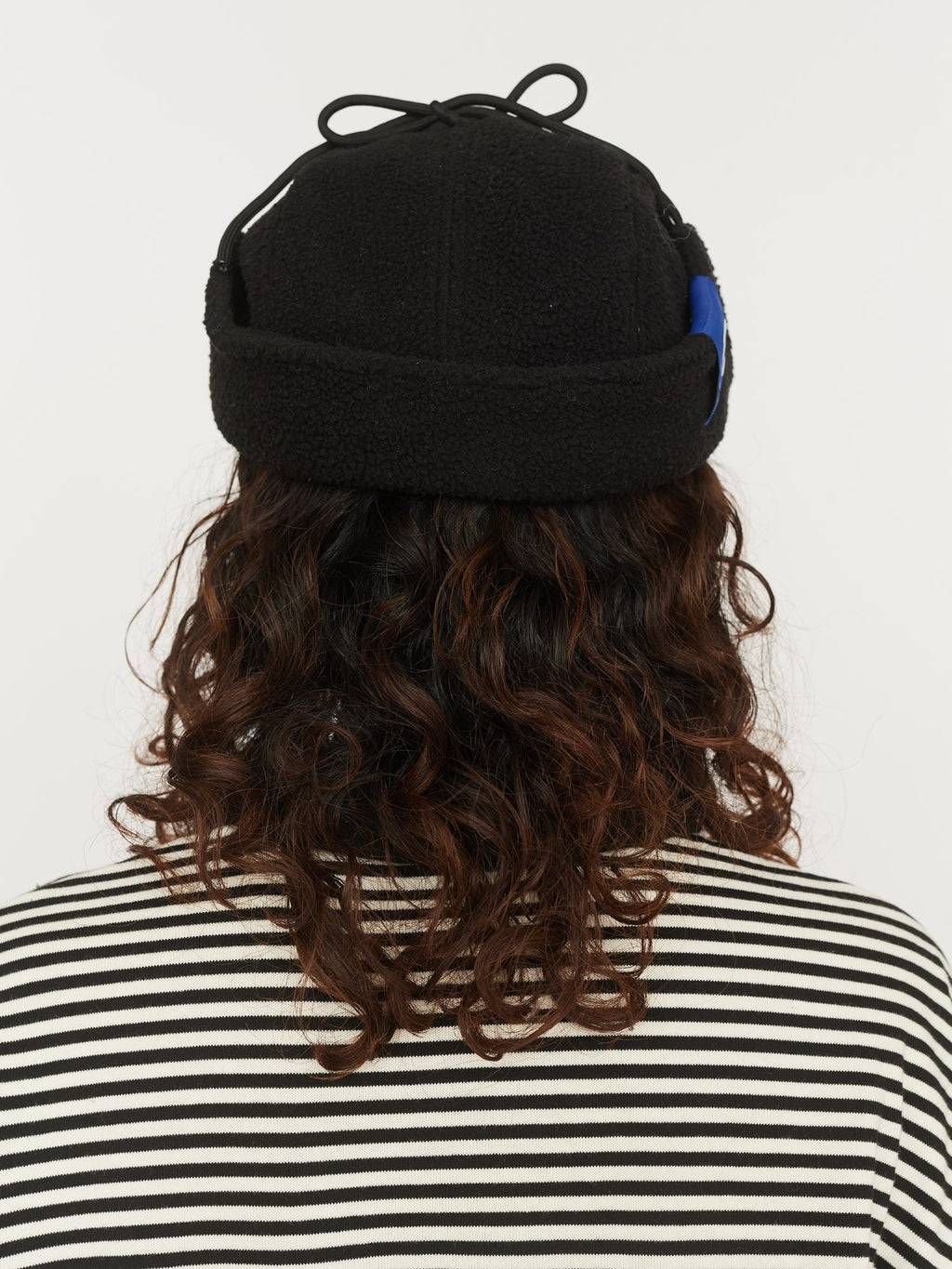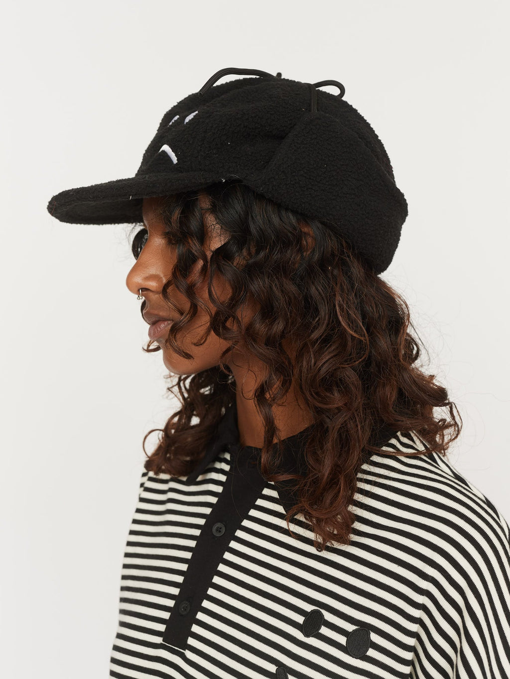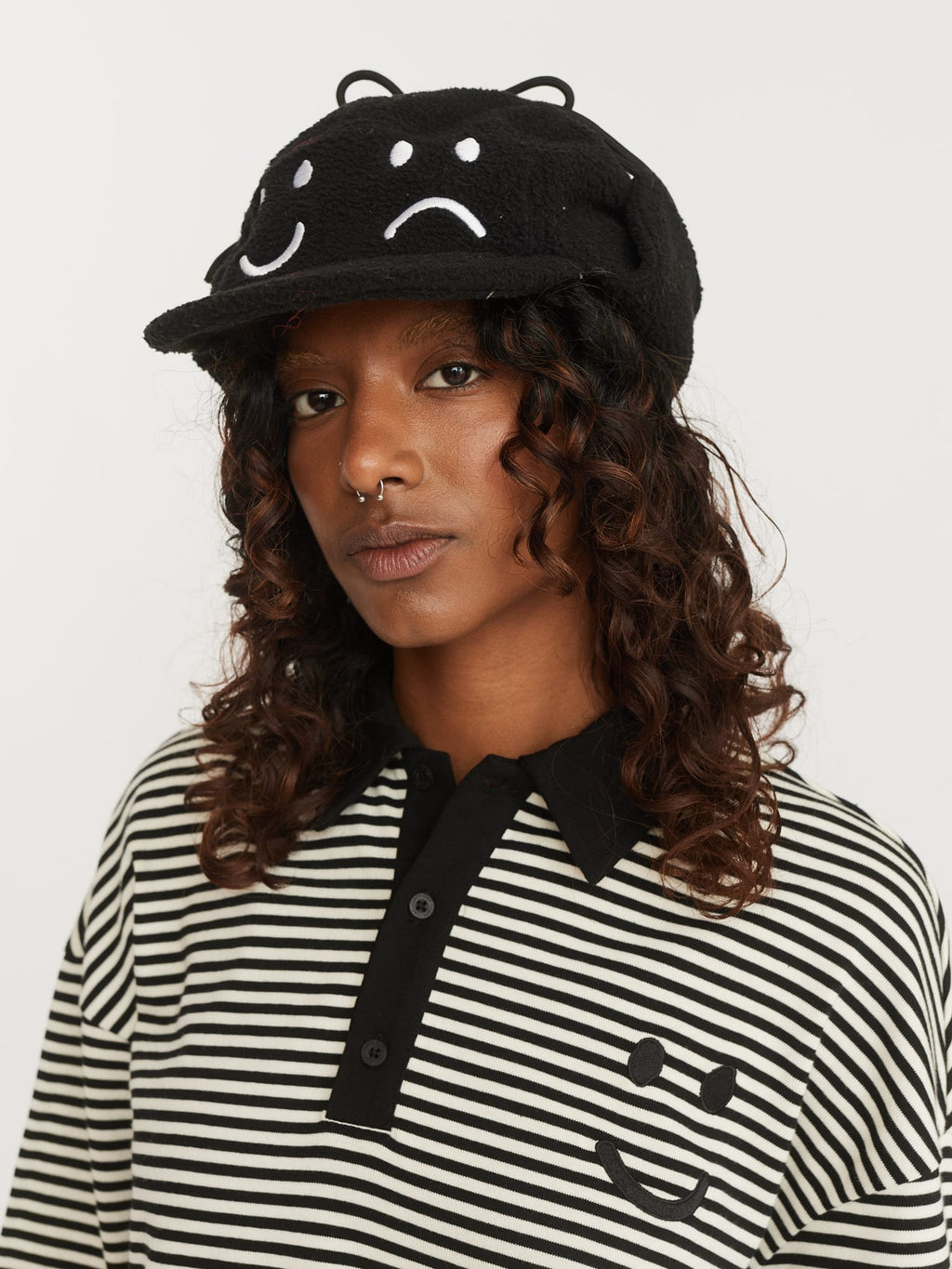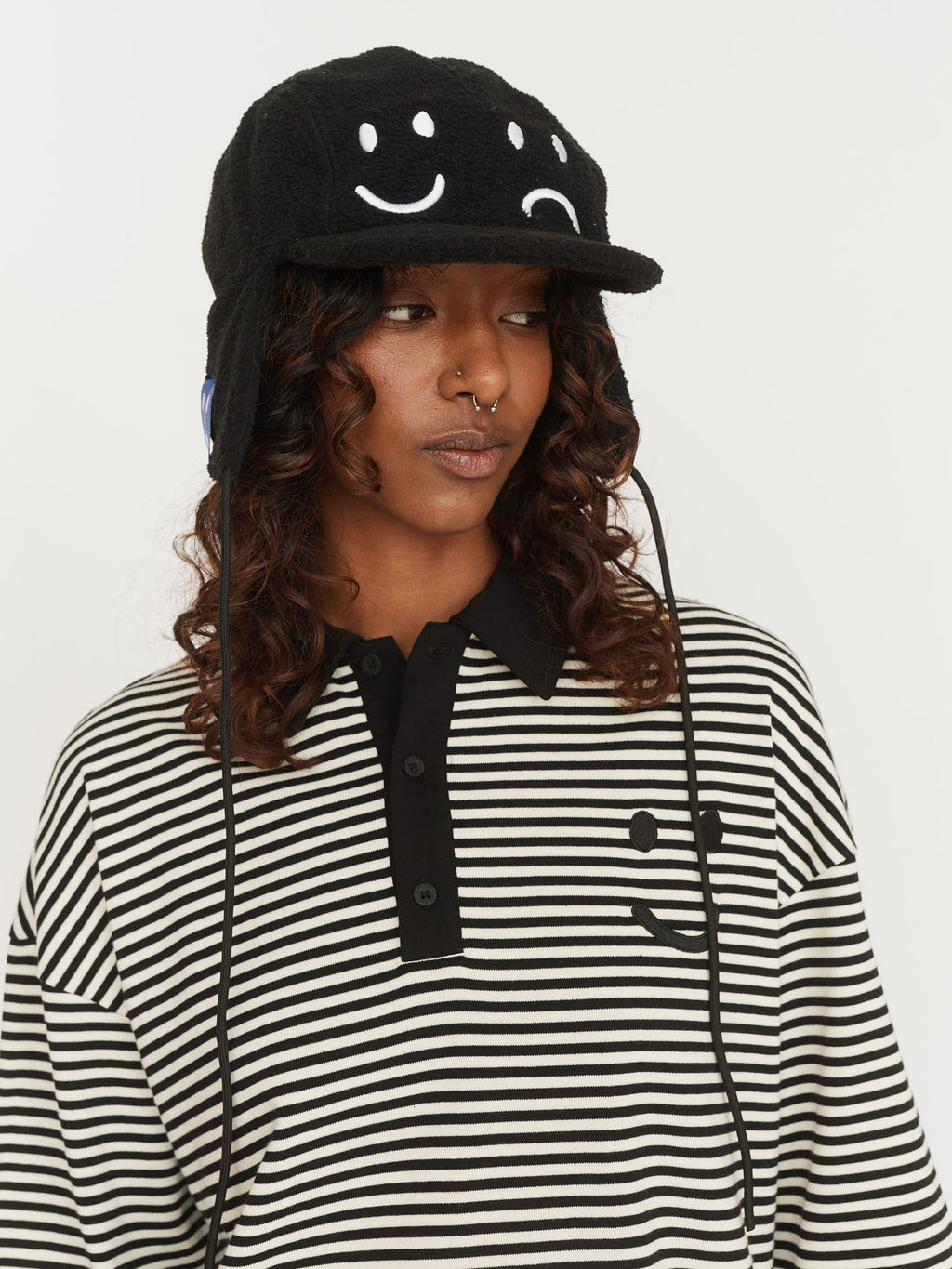 Keeping your ears warm is just as important as keepin’ your head warm, which is why this cap is your winter essential. In fleece material, this fully-lined black hat is designed in a cap shape, with ear flaps that can be worn down, or tied above your head. There’s a contrasting white happy sad embroidered onto the front.