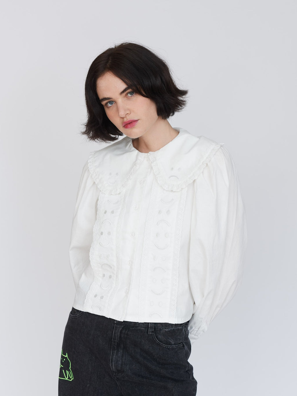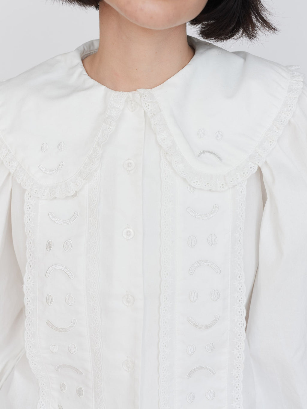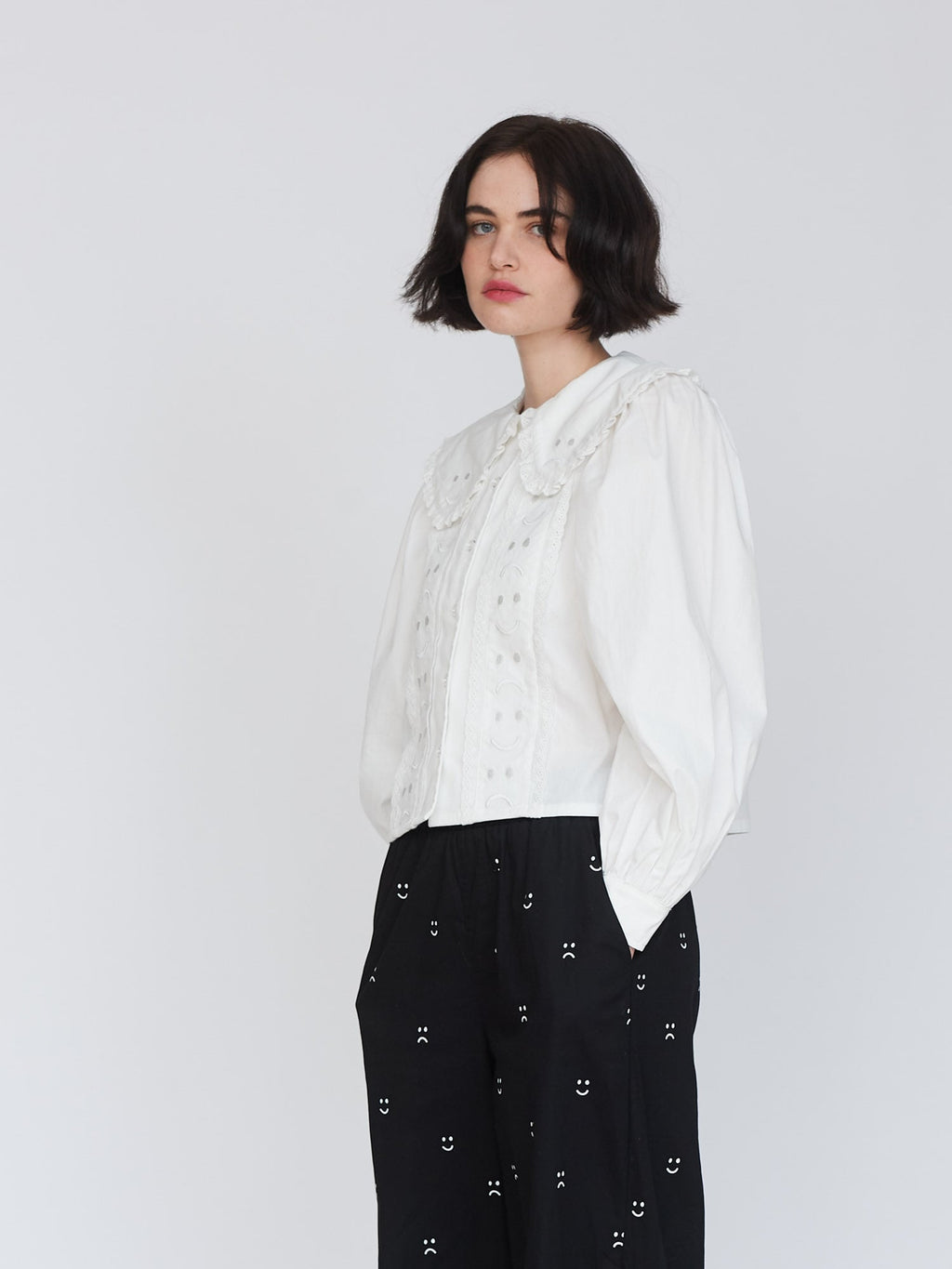 In white, this 100% cotton shirt has full sleeves around the shoulder that taper down to the button cuff. The collar is oversized and features Happy Sad embroidery on it in white too, giving it an embossed look. This is also repeated on the front panels with both the collar and panels having a broderie anglaise style lace trim. Why not layer our Happy Sad Cord Waistcoat over the top?
