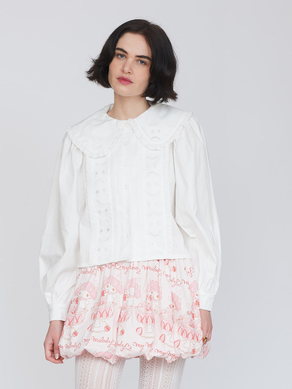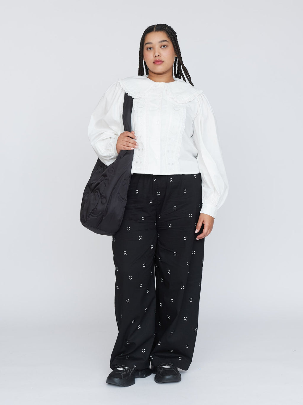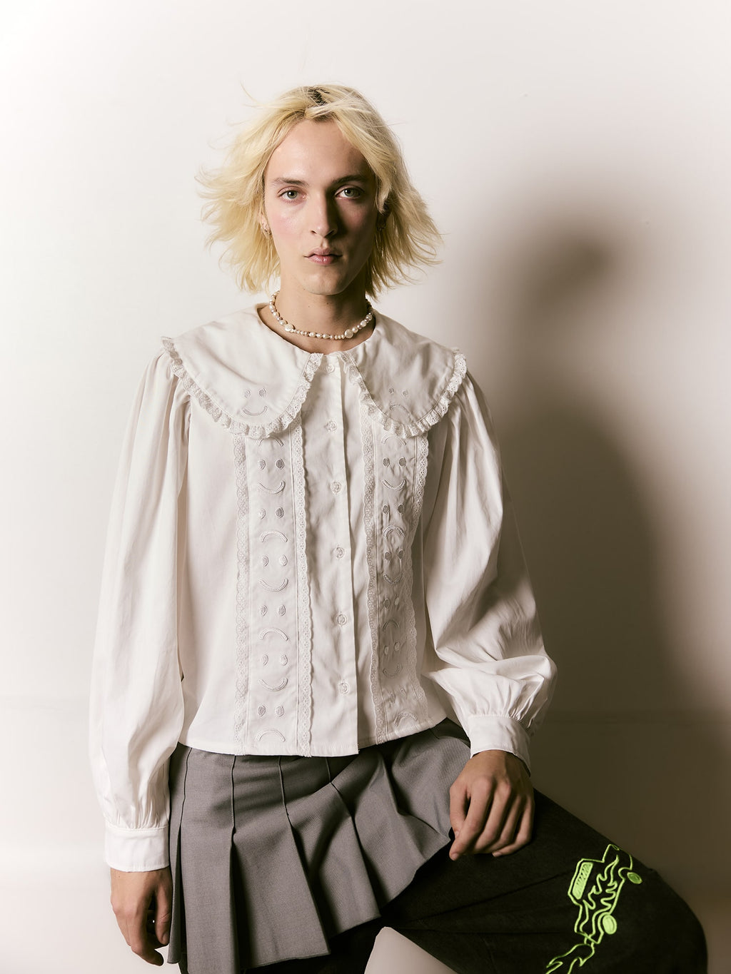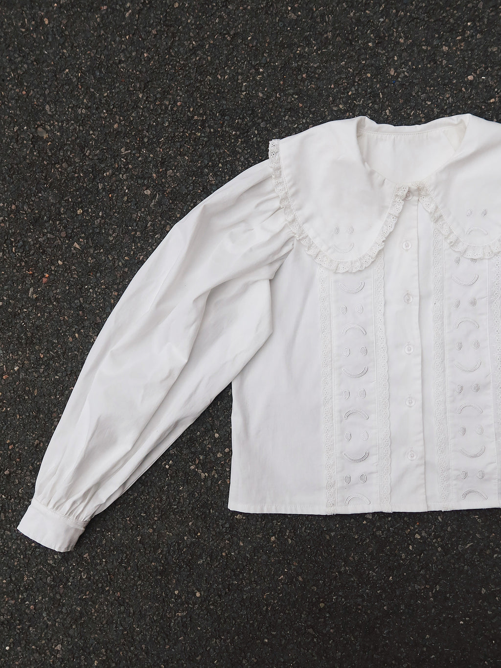 In white, this 100% cotton shirt has full sleeves around the shoulder that taper down to the button cuff. The collar is oversized and features Happy Sad embroidery on it in white too, giving it an embossed look. This is also repeated on the front panels with both the collar and panels having a broderie anglaise style lace trim. Why not layer our Happy Sad Cord Waistcoat over the top?