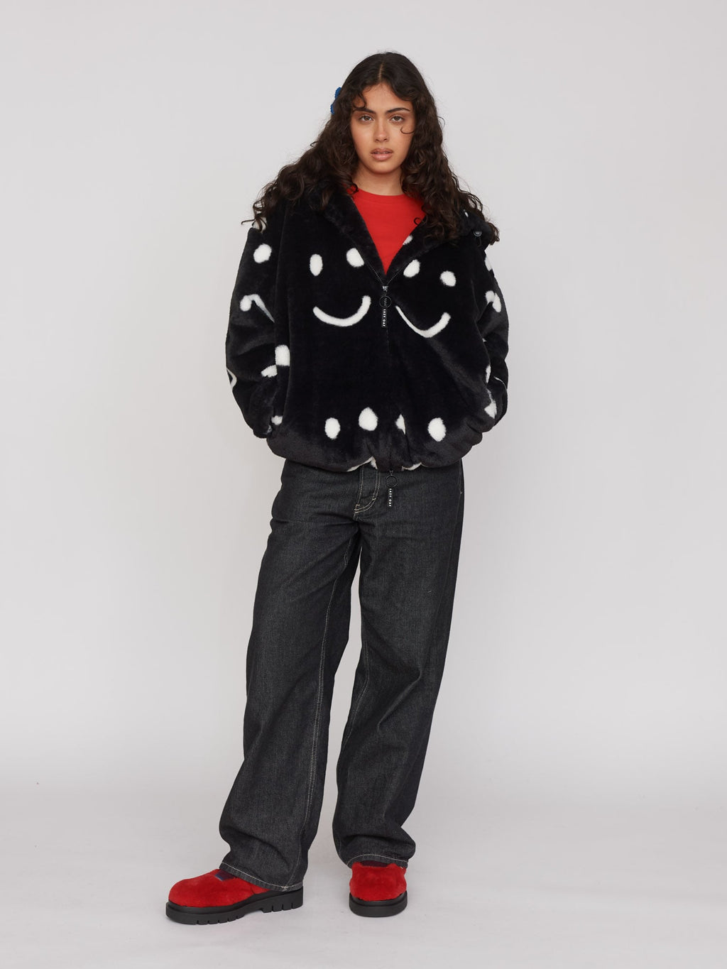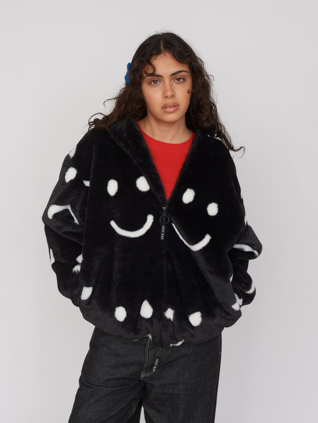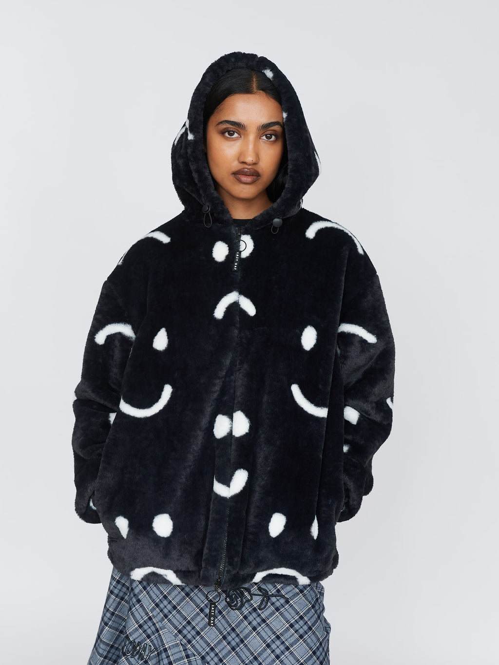 In an all over Happy Sad print, this faux fur hooded jacket is fully lined and has a double ended zip with ring, and brand tab, pullers. At the hem and hood are elasticated drawcords with pig nose toggles then the cuffs are ribbed to keep all the warmth in, and the cold out. Complete your Happy Sad ensemble by pairing with our Happy Sad Faux Fur Bag and Trapper Hat.