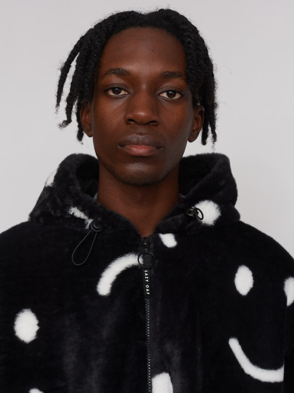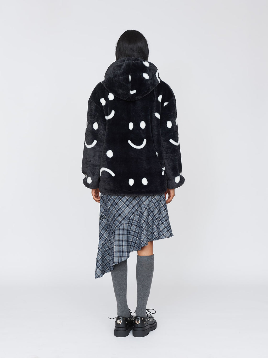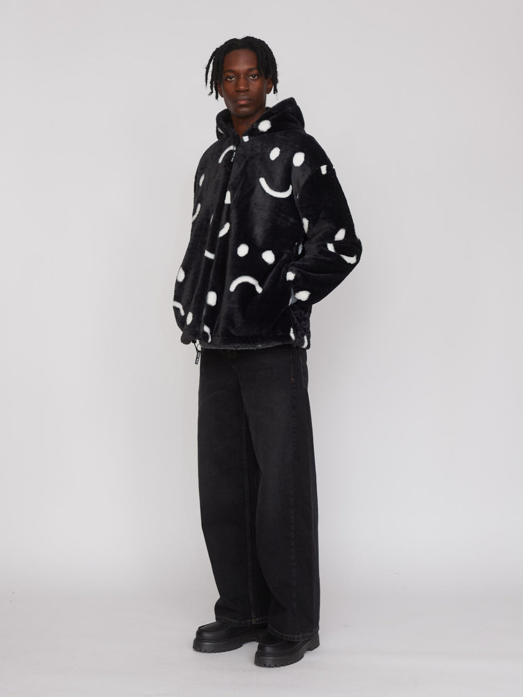 In an all over Happy Sad print, this faux fur hooded jacket is fully lined and has a double ended zip with ring, and brand tab, pullers. At the hem and hood are elasticated drawcords with pig nose toggles then the cuffs are ribbed to keep all the warmth in, and the cold out. Complete your Happy Sad ensemble by pairing with our Happy Sad Faux Fur Bag and Trapper Hat.