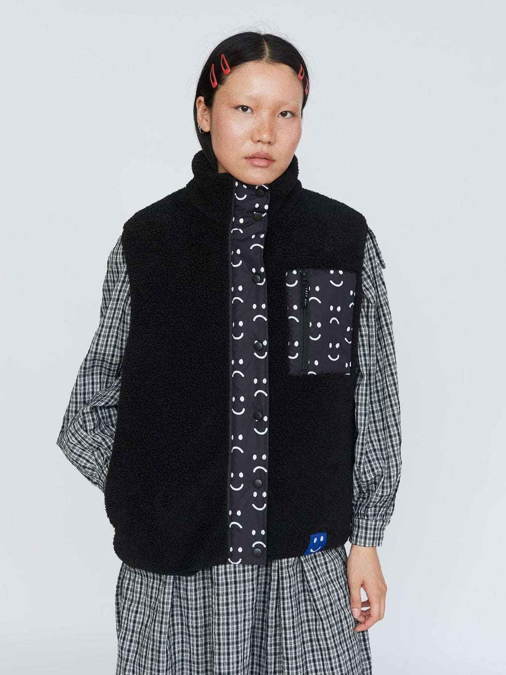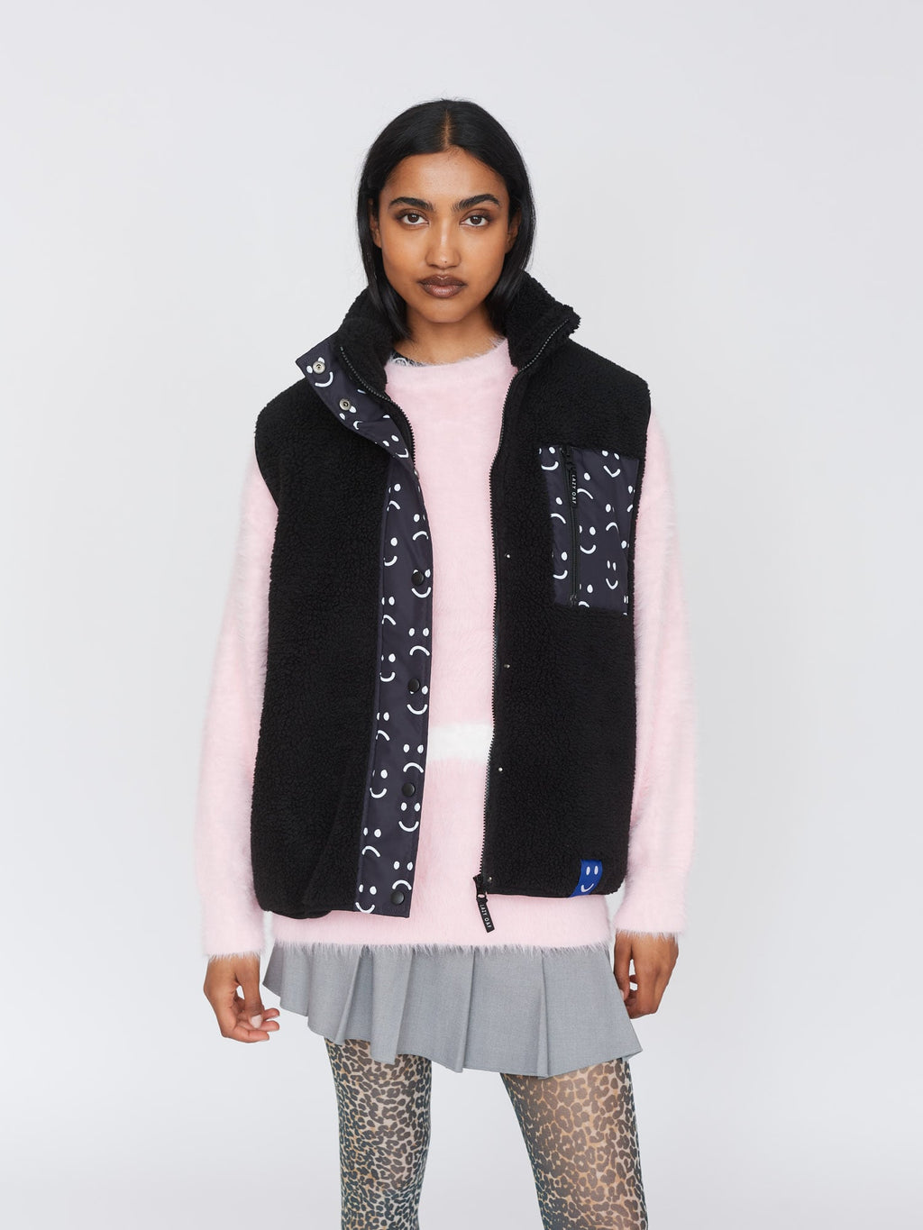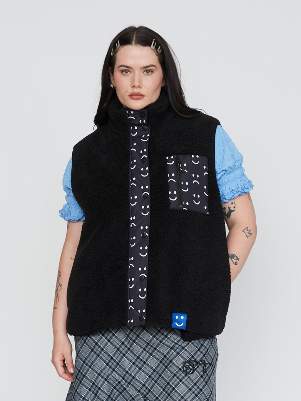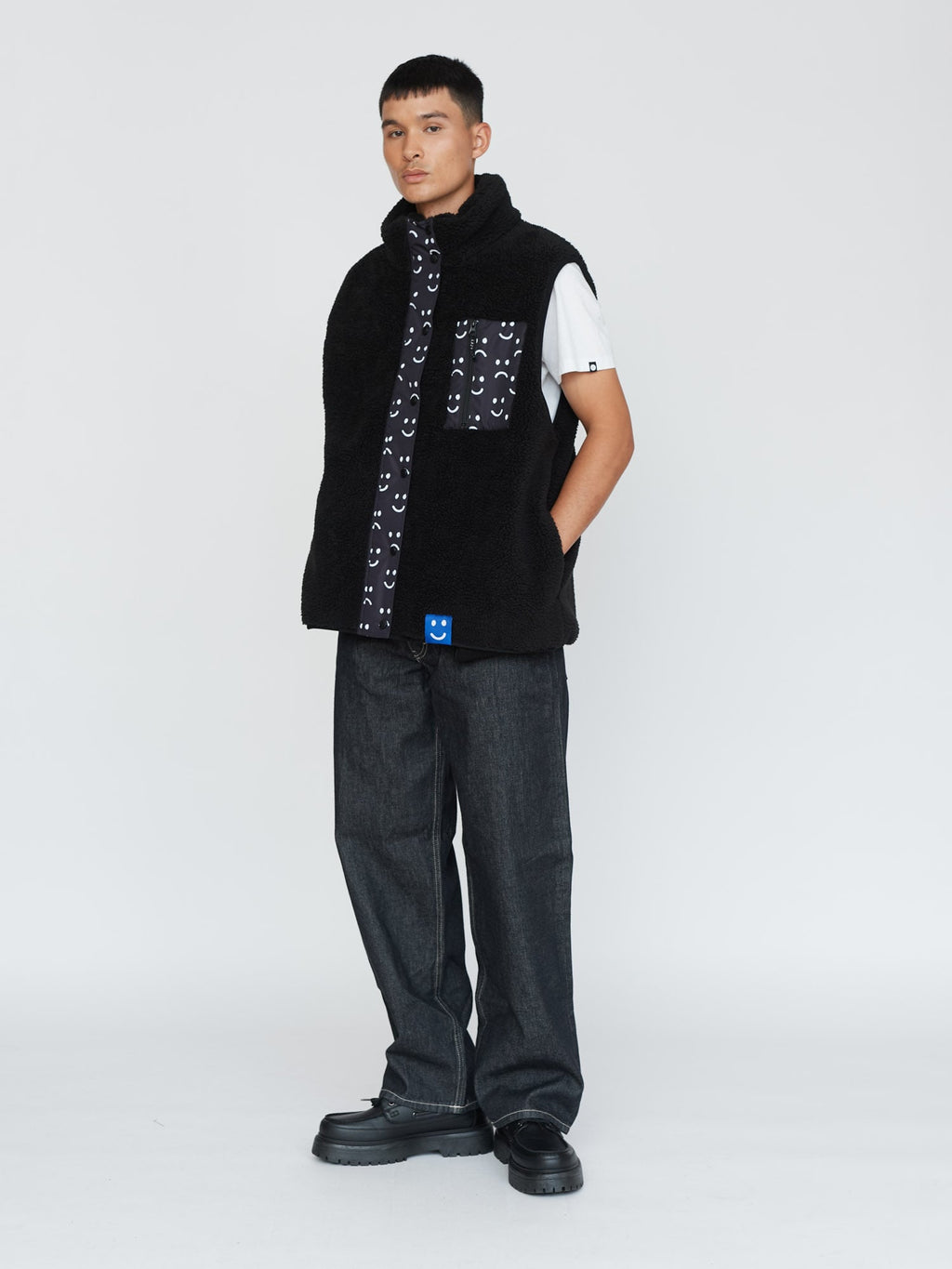 A gilet, the perfect piece for those days where a coat’s too much but a jumper is too little and this one will be the perfectly tempered layer you’ve been searching for. Fully lined and in black sherpa fleece material, the gilet is sleeveless with a high neck. The nylon placket features our Happy Sad print which conceals the zip, and is fastenable by black metal poppers. On the left of the chest is a matching Happy Sad nylon zip pocket, there’s also side seam pockets too, and it’s finished with a blue woven label at the hem. Chuck on top of Happy Sad Jacquard Collar tee for the full mixed emotions look.