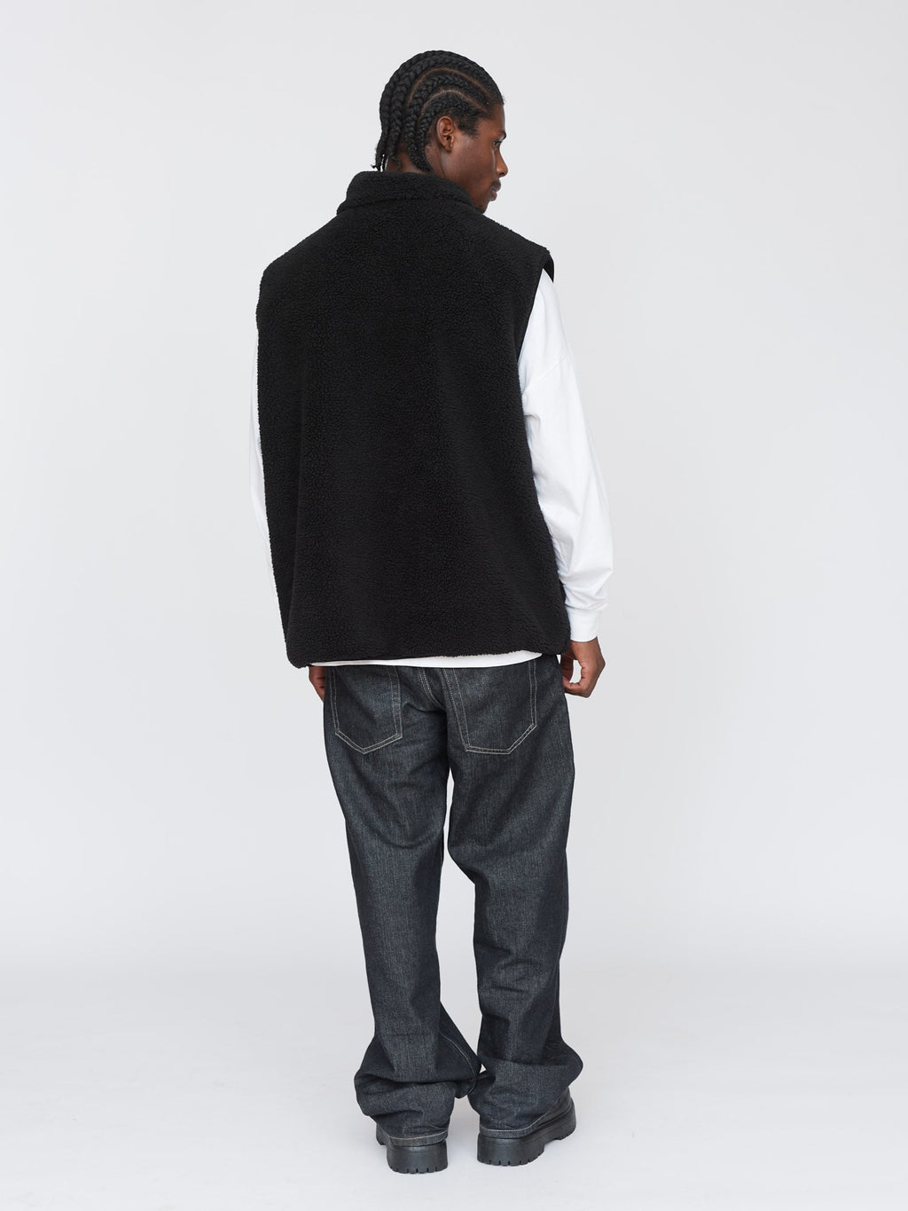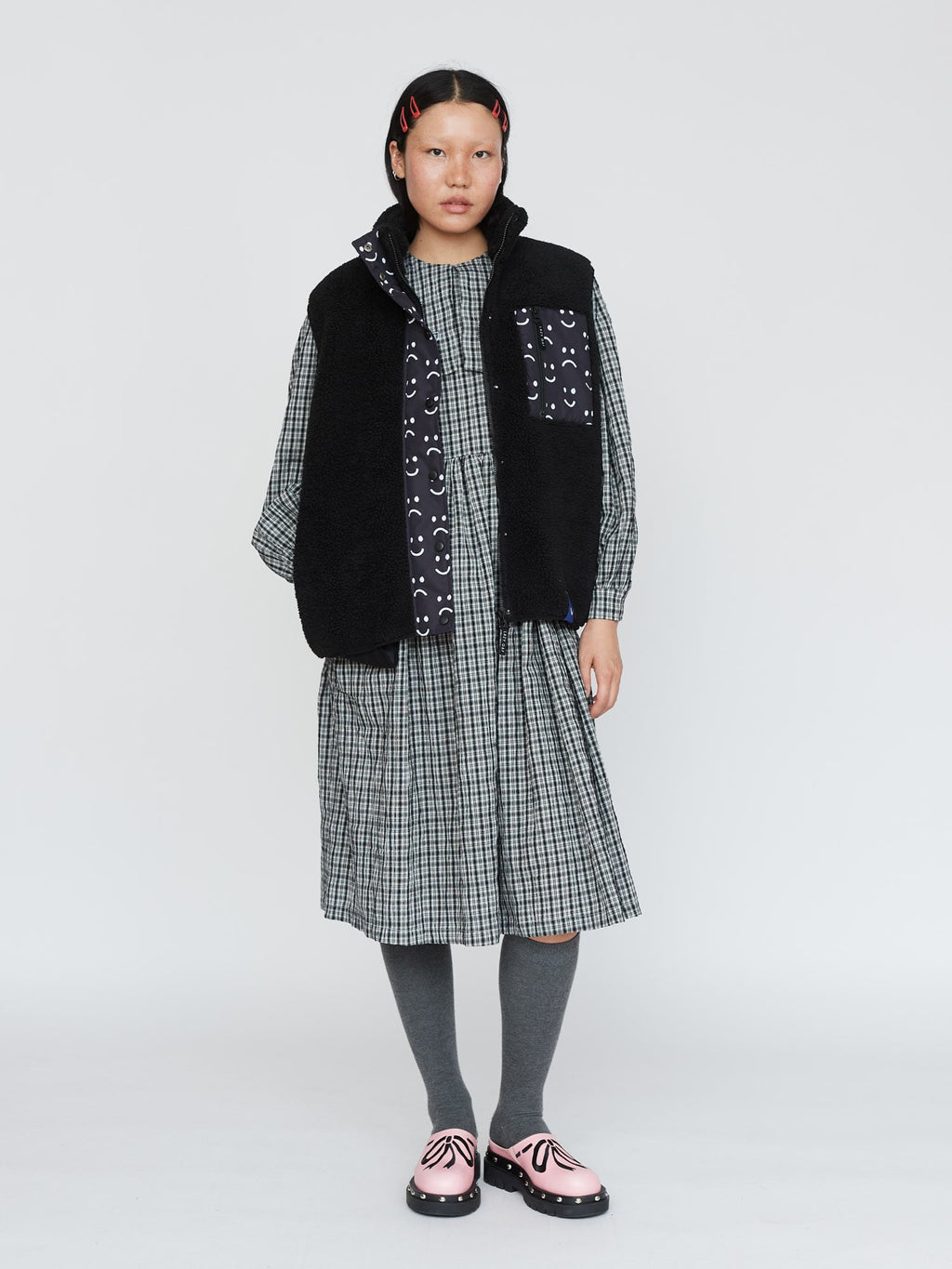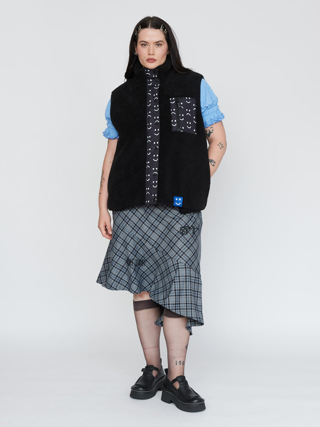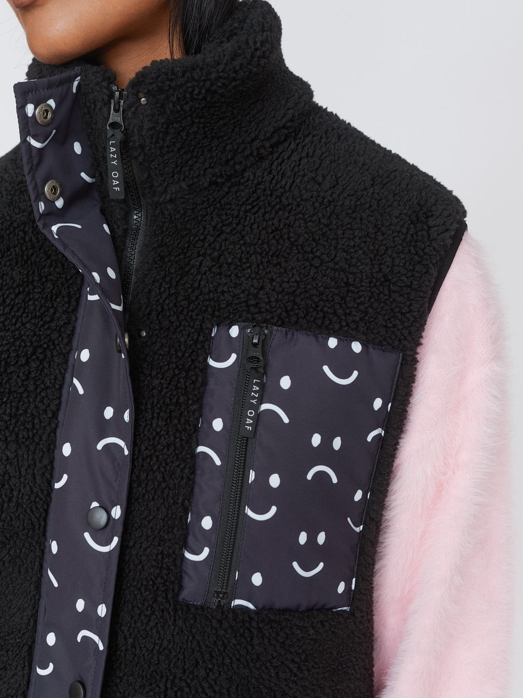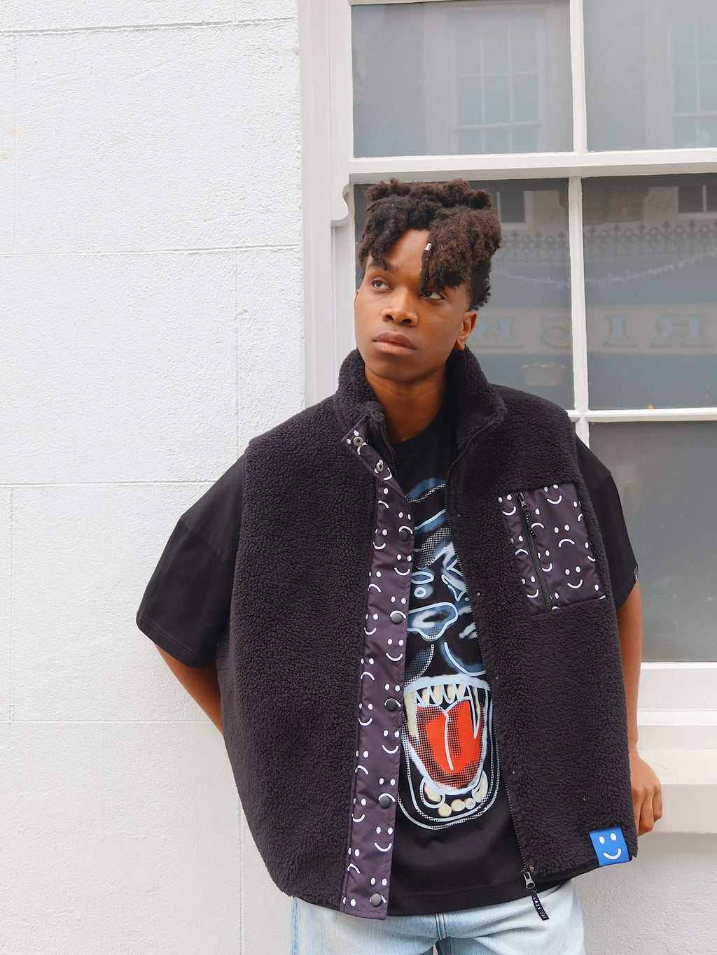 A gilet, the perfect piece for those days where a coat’s too much but a jumper is too little and this one will be the perfectly tempered layer you’ve been searching for. Fully lined and in black sherpa fleece material, the gilet is sleeveless with a high neck. The nylon placket features our Happy Sad print which conceals the zip, and is fastenable by black metal poppers. On the left of the chest is a matching Happy Sad nylon zip pocket, there’s also side seam pockets too, and it’s finished with a blue woven label at the hem. Chuck on top of Happy Sad Jacquard Collar tee for the full mixed emotions look.