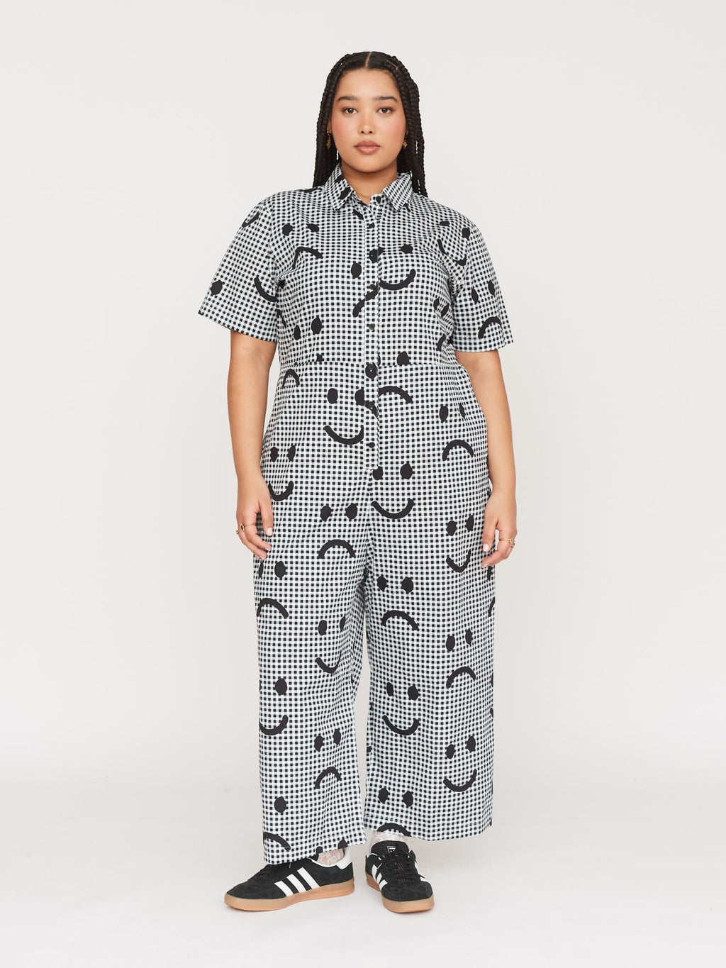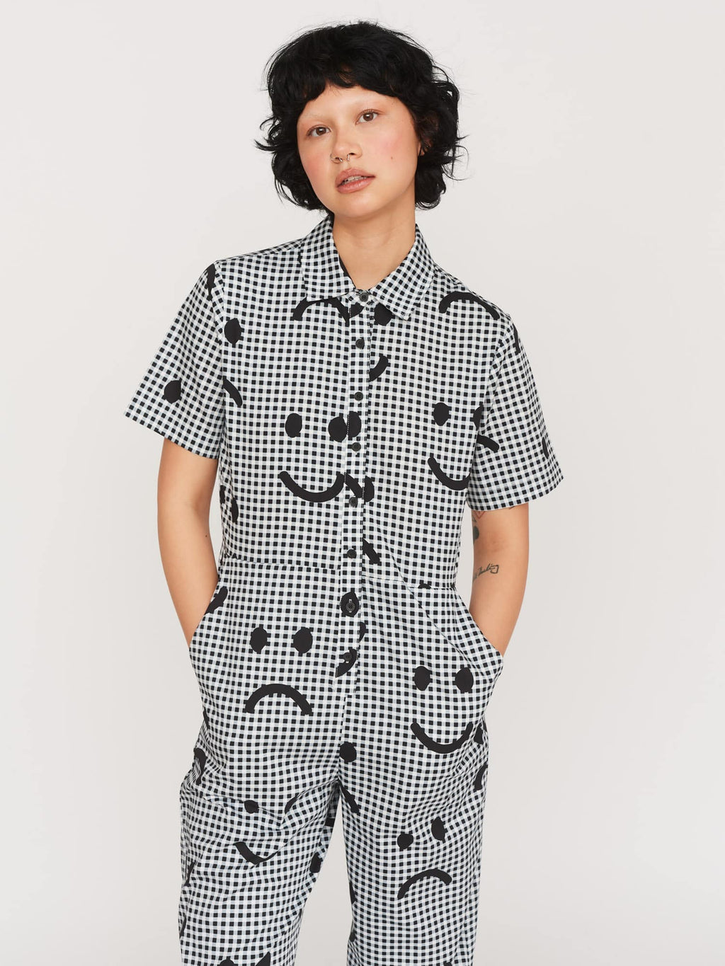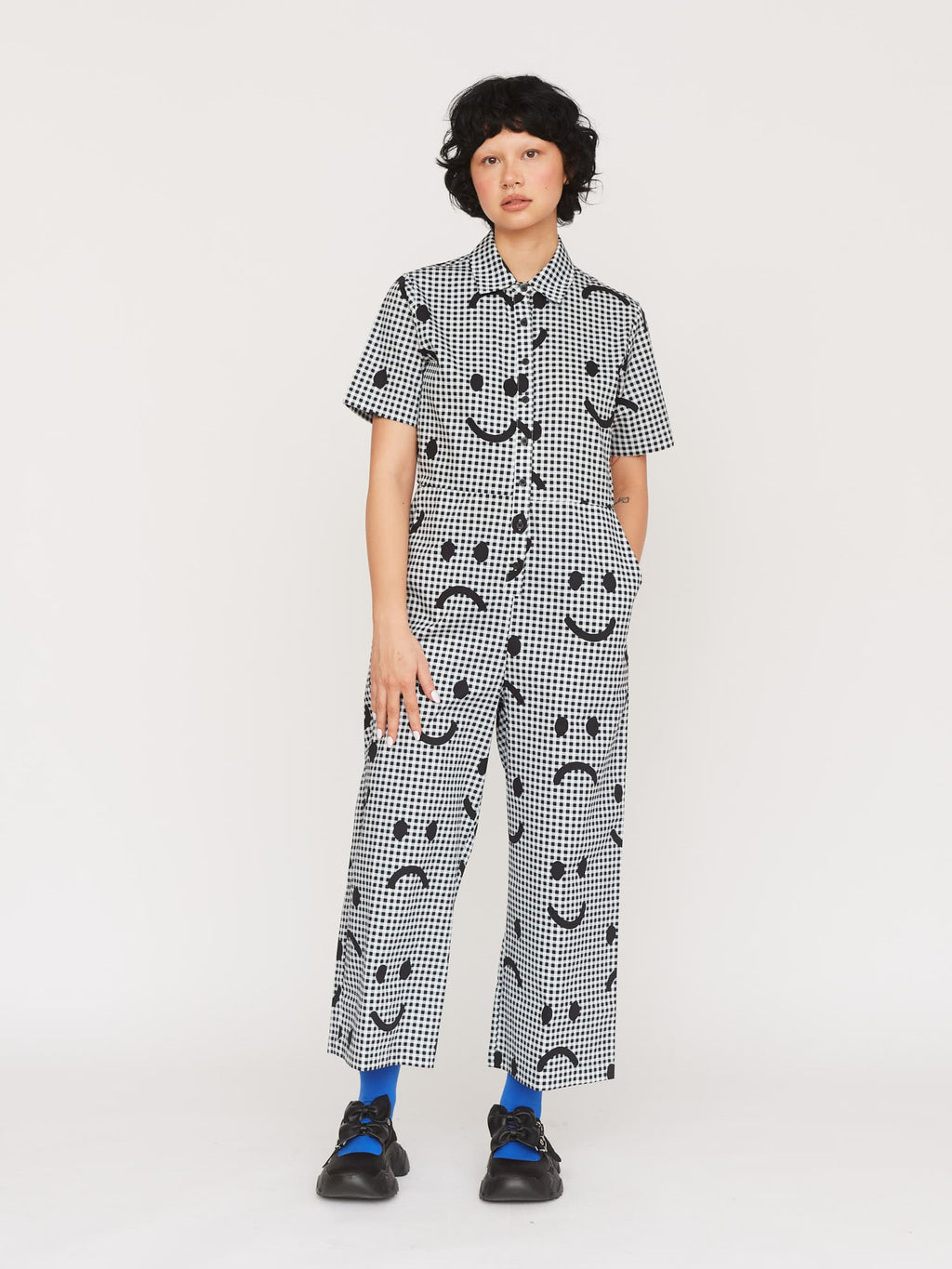 For the day’s when your mind is too scrambled to think about what to wear, reach for your trusty jumpsuit. Our best-selling Happy Sad Gingham Dress’s leggy cousin; this short-sleeved jumpsuit is in an all over happy sad gingham print, with a wide leg. On the hips, and back, you can find side seam and back patch pockets respectively. In a breathable 100% cotton, you can take this piece through all the seasons to show off that you’ve got a lot of feelings. A lot.