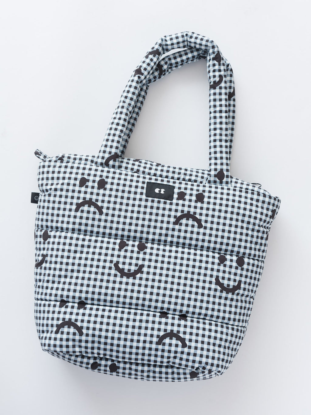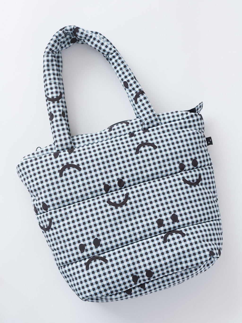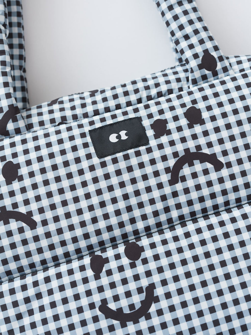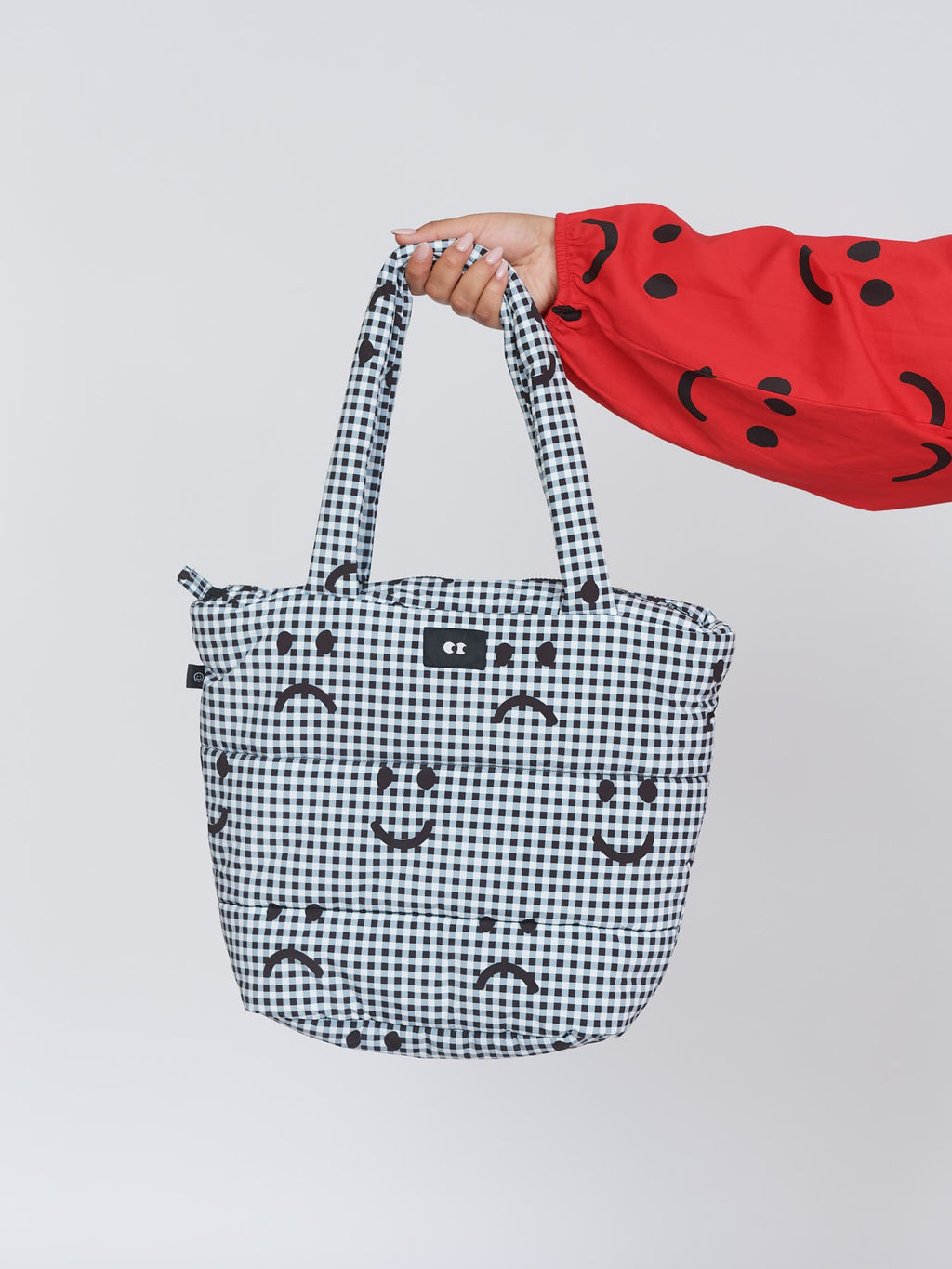 This quilted, puffer bag has a zip closure with a ring puller and the ideal sized strap to pop on your shoulder. Fully lined, it has an internal slip pocket which’ll be perfect for your phone, wallet or whatever trinkets you need to hand. At 35cm in height, it can fit a laptop up to 17” so will be the perfect size for work or being on-the-go. In an all over Happy Sad gingham print, with Oaf patch and pip labelling, this bag will be the perfect wardrobe addition.