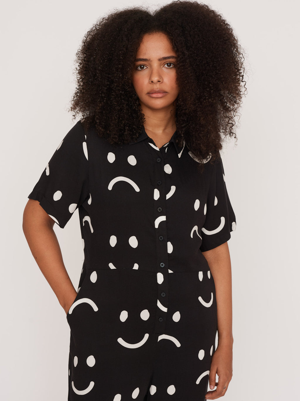 This Happy Sad Jumpsuit features a classic, button up shirt-style with short sleeves and wide fit legs for comfort. This will be your go to wardrobe essential and perfect for all seasons.The details:- Short sleeve happy sad jumpsuit