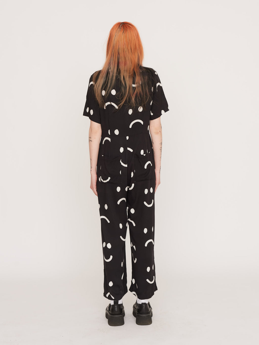 This Happy Sad Jumpsuit features a classic, button up shirt-style with short sleeves and wide fit legs for comfort. This will be your go to wardrobe essential and perfect for all seasons.