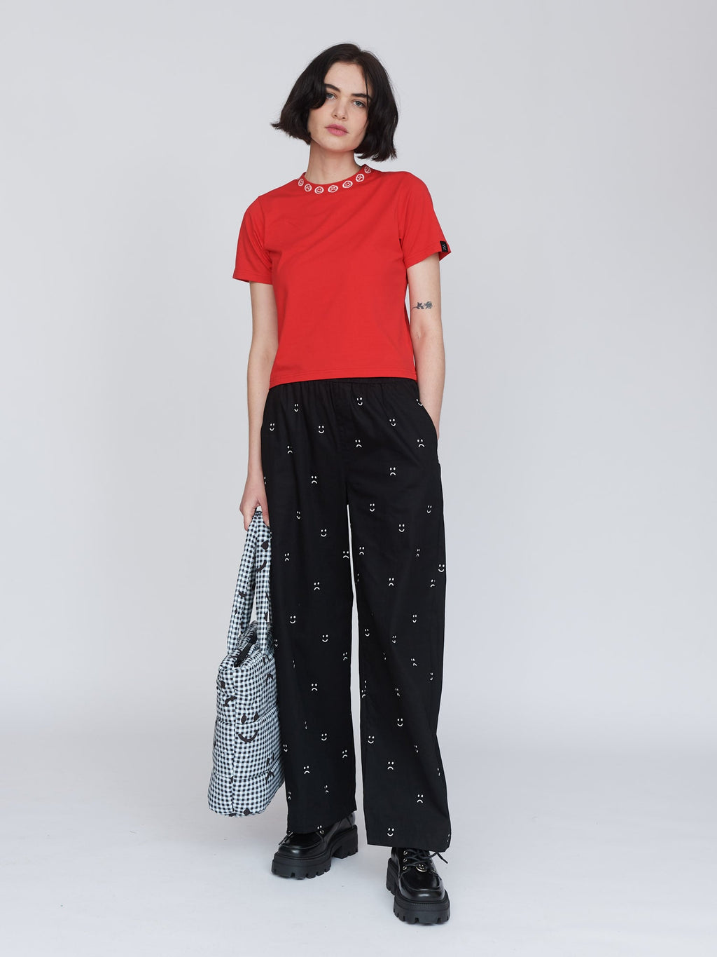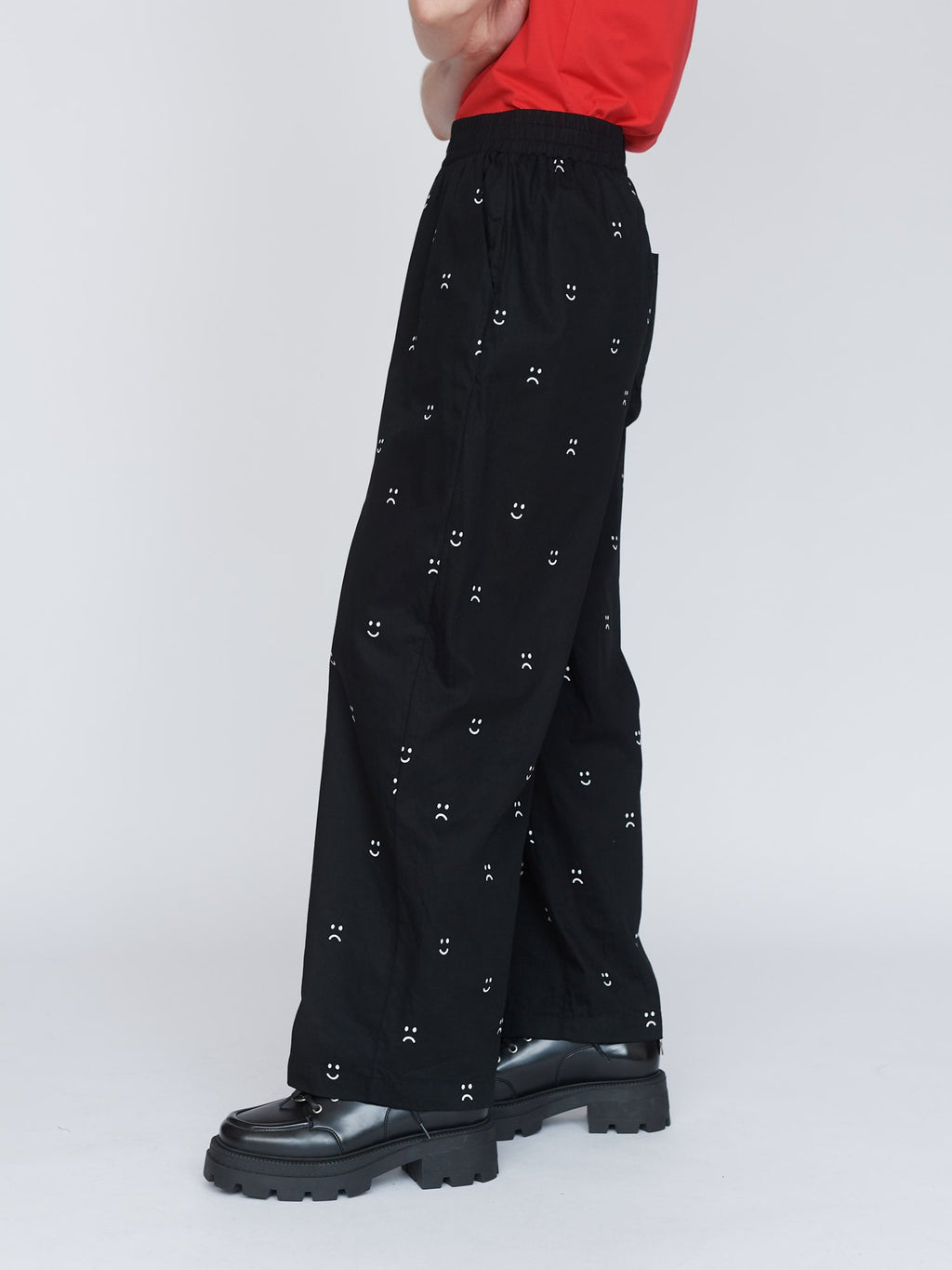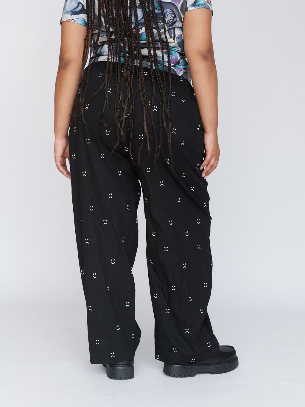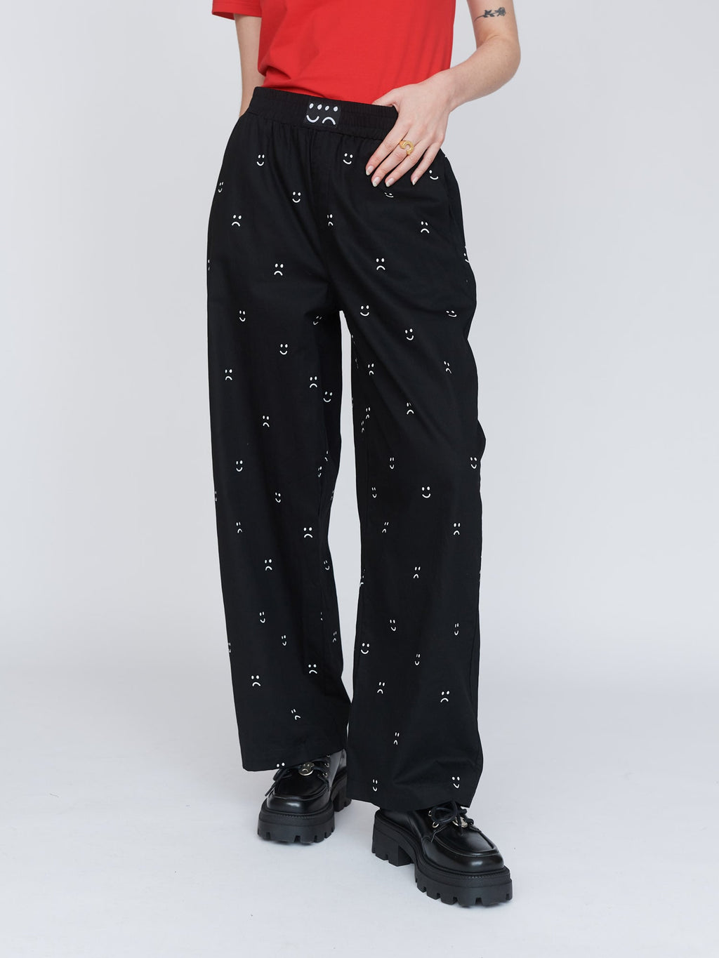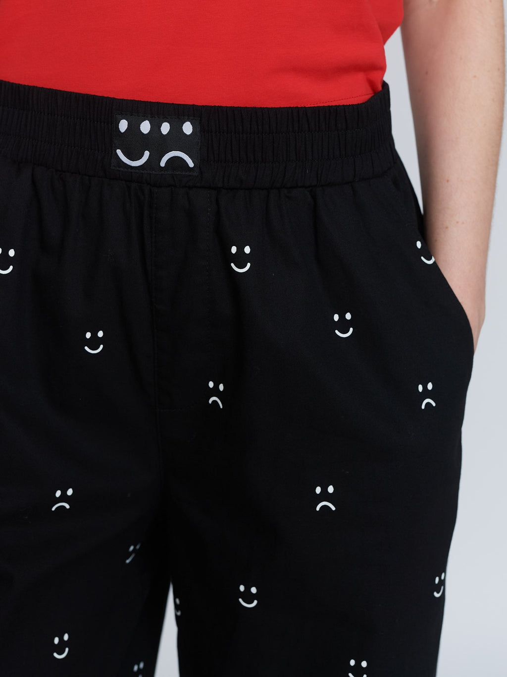 In black, these straight leg pull on trousers have a relaxed fit with a fully elasticated waistband. Sitting at mid-rise, they have an all over print of our bestselling Happy Sad print, as well as a Happy Sad Patch label on the waistband. Nothing is complete without pockets, so these trousers have side seam ones, and a back patch one. If all you ever crave from a pair of trousers is the same comfort as your favourite PJ bottom, these are the pants for you. Plus they’ve got a matching top, the Happy Sad Tie Front Top, what more could you ask for?
