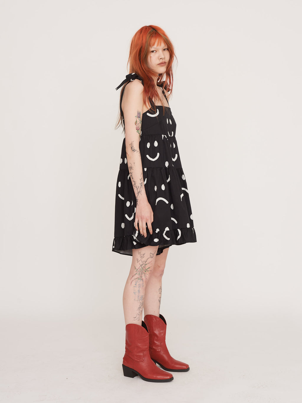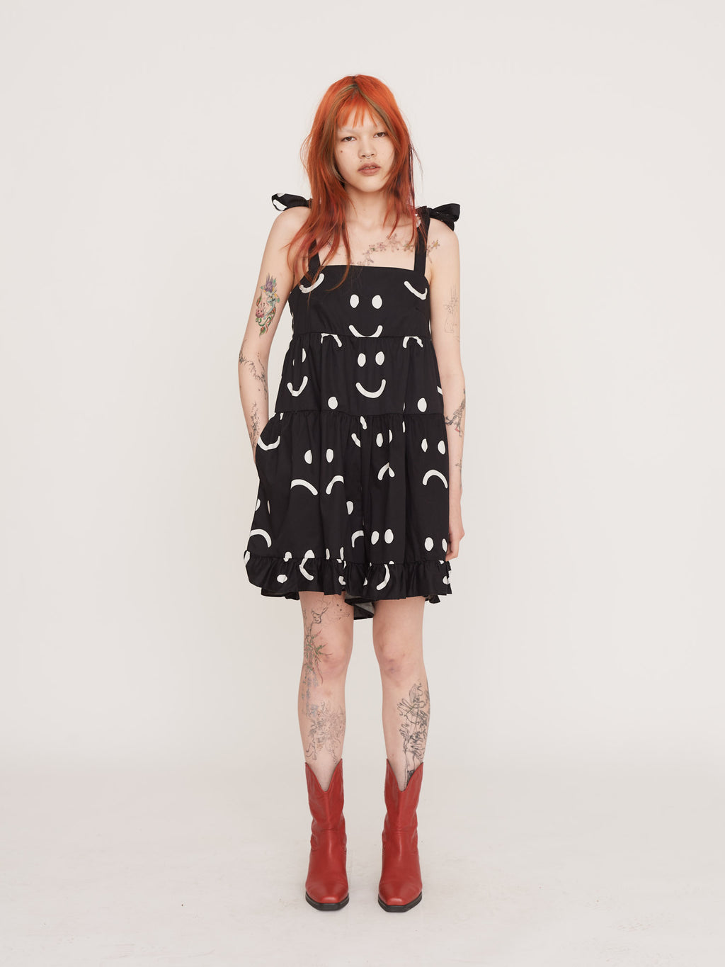 This is going to be a summer essential, ready to be thrown on for last minute pub plans. In our signature happy sad print, this is a relaxed and loose fit romper, with a tiered body and a ruffled hem, plus adjustable tie shoulders, which means you can change the fit to what’s comfortable for you.