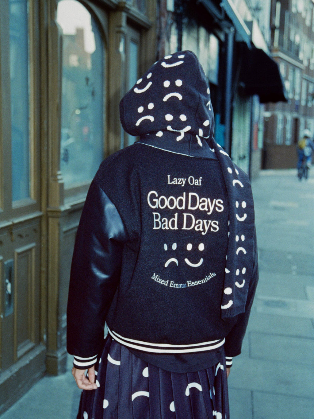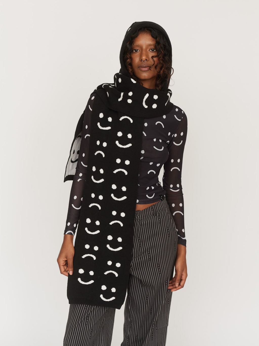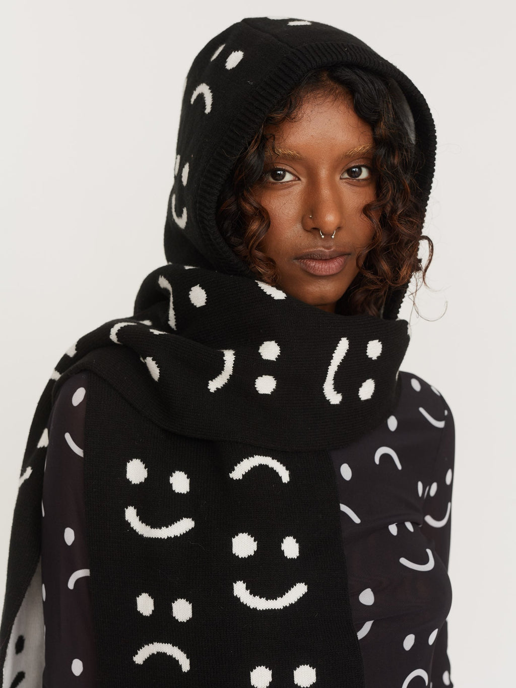 This new style is taking everything you know and love about a snood, to a whole new level. In a cotton knit blend, with an all over intarsia happy sad design, this scarf features a built in hood. The heavier weight of the fabric helps it sit perfectly as a scarf or hood, and the inside features a contrasting white with black happy sad design. This is going to be your cold weather hero.