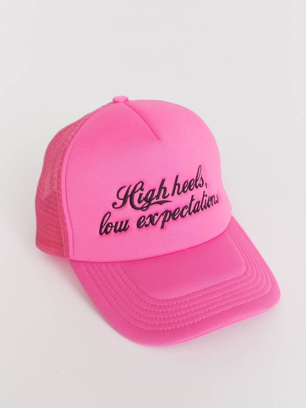 In bright pink, this trucker style cap has a curved peak with mesh back panels as well as an adjustable fastener. On the front it has embroidered text in contrasting black; block out the sun and unwanted vibes with this cap.