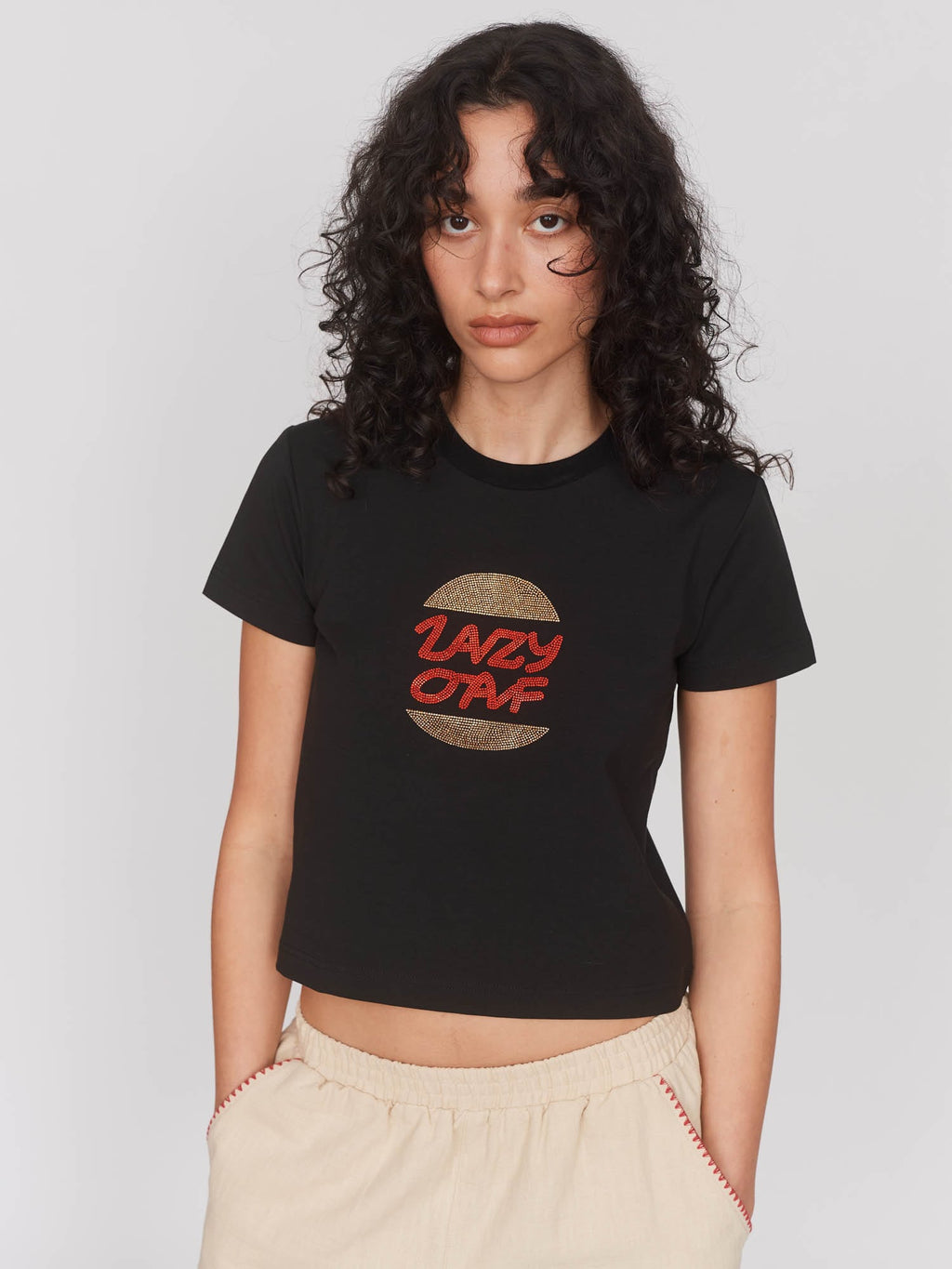 Our fitted tees are one of our bestselling shapes for a reason. Made from a cotton elastane blend which means it’ll keep its shape wash after wash, it has a ribbed neck with our signature Oaf pip label at the cuff. In black, it features an in-house designed graphic on the chest with hot fix gems. Pair with our Tan Lines Shorts and you’ll be ready to take in the sights of Barcelona or Butlins.