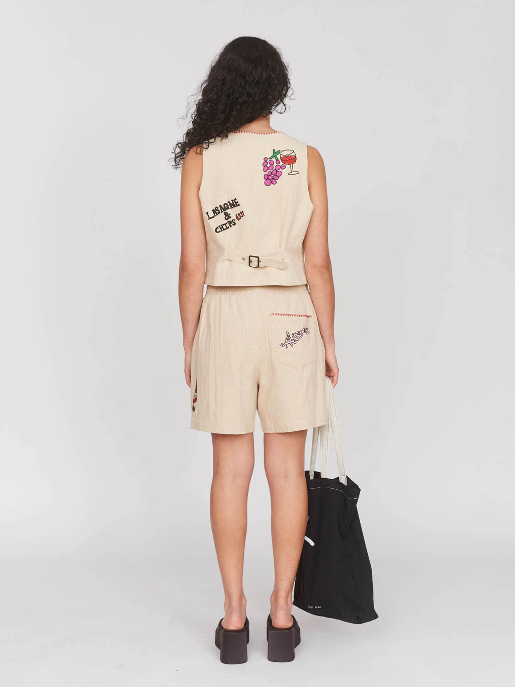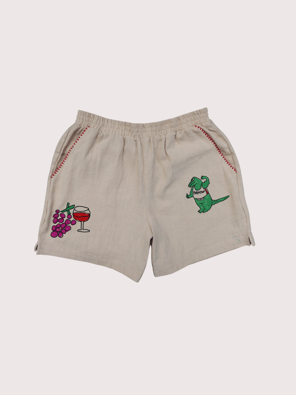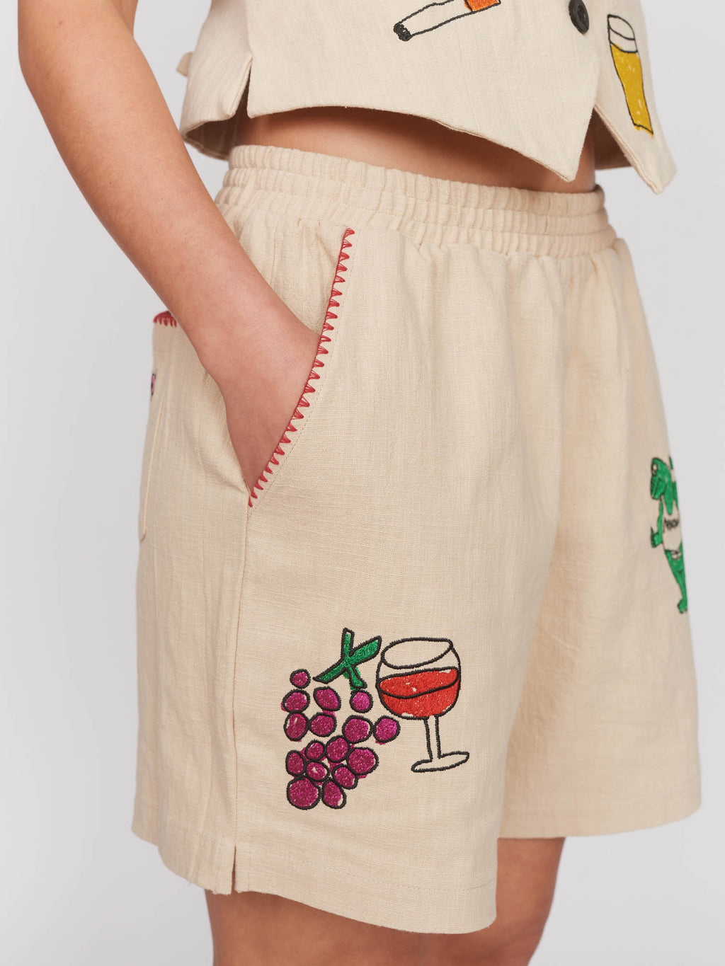 These pull on shorts are what you’re going to be living in all summer long. In beige, they are made from a textured cotton and raime blend fabric so they’re breathable and lightweight, perfect for the sweltering days. They have a fully elasticated waist with side seam pockets as well as side seam slits at the hem. Featuring all over embroidery details; co-ordinate them with our Karaoke Song Waistcoat and you’ll be ready to go from the beach straight to the strip.