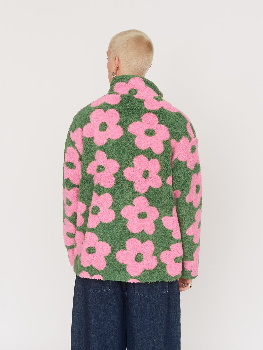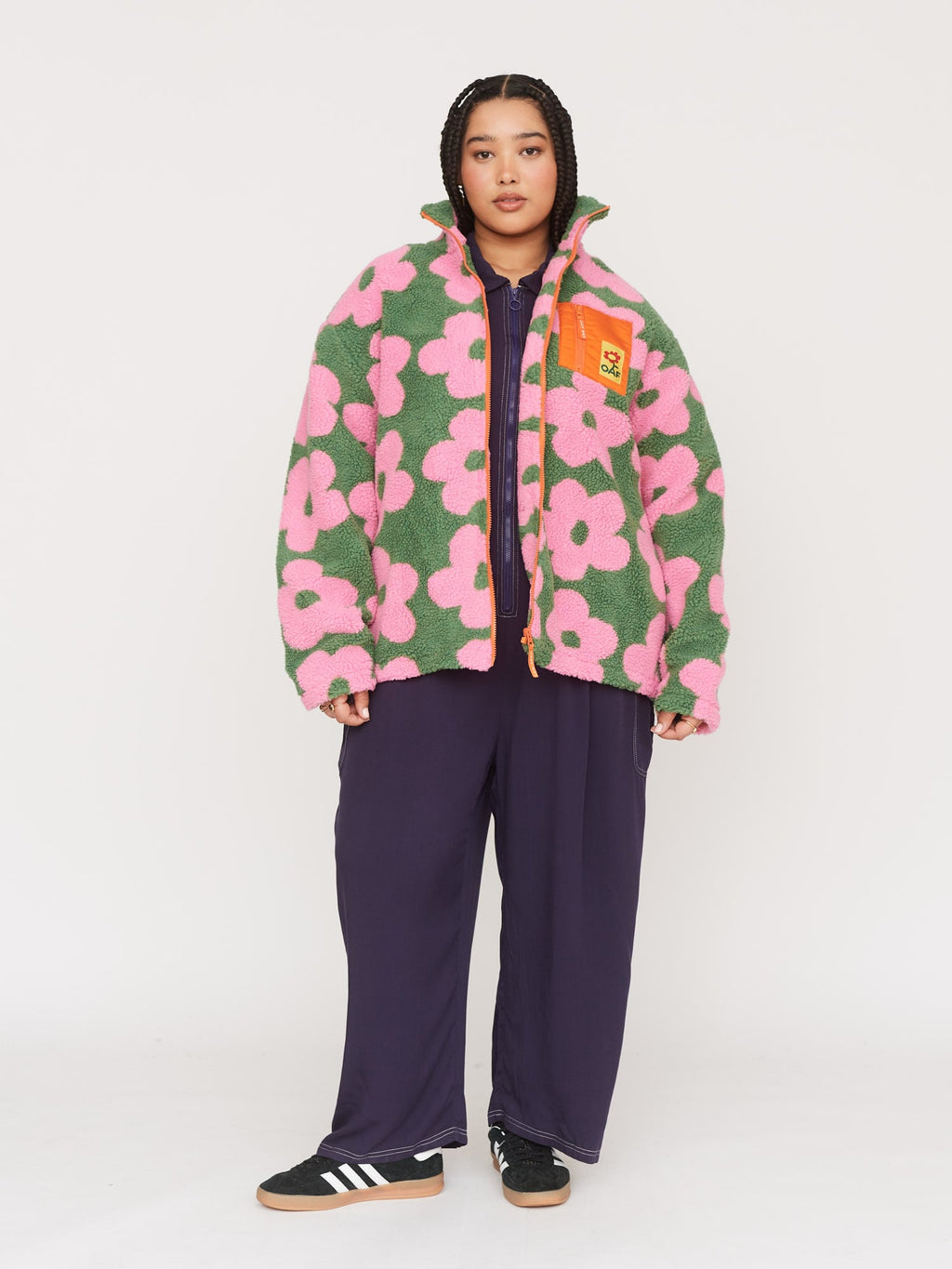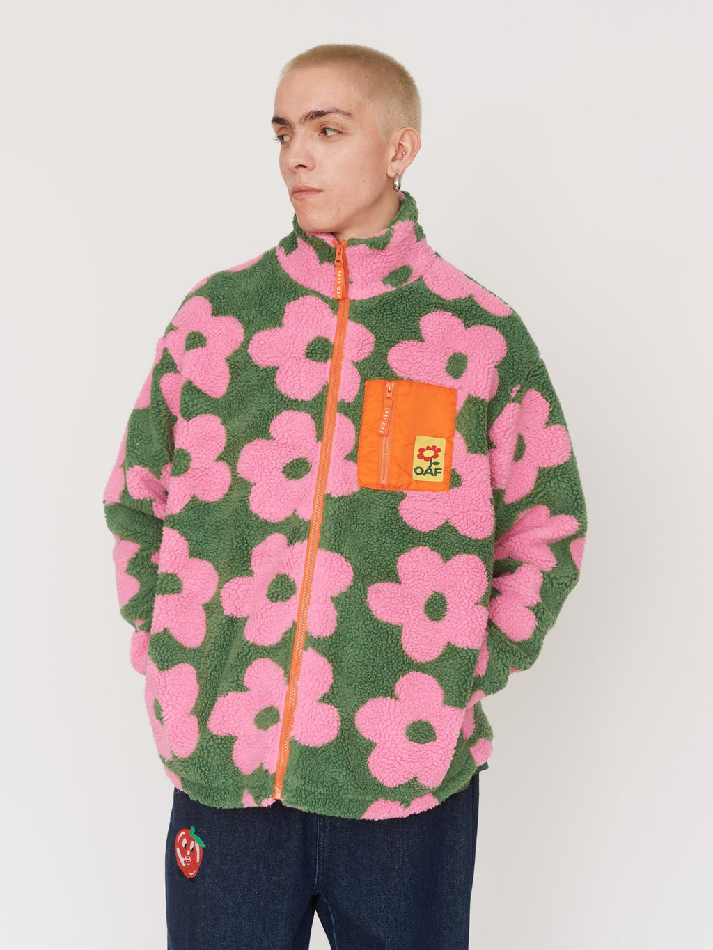 In an all over floral jacquard design, this zip front sherpa fleece is fully lined and has a short funnel neck. On the left of the chest is a contrast zip chest pocket with an Oaf woven patch, along with this pocket there’s two side seam ones.